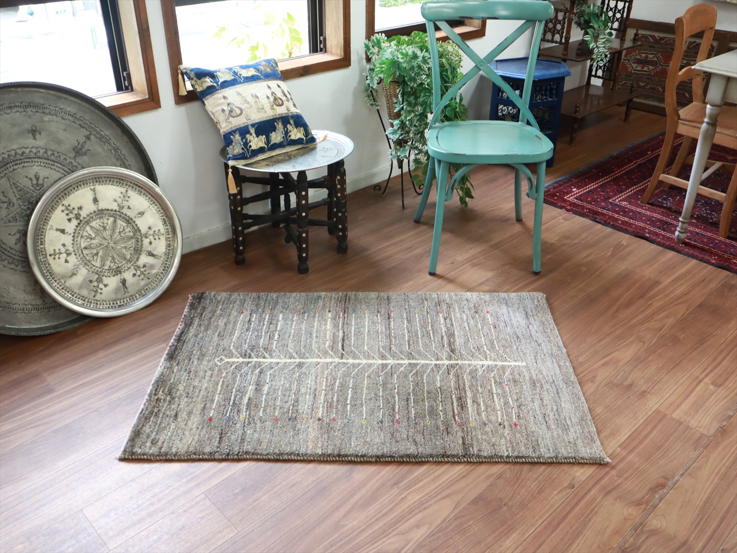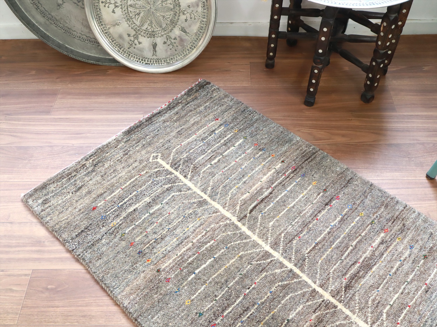 染めていない羊毛の色は、トーンの違うグレーやベージュと混ざって自然な感じのグラデーションが出来上がっています。一枚一枚、色の混ざり具合が異なり、手織りならではの温かみのあるラグです。