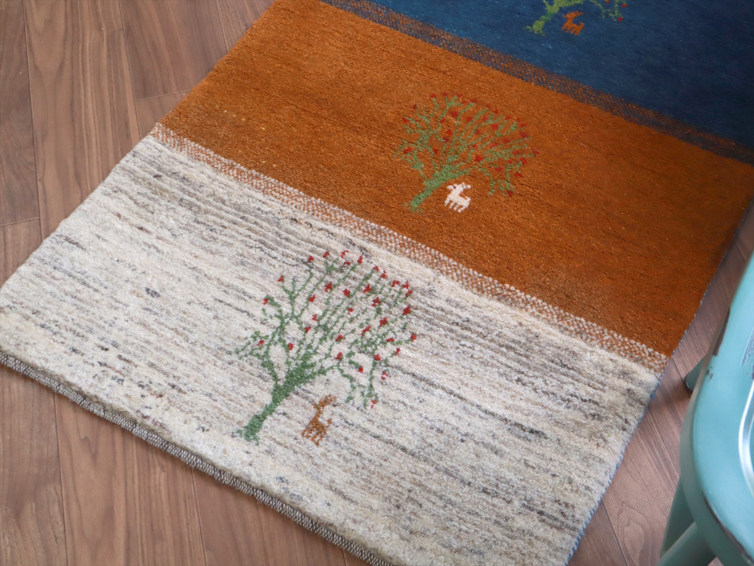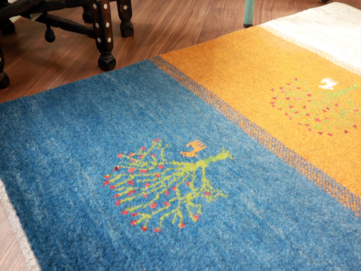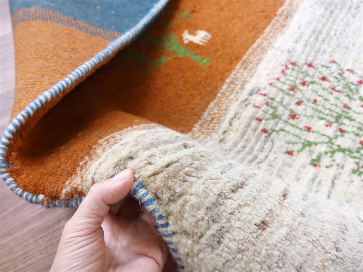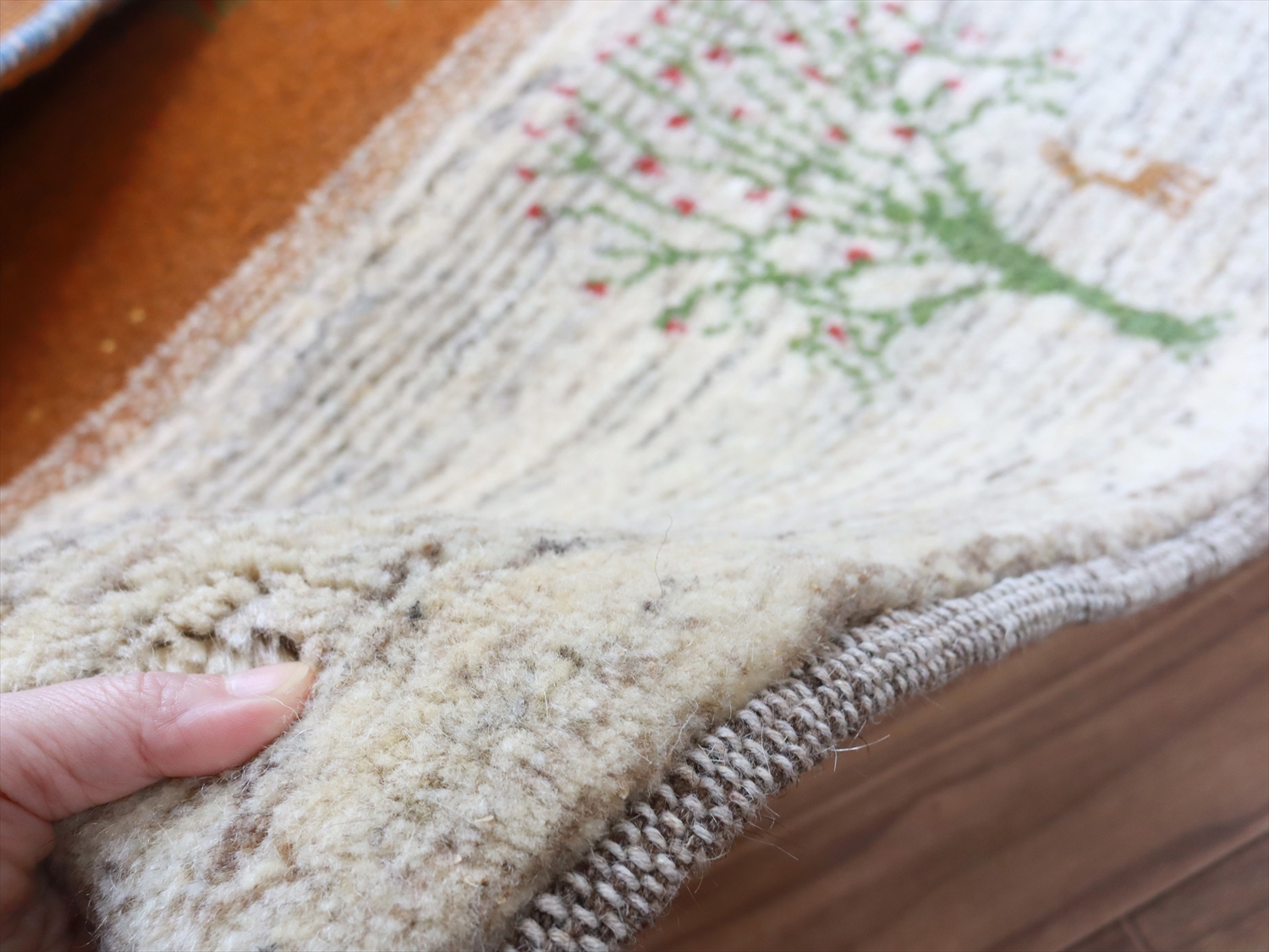 毛足が長く、パイルを含めたギャッベ全体の厚みは2.2-2.3cm程度。ボリューム感たっぷりのふかふかギャッベです。
