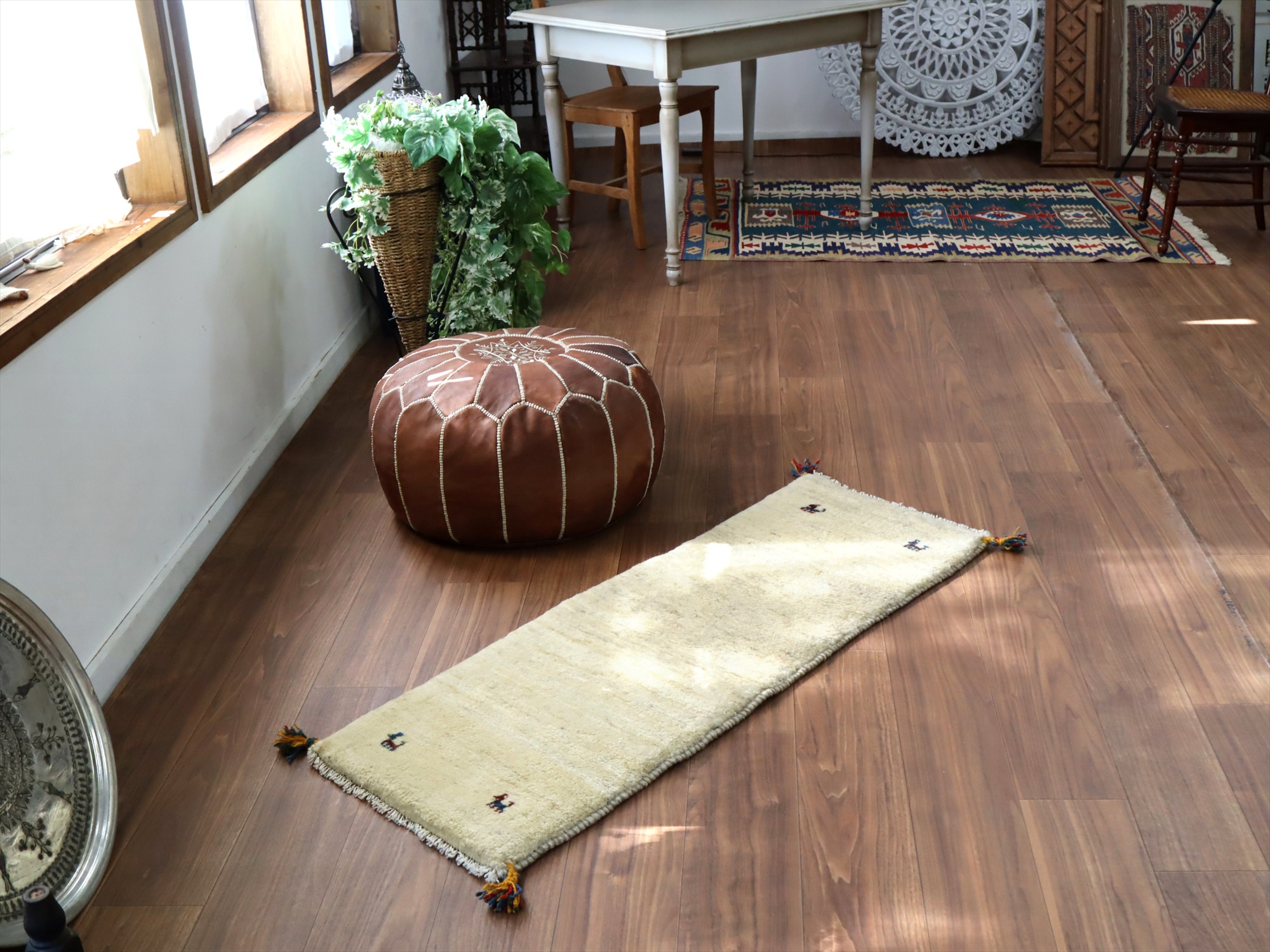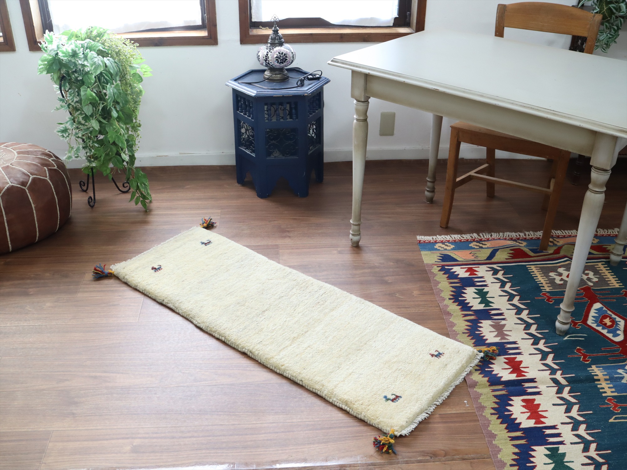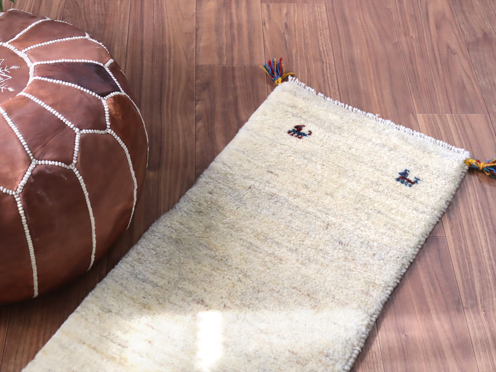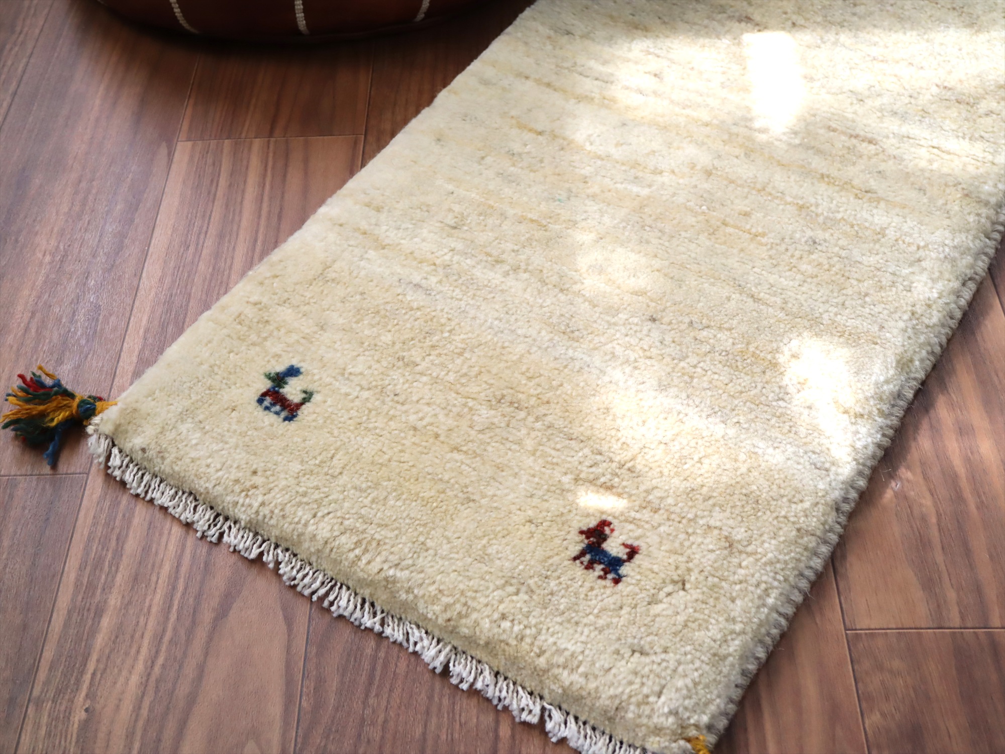 染めていない羊毛を使って織られたシンプルなギャッベ。羊毛の自然な濃淡が出ています。四隅に角のある動物モチーフがはいっています。