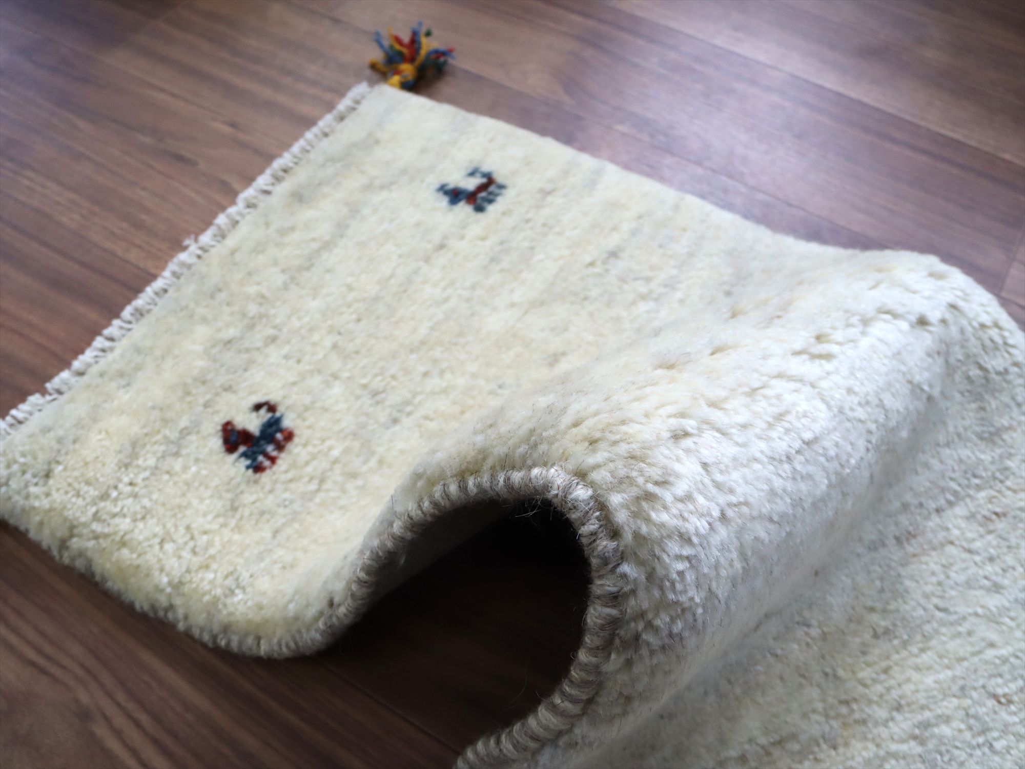 毛足(パイル)が長く、ふかふかとしたボリュームのある織りのギャッベです。ベースを含めたラグ全体の厚みは2cm前後。