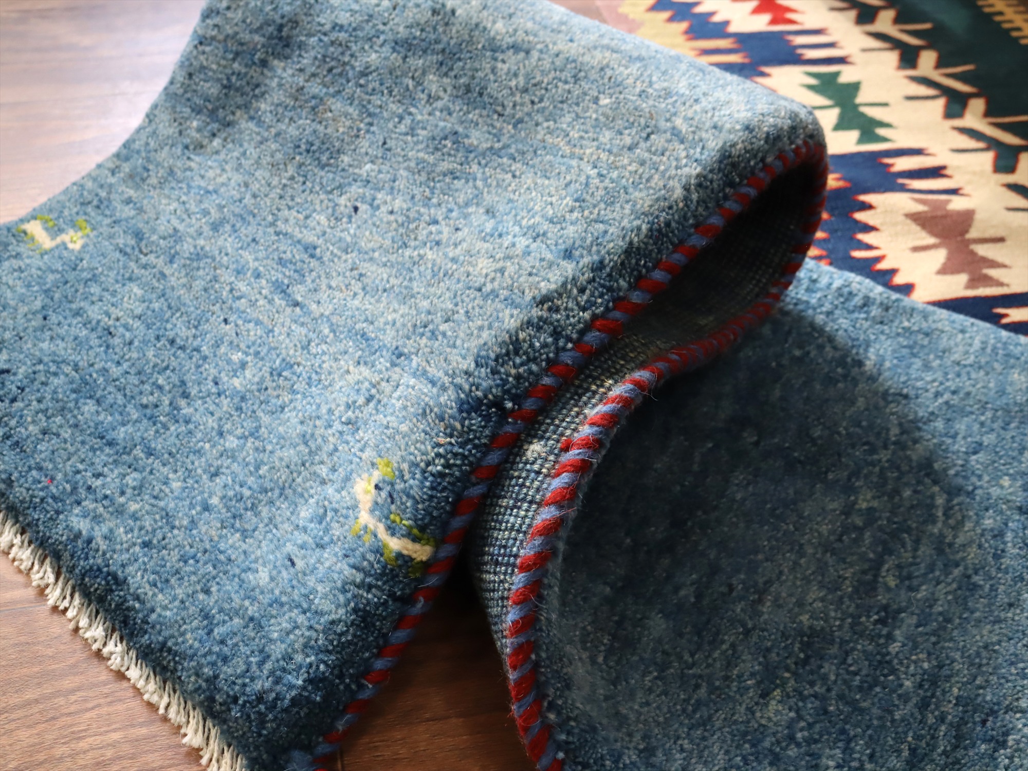 四隅に小さな動物モチーフが織りこまれたシンプルなデザイン。無地部分の紺色は、染めムラによる濃淡が出ていて自然な感じのグラデーションができています。ユニークなのは、向かって上のほうの動物モチーフが上下逆さに織り込まれているところ。(少し端によって切れかかっています)