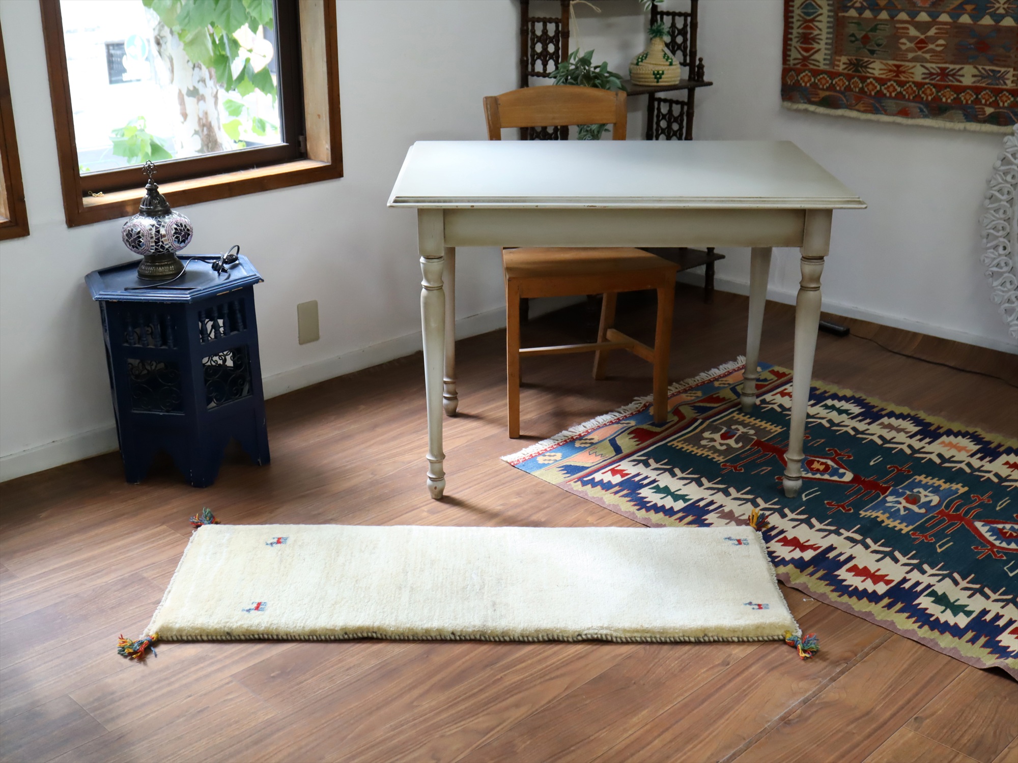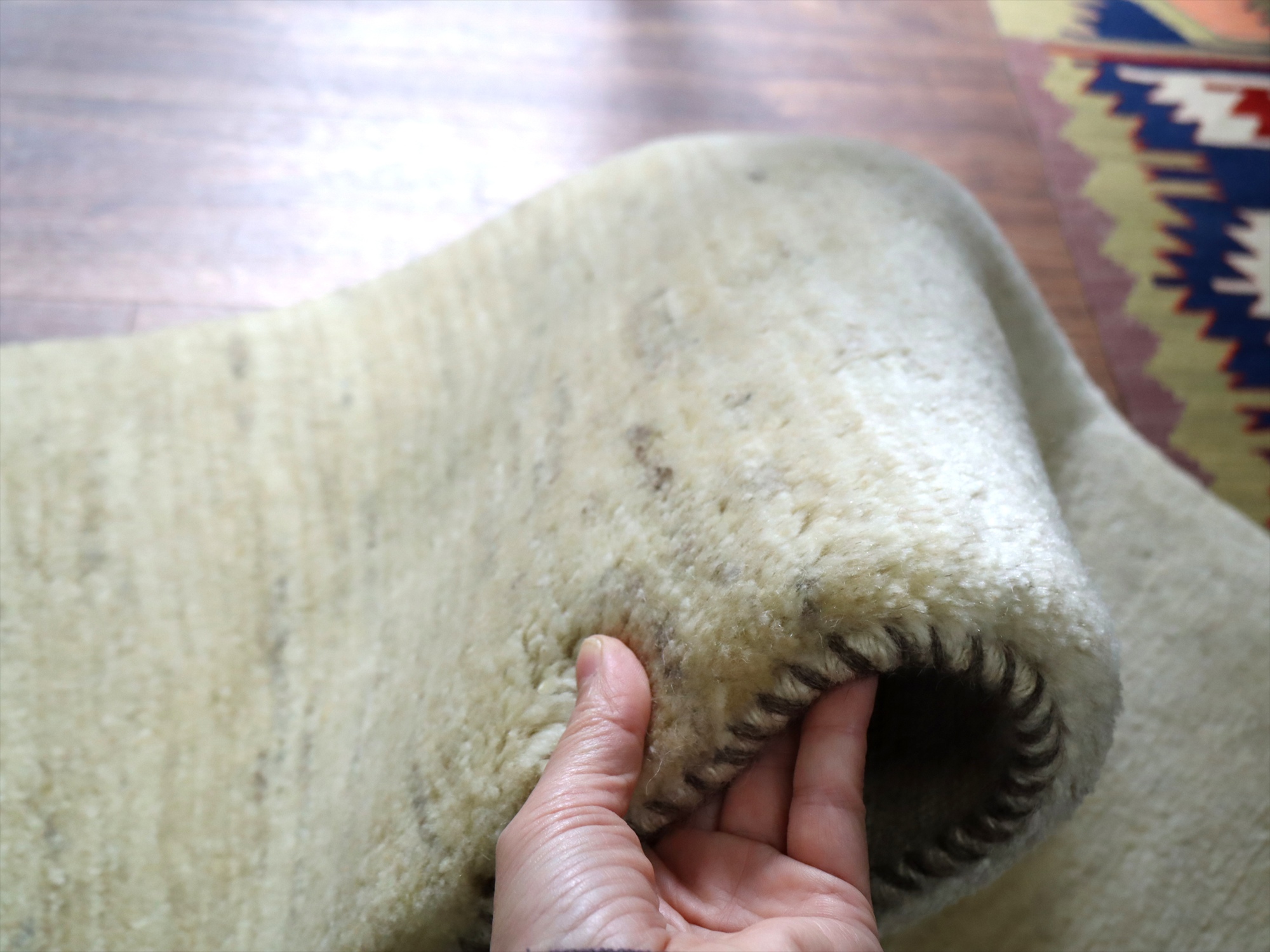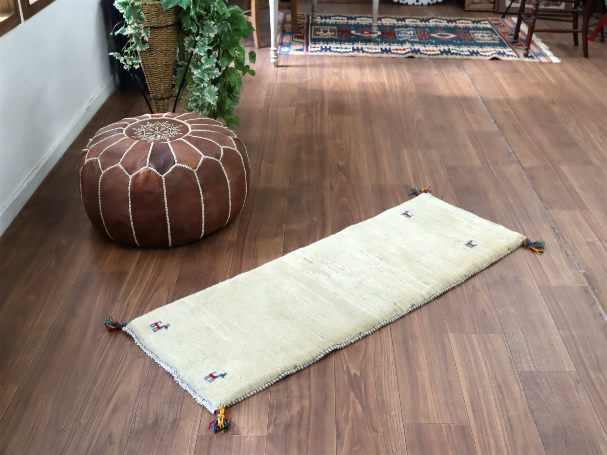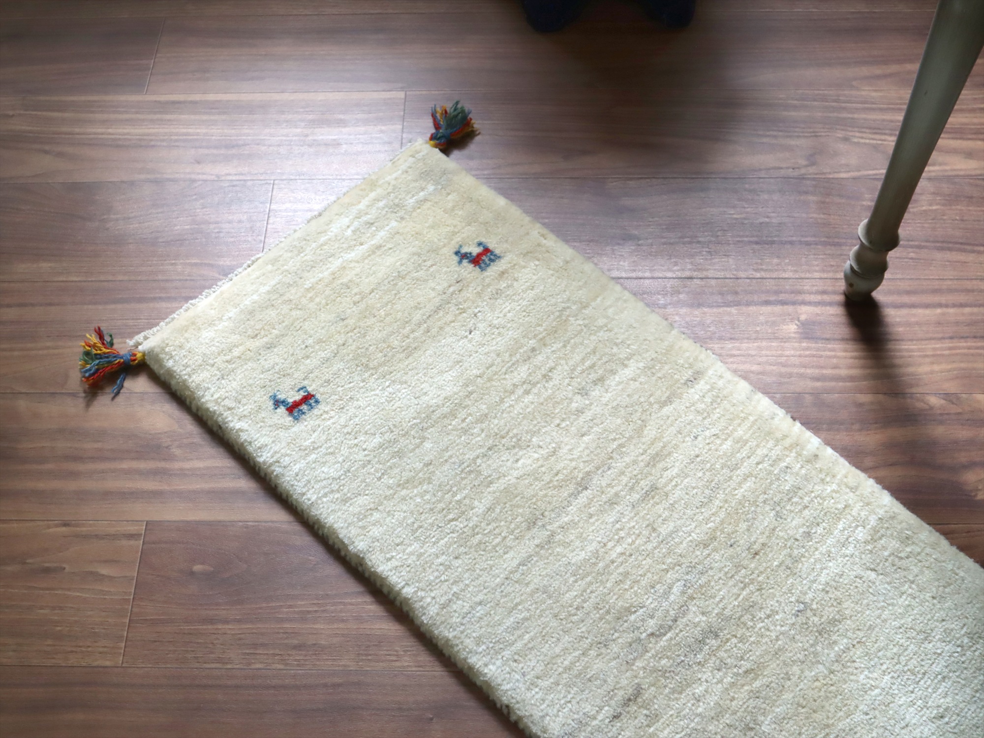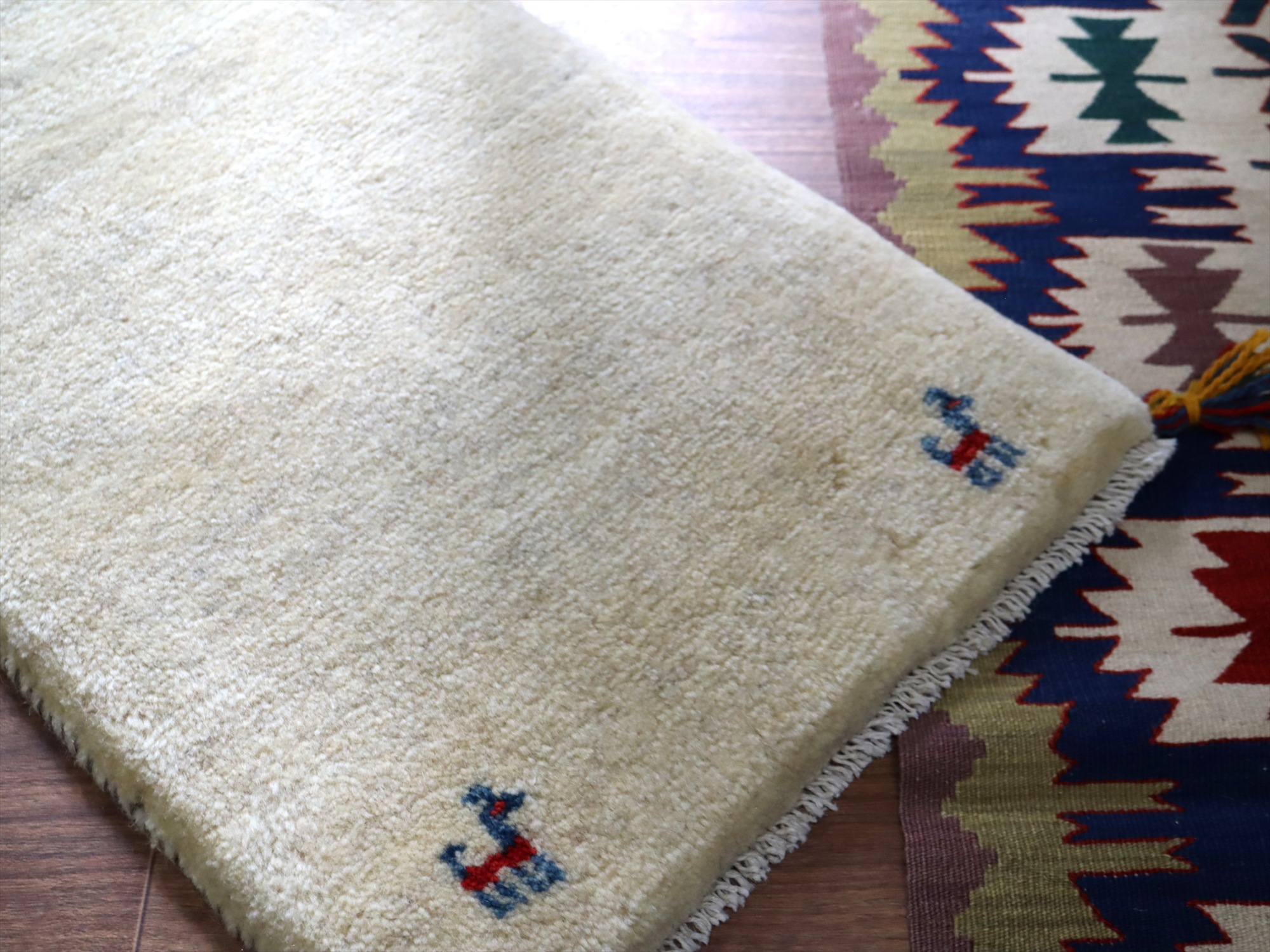 染めていない羊毛を使って織られたシンプルなギャッベ。羊毛の自然な濃淡が出ています。四隅に角のある動物モチーフがはいっています。