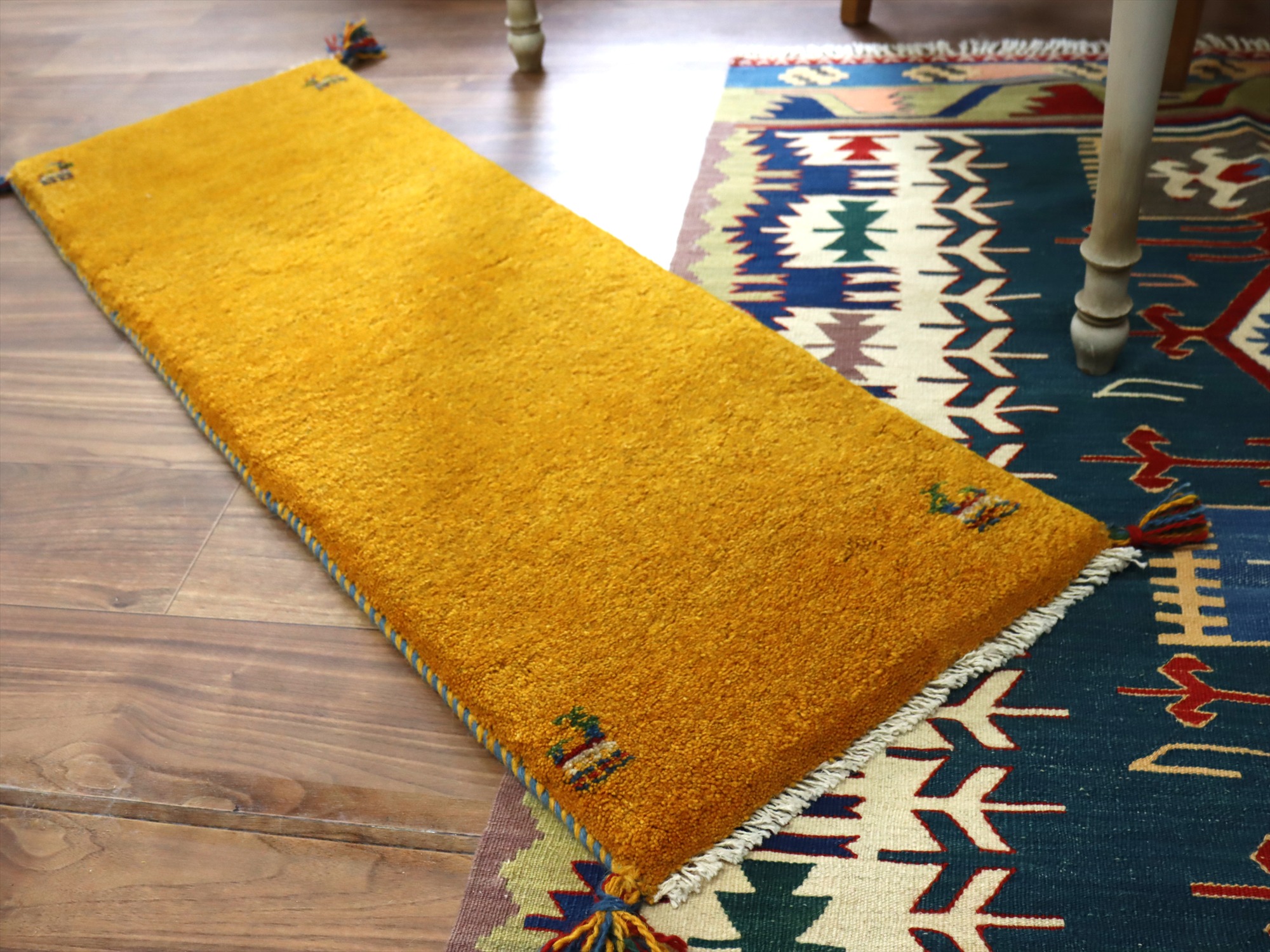 明るいイエローのグラデーションに、動物が入ったギャッベの定番デザイン。