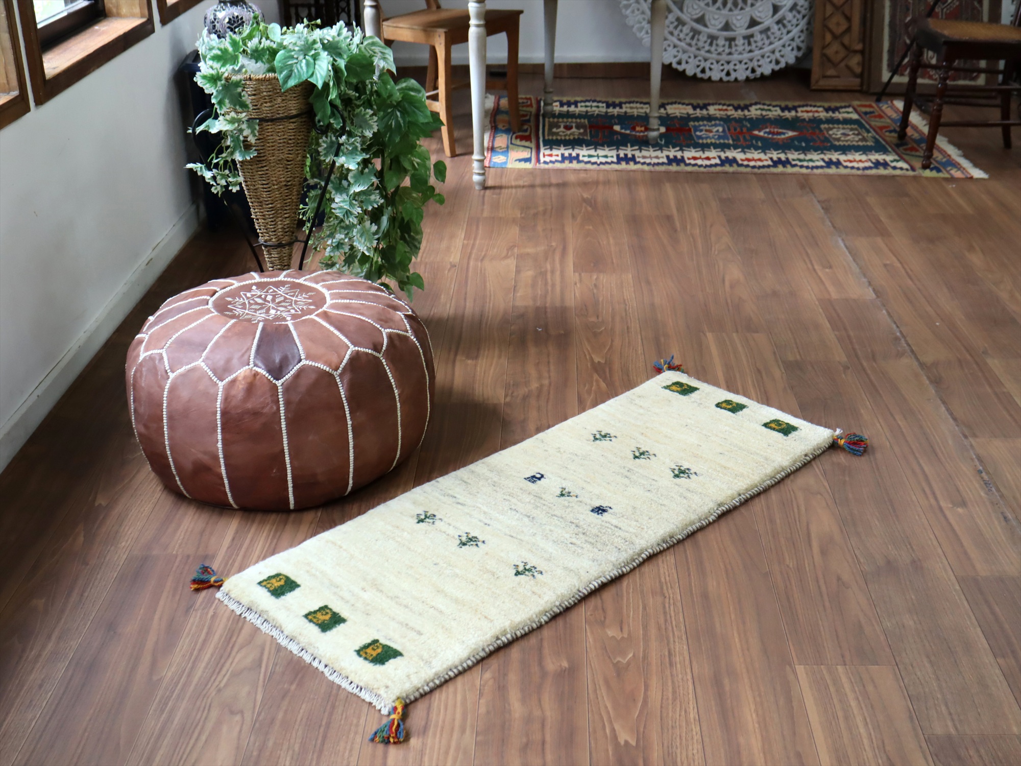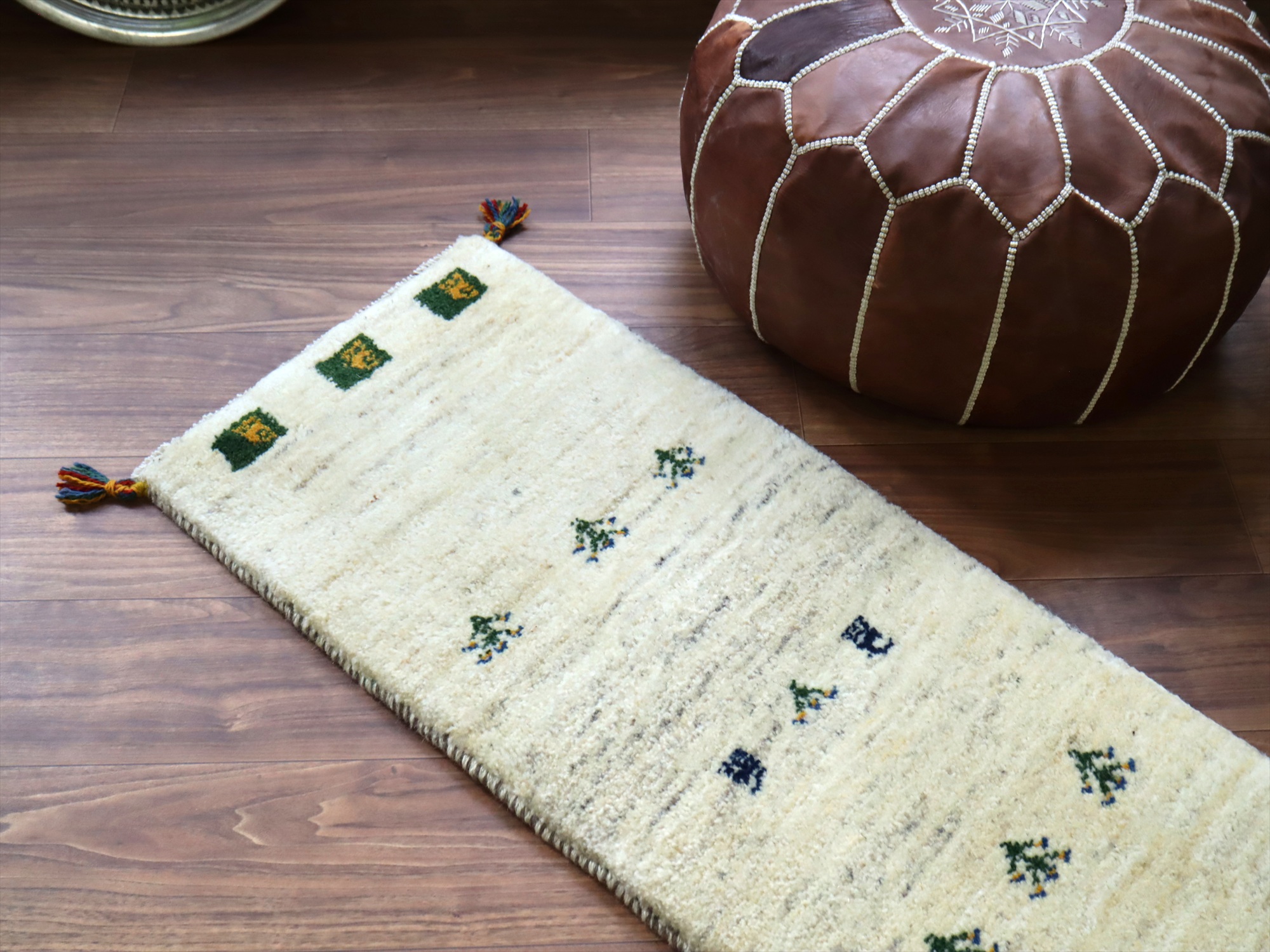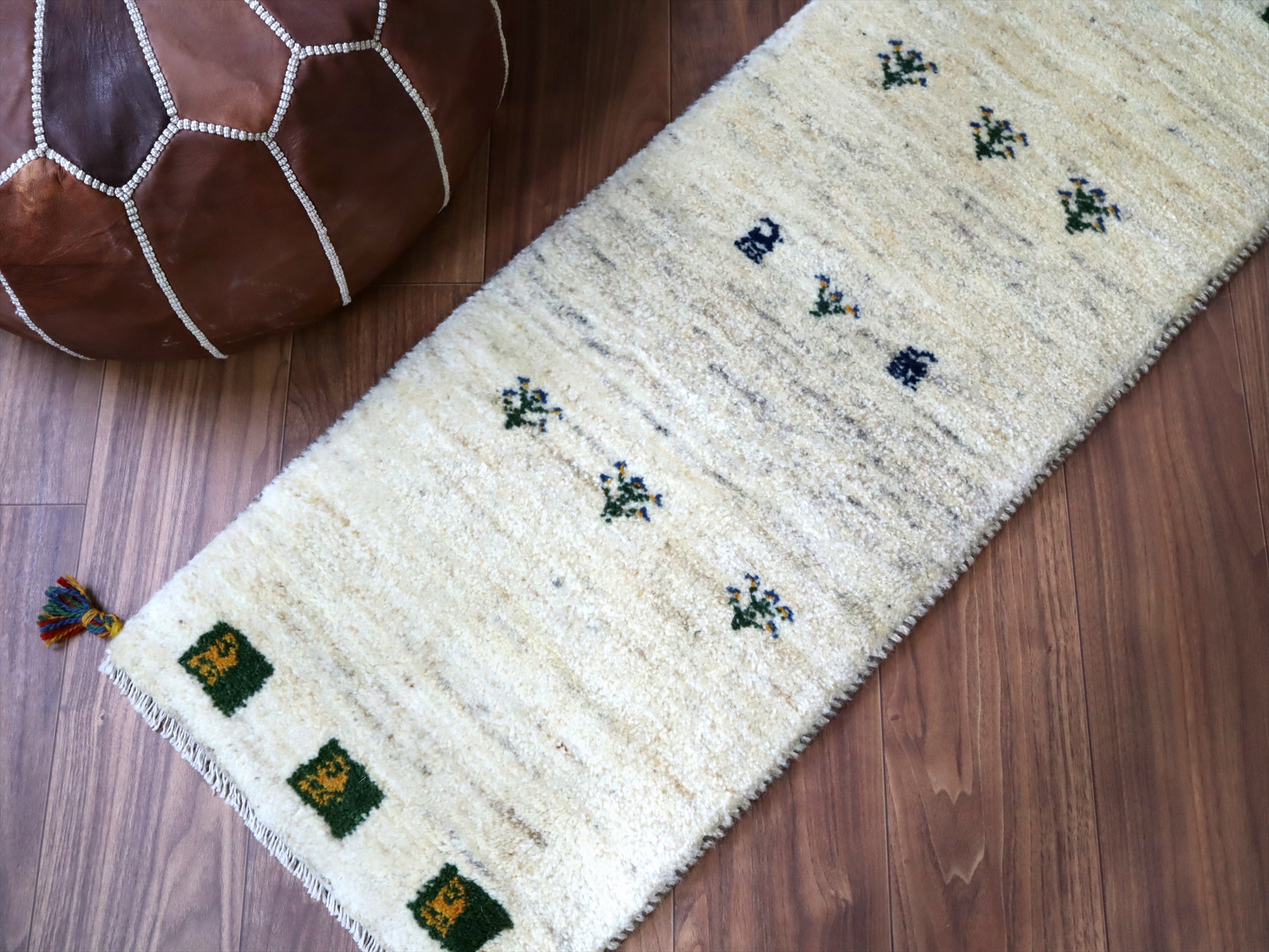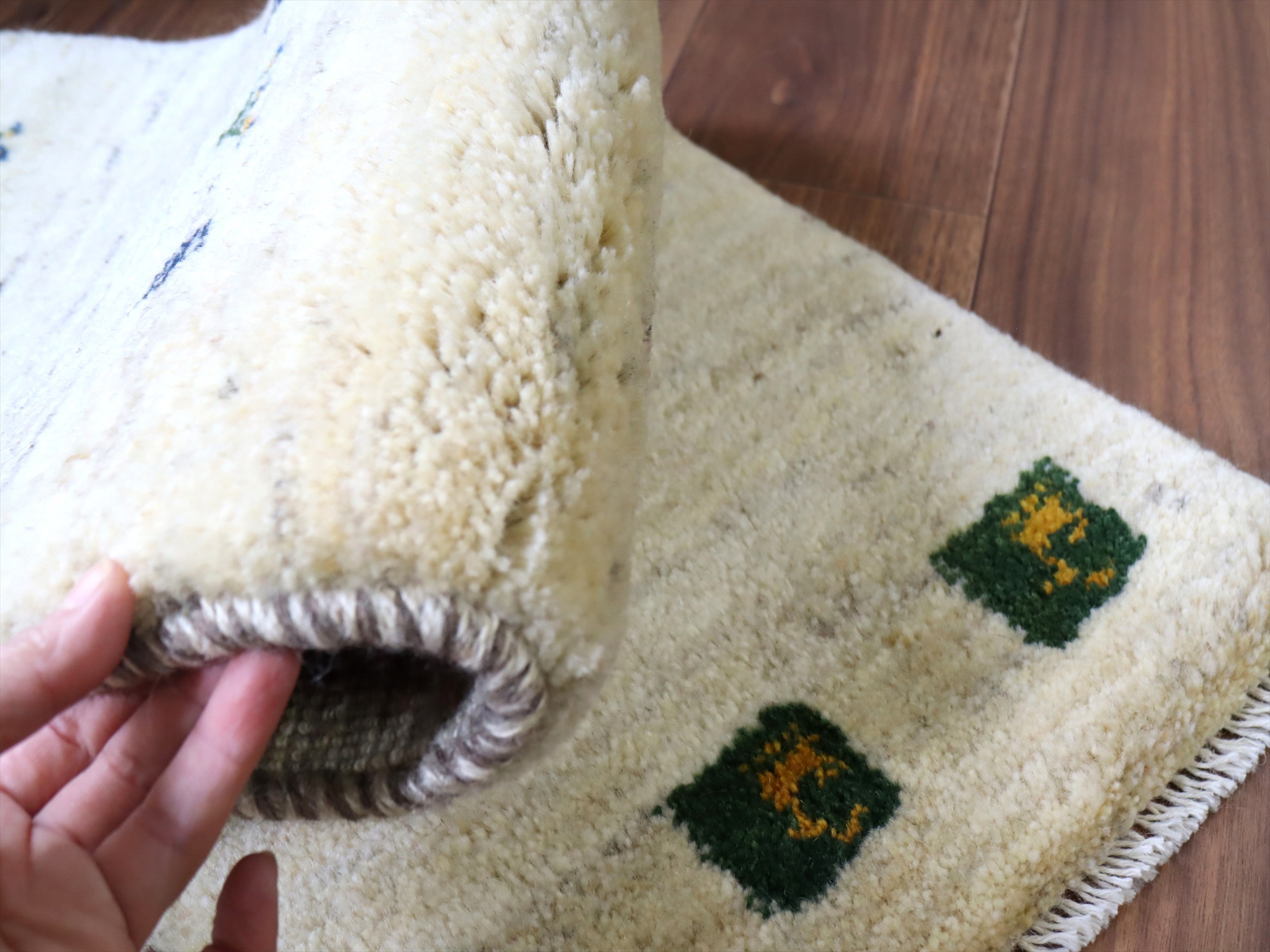 毛足が長くボリュームあるふっくらとした織り地のギャッベ。パイル(毛足)を含めた厚みは2.3-2.4cmほどで、分厚いという表現がぴったりの手織り絨毯です。