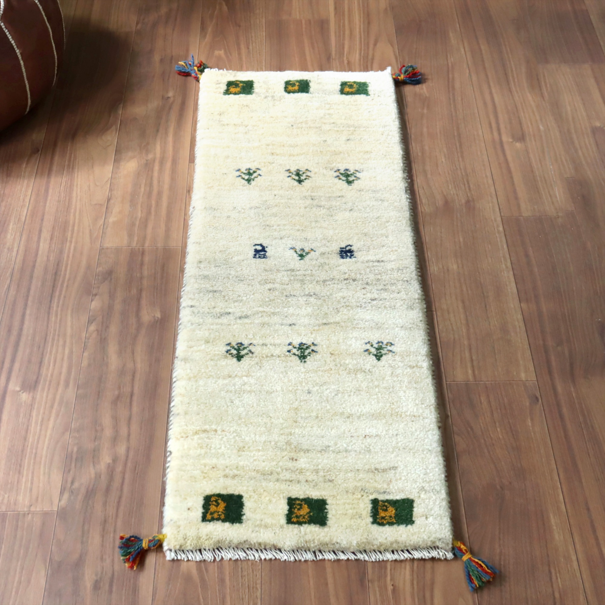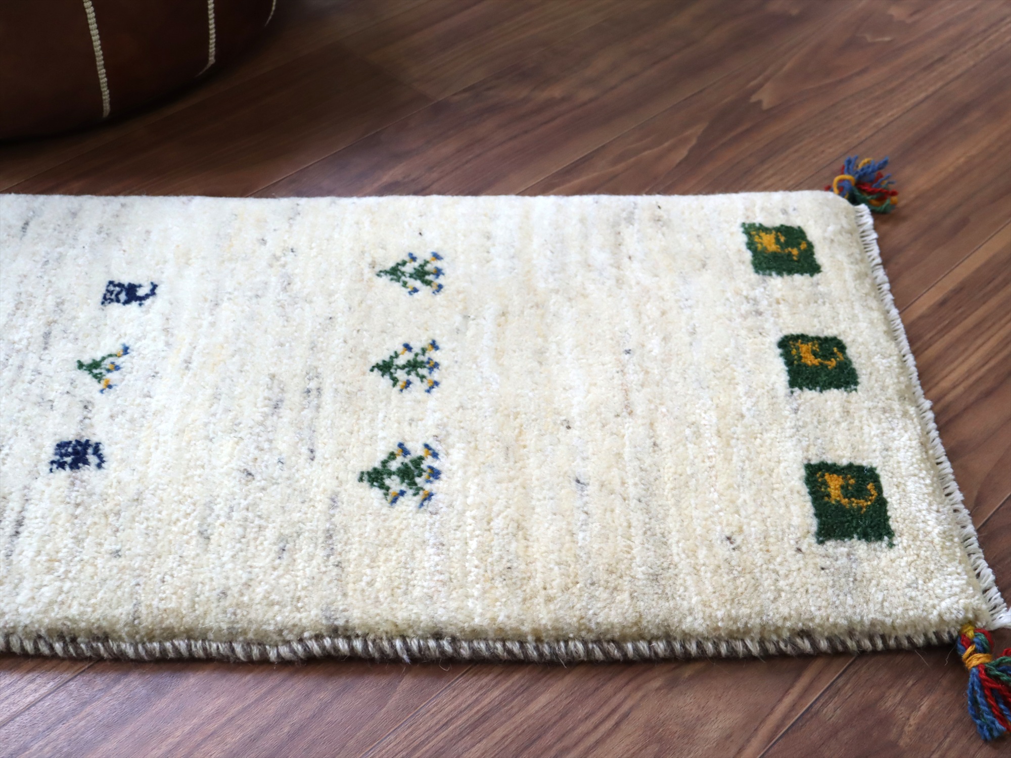 ベースのアイボリー色は、天然の羊毛が染色されずにそのまま使われていて、ベージュやグレーの部分など自然な濃淡が出ています。上下のグリーンのタイルモチーフの中には、動物のモチーフが織り込まれ、なぜかみんな中心から左によっている??ユニークな一枚です。