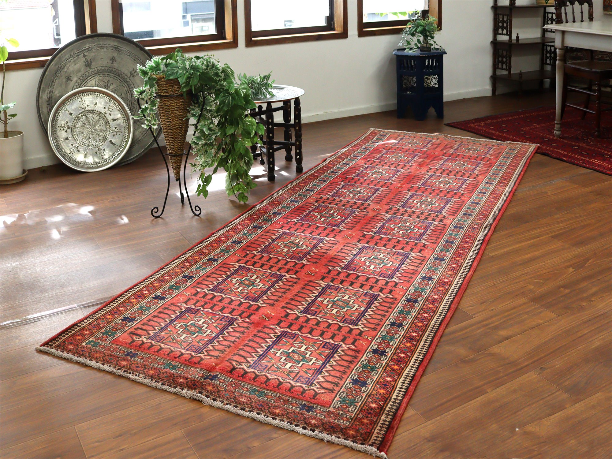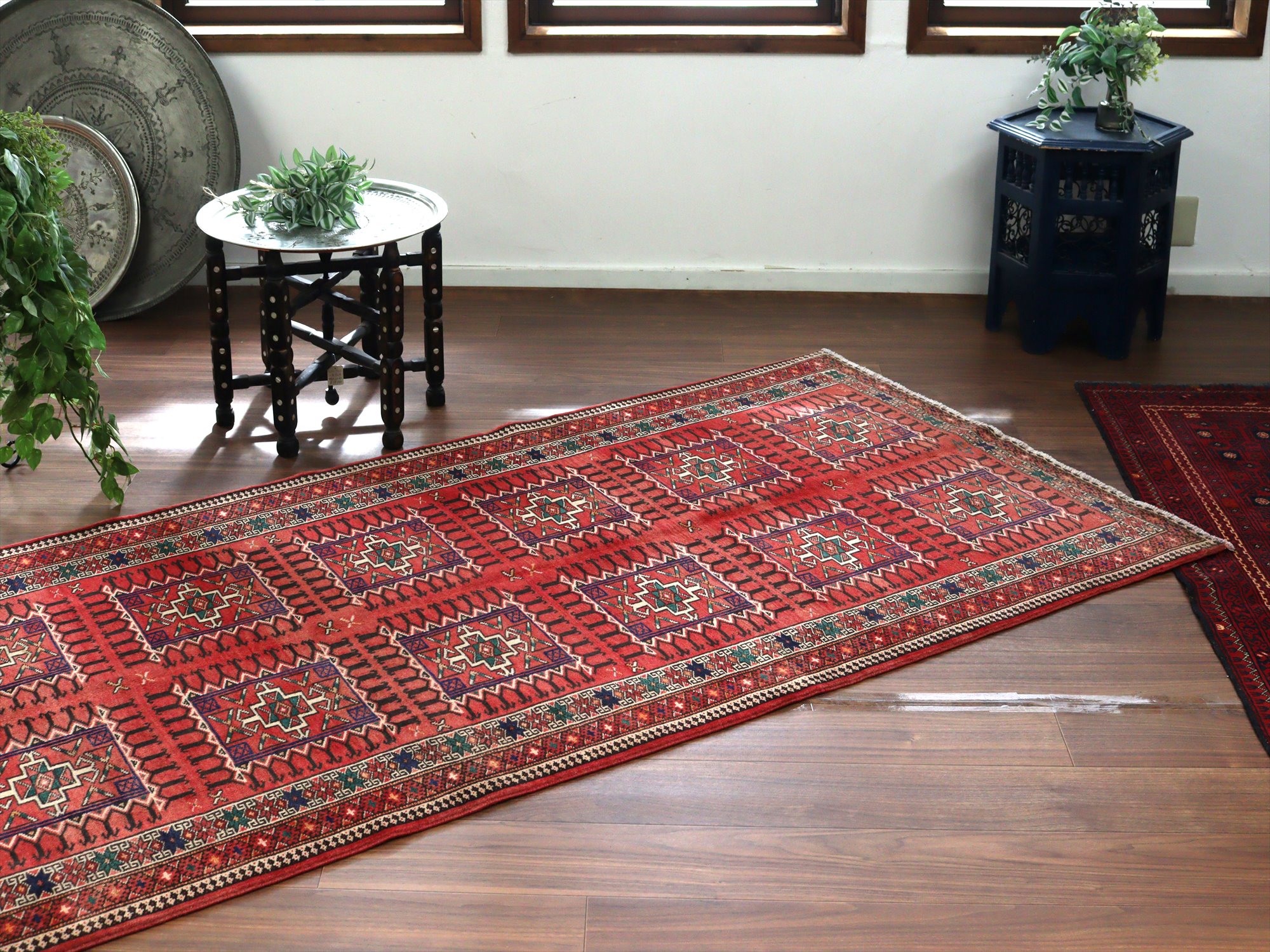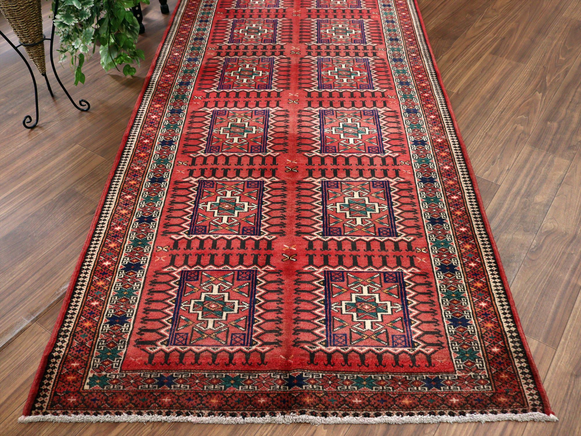 イランの手織りラグ トルクメン291×111cm 細長いサイズ 幾何学模様
