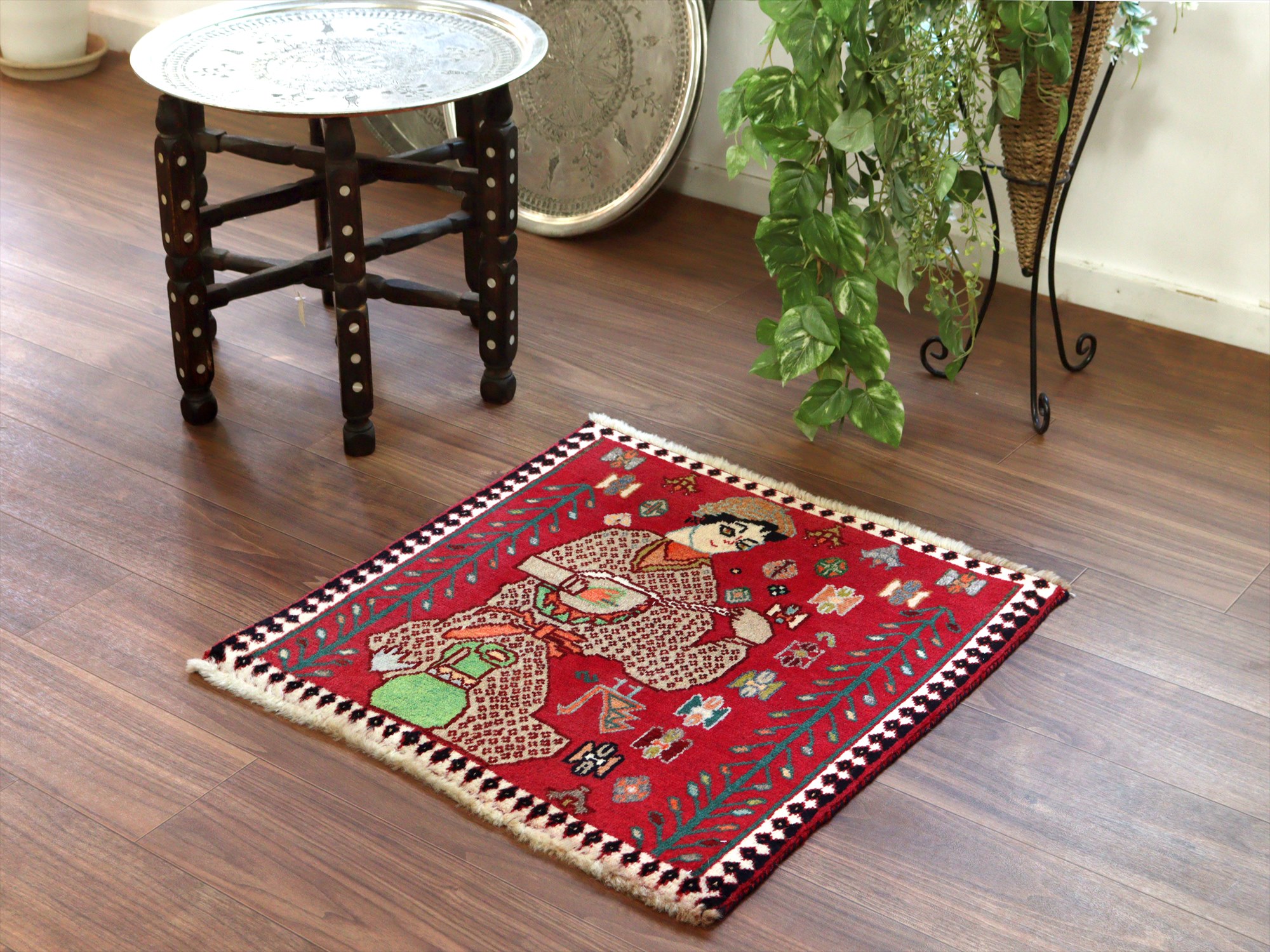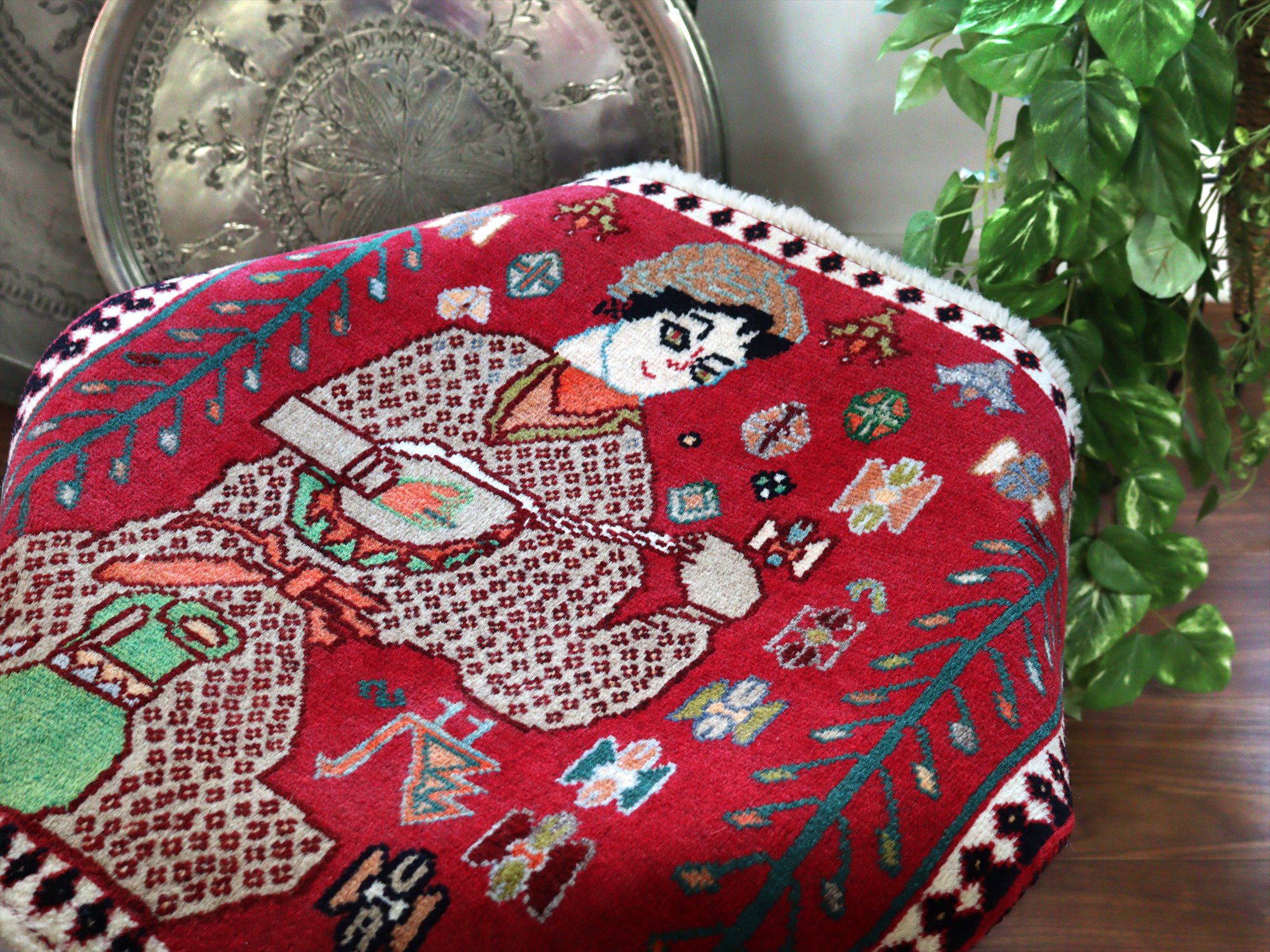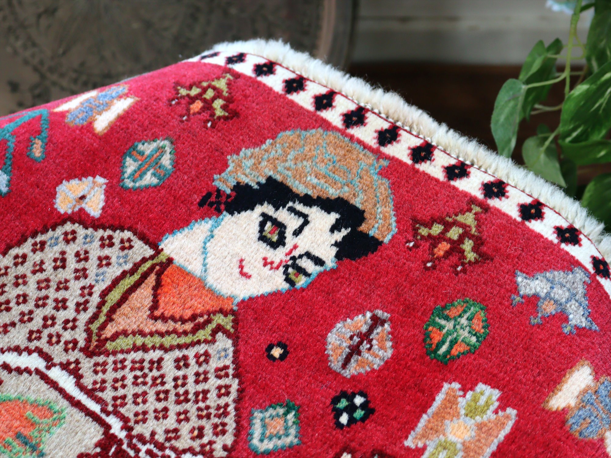 カシュカイ族の手織りラグ62×62cm 楽器を弾く女性