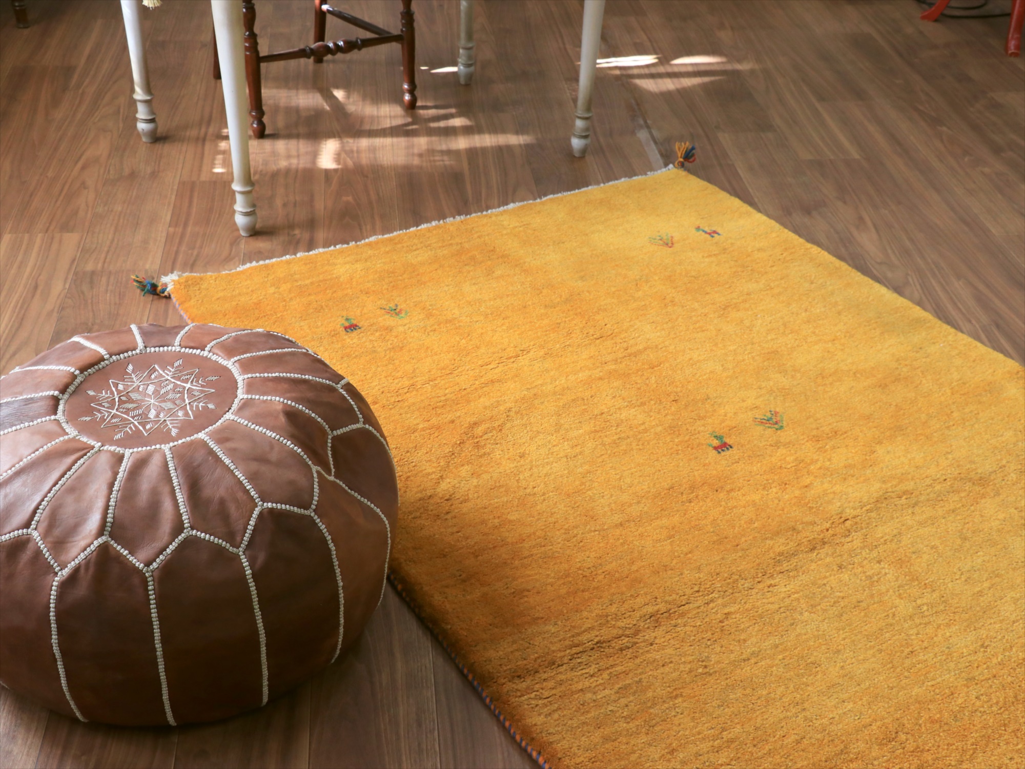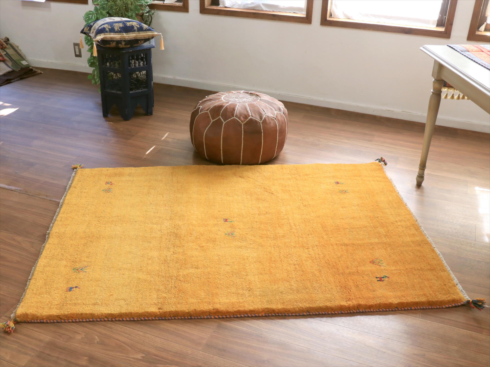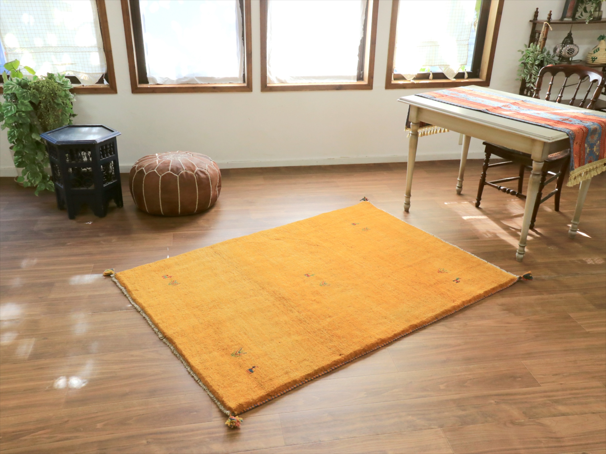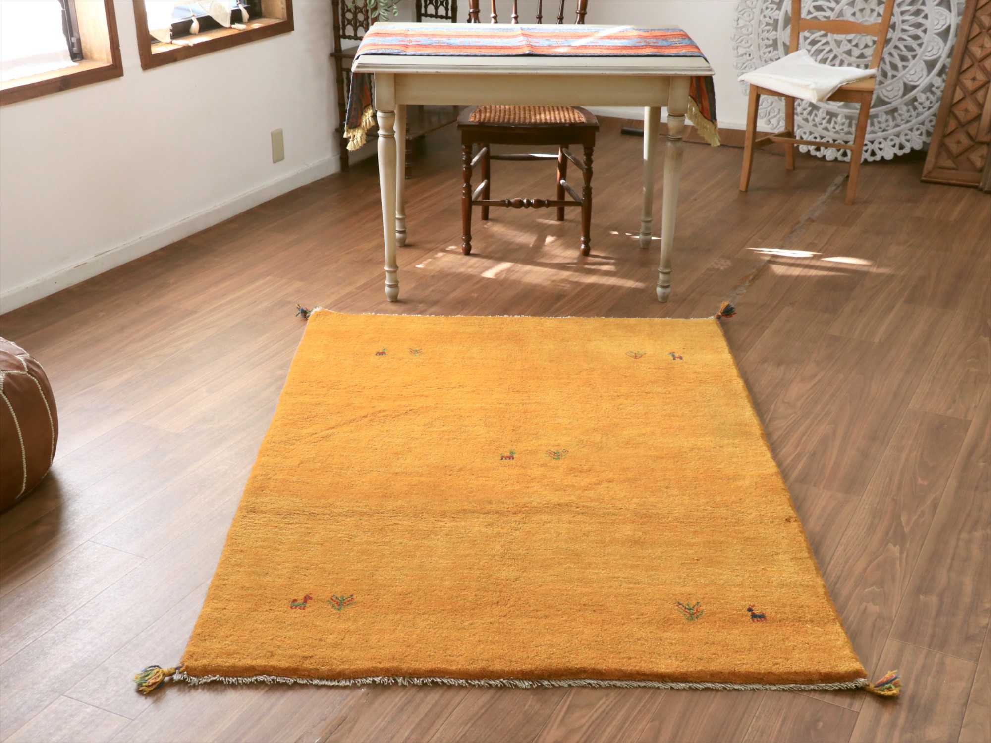 中央と四隅に動物と植物のモチーフが織り込まれた、伝統的なスタイルのシンプルなギャッベ。明るくオレンジがかったイエローで、温かみのある雰囲気です。