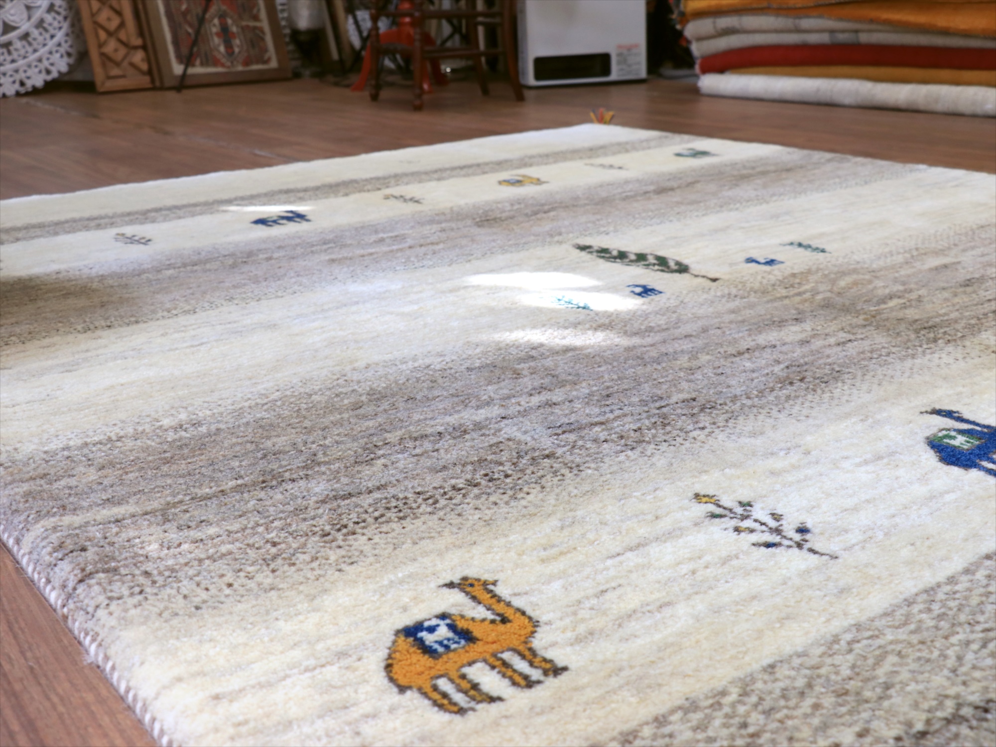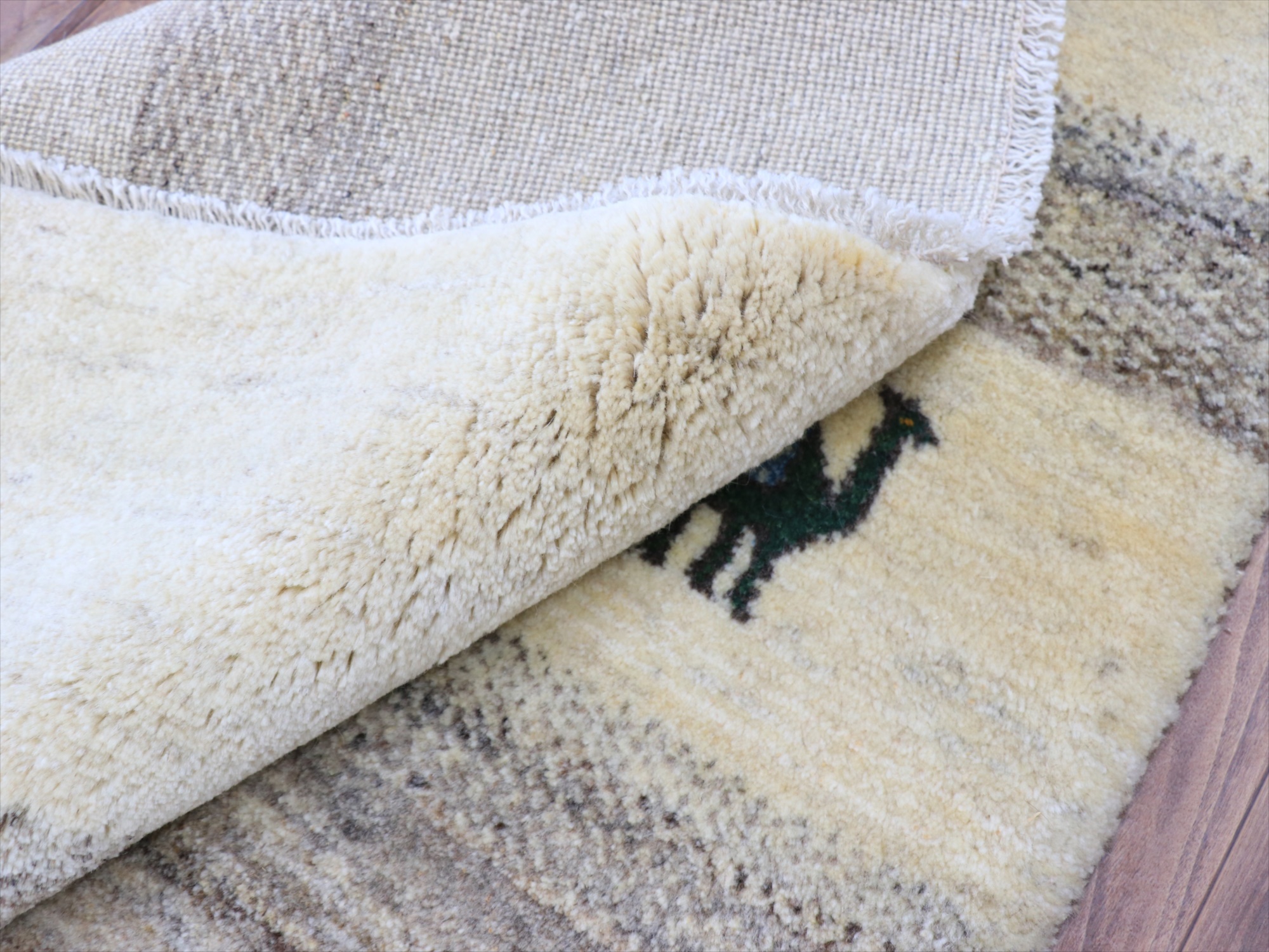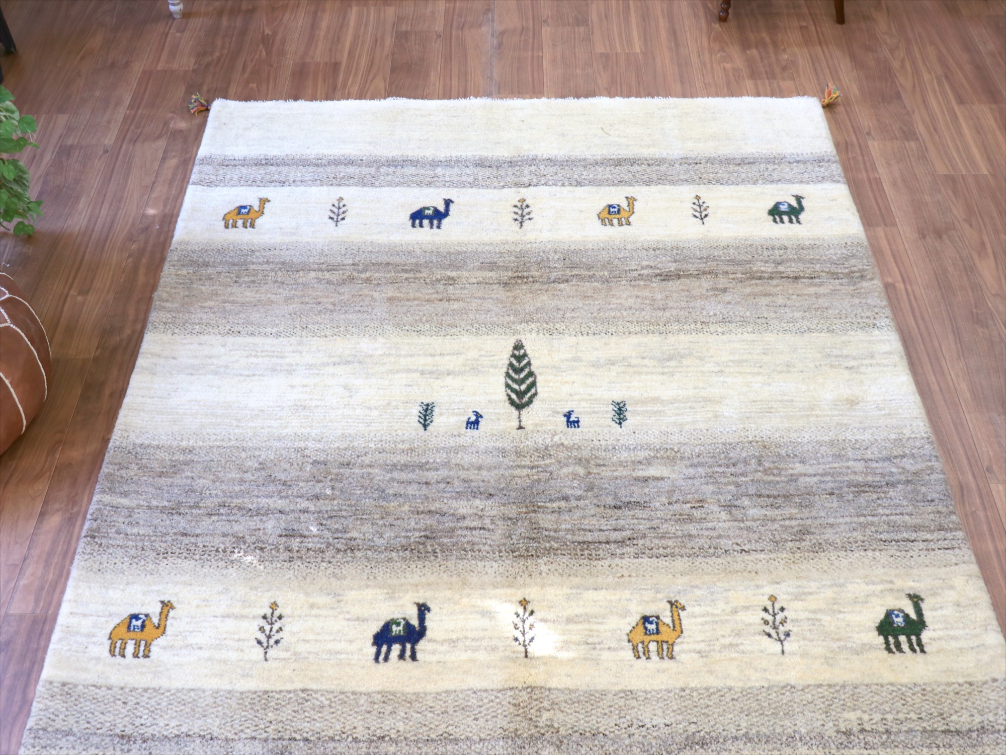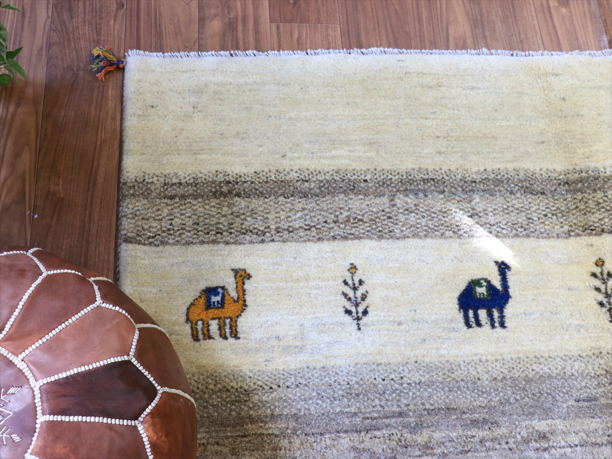 染めていない天然の羊毛の色をいかして織られたアイボリーとグレーのギャッベです。中央には木の葉のような生命の木と小さな動物たち、上下には鞍をのせたラクダのキャラバンが織り込まれています。
