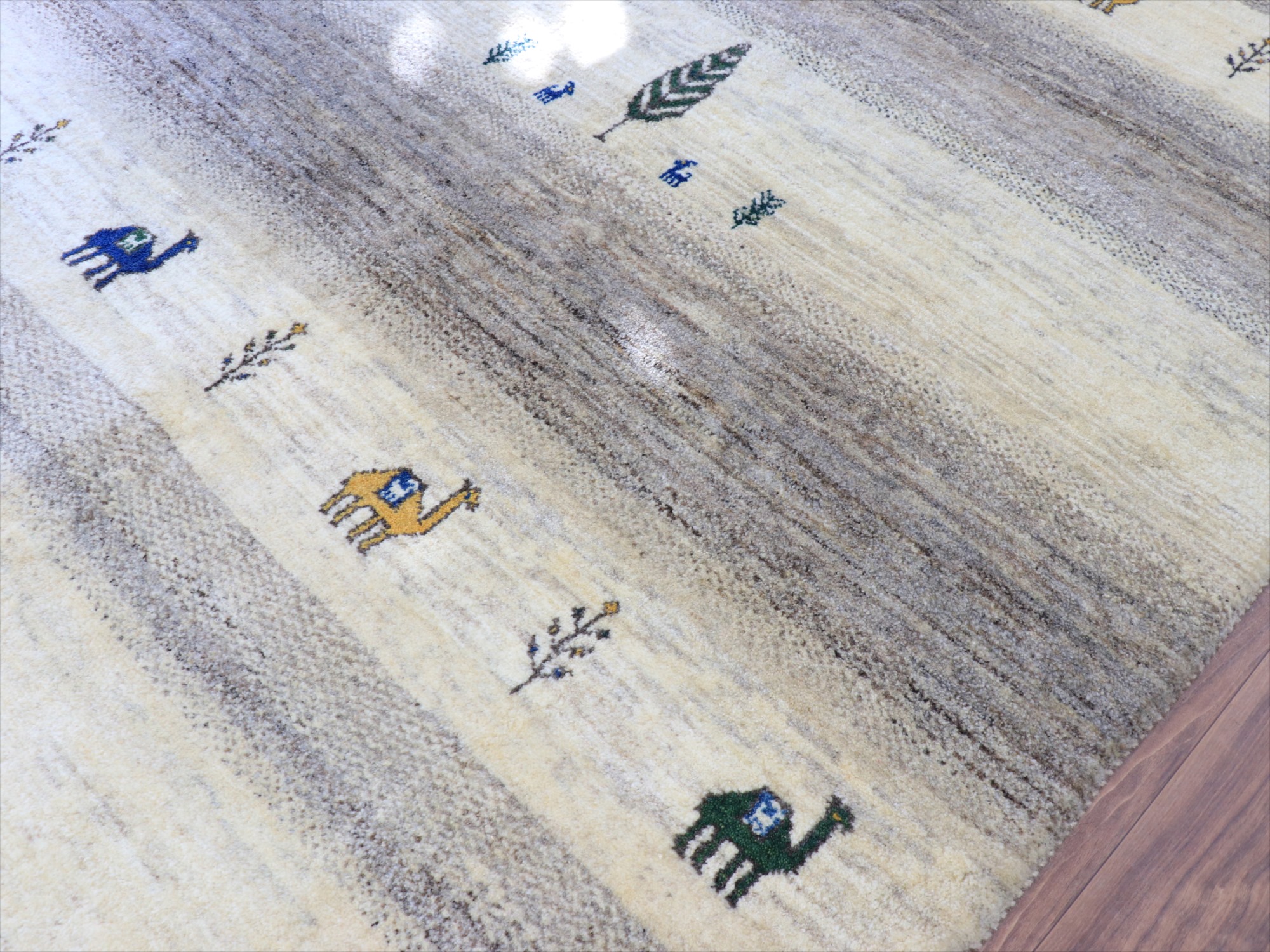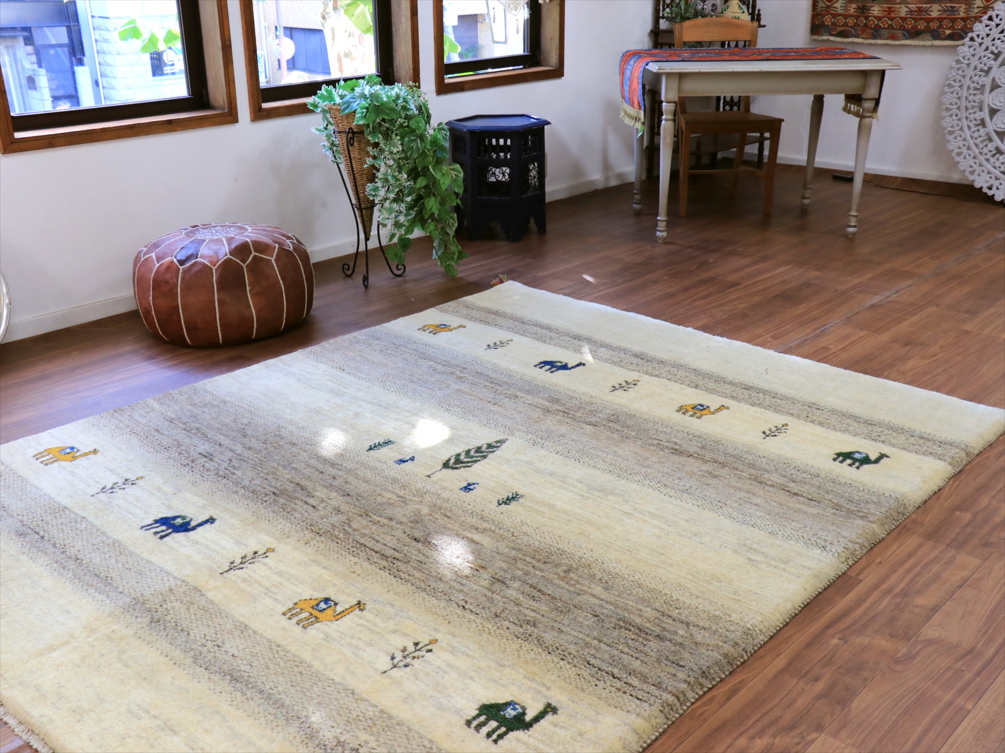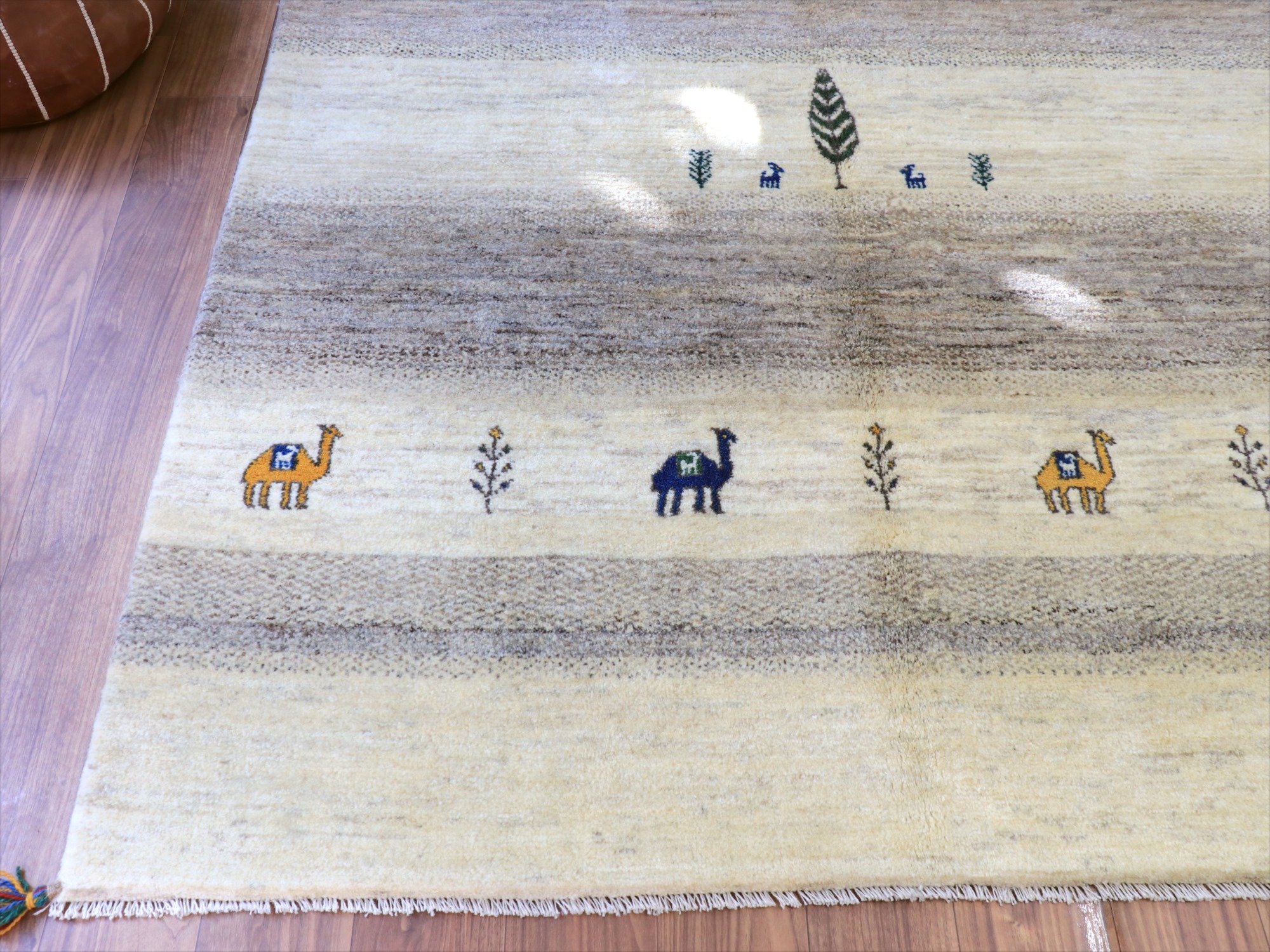 染めていない天然の羊毛の色をいかして織られたアイボリーとグレーのギャッベです。中央には木の葉のような生命の木と小さな動物たち、上下には鞍をのせたラクダのキャラバンが織り込まれています。
