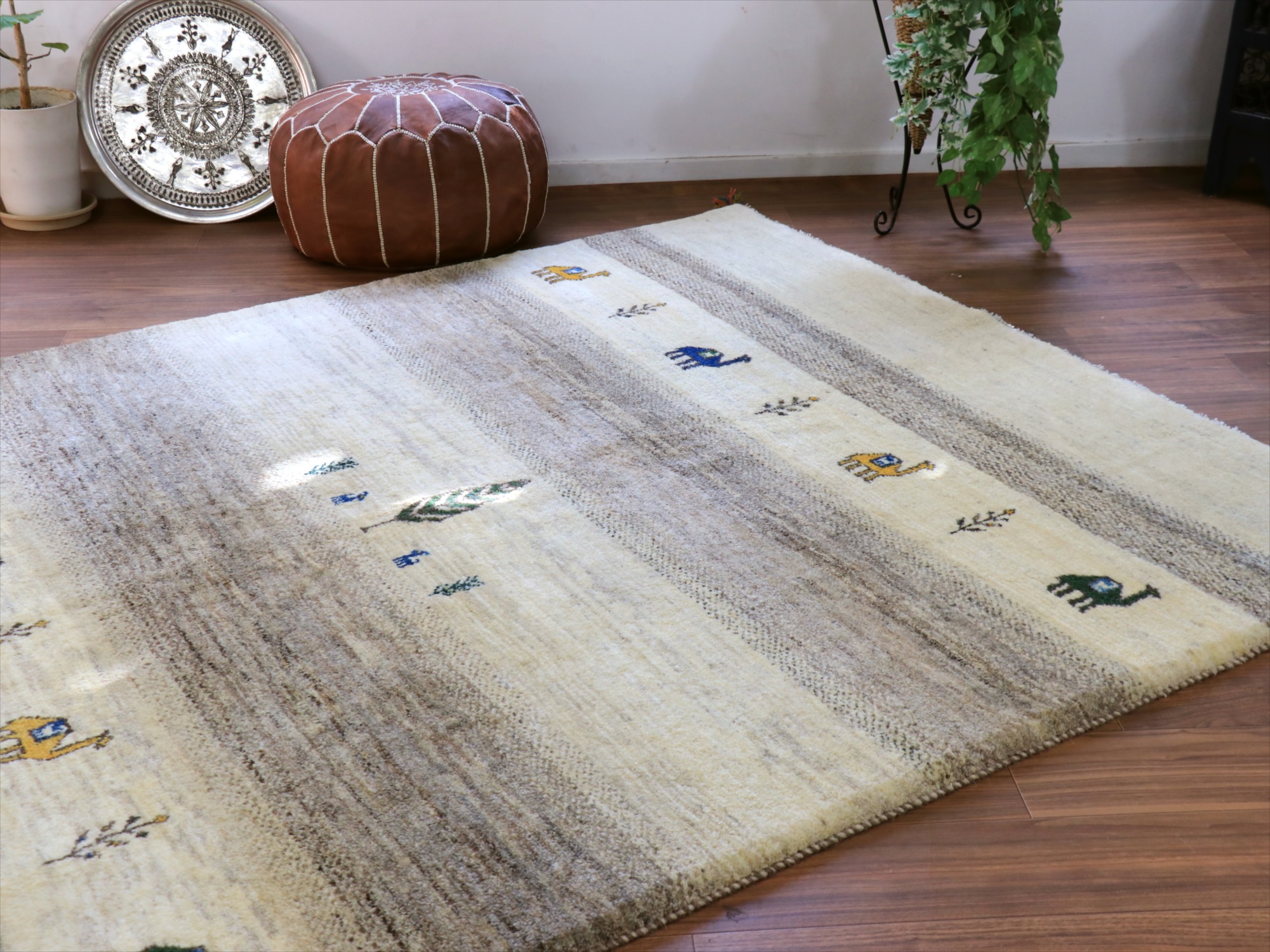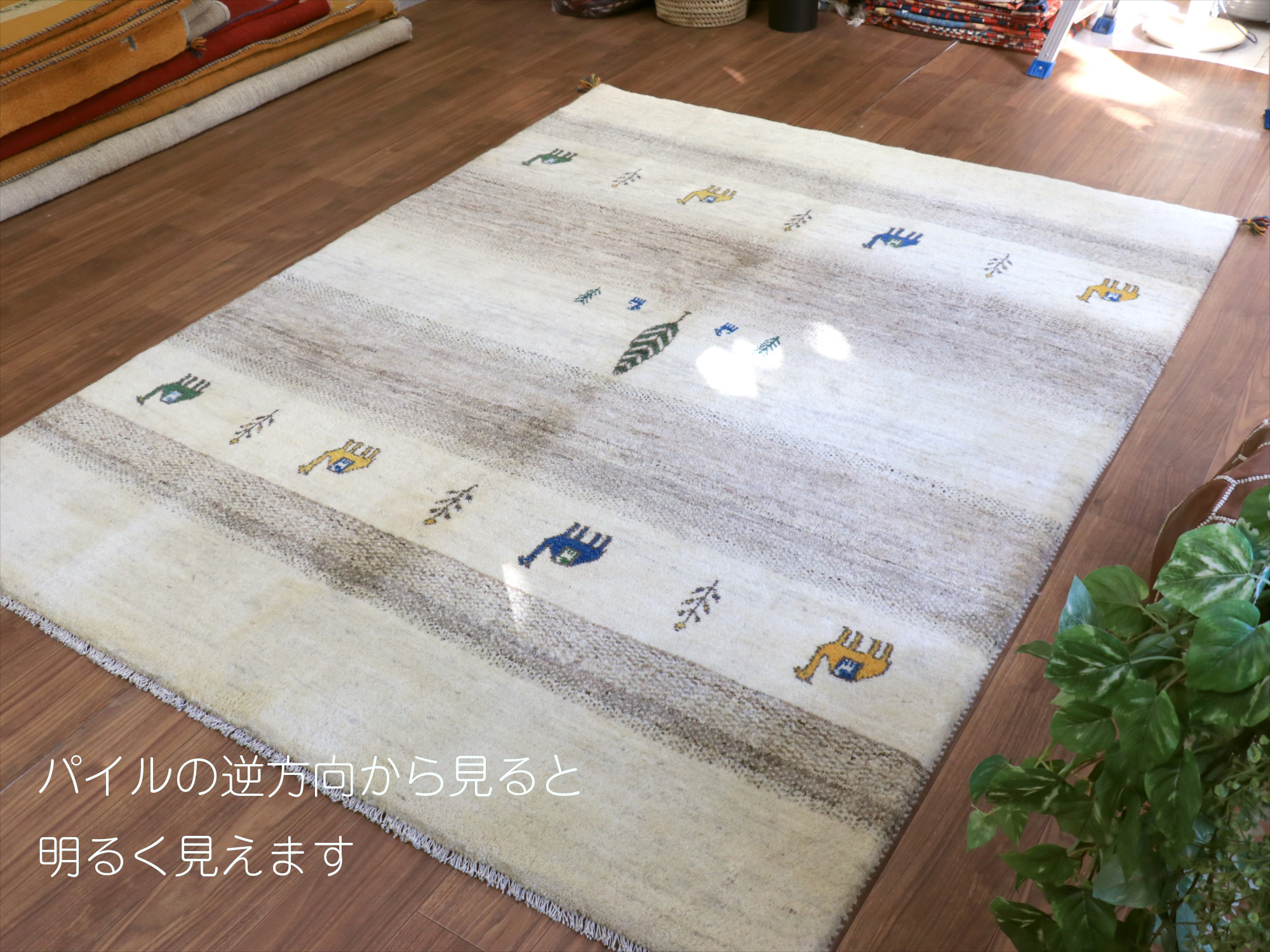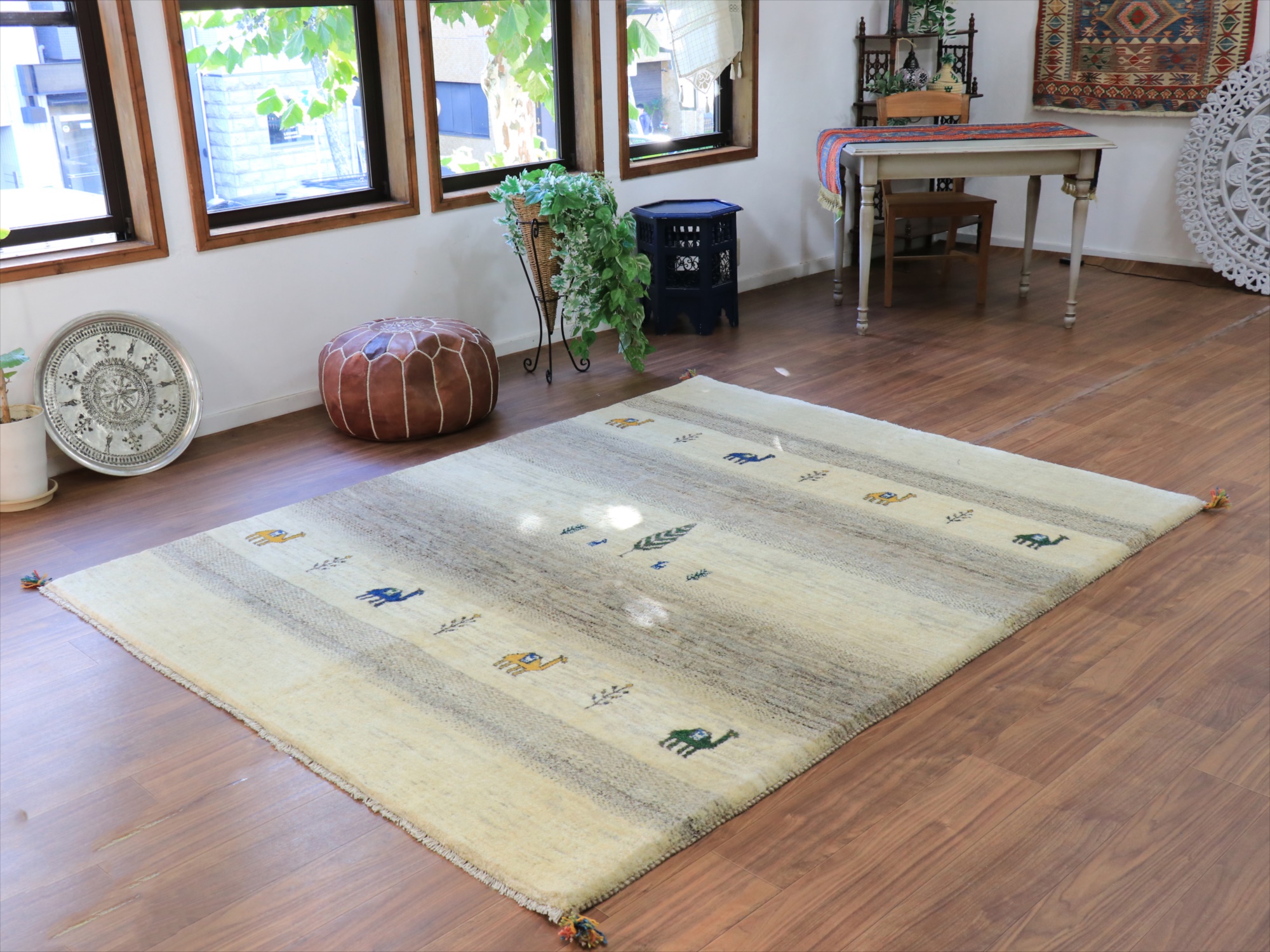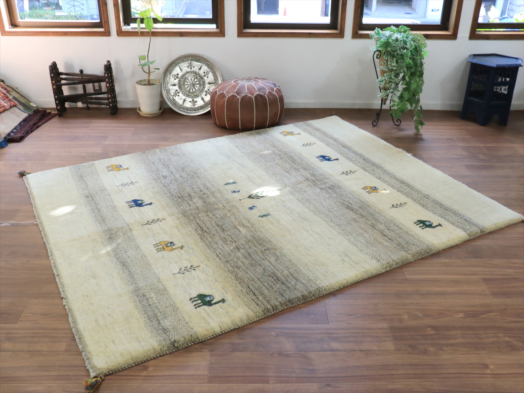 染めていない天然の羊毛の色をいかして織られたアイボリーとグレーのギャッベです。中央には木の葉のような生命の木と小さな動物たち、上下には鞍をのせたラクダのキャラバンが織り込まれています。