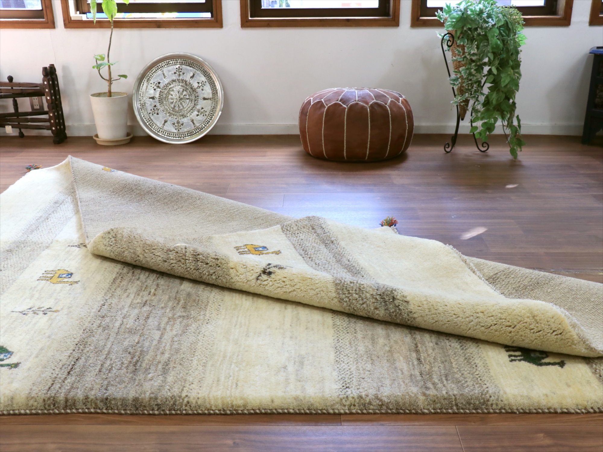 毛足が長くボリュームあるふっくらとした織り地のギャッベ。パイル(毛足)を含めた厚みは2.3-2.4cmほどで、分厚いという表現がぴったりの手織り絨毯です。