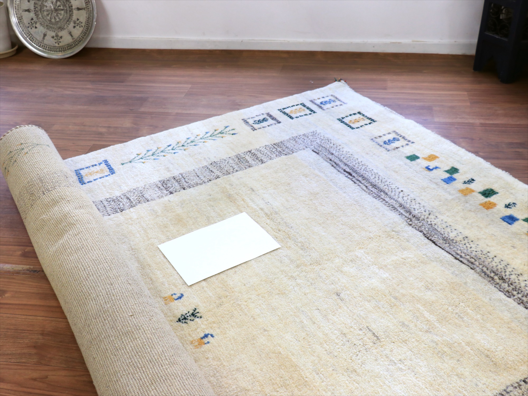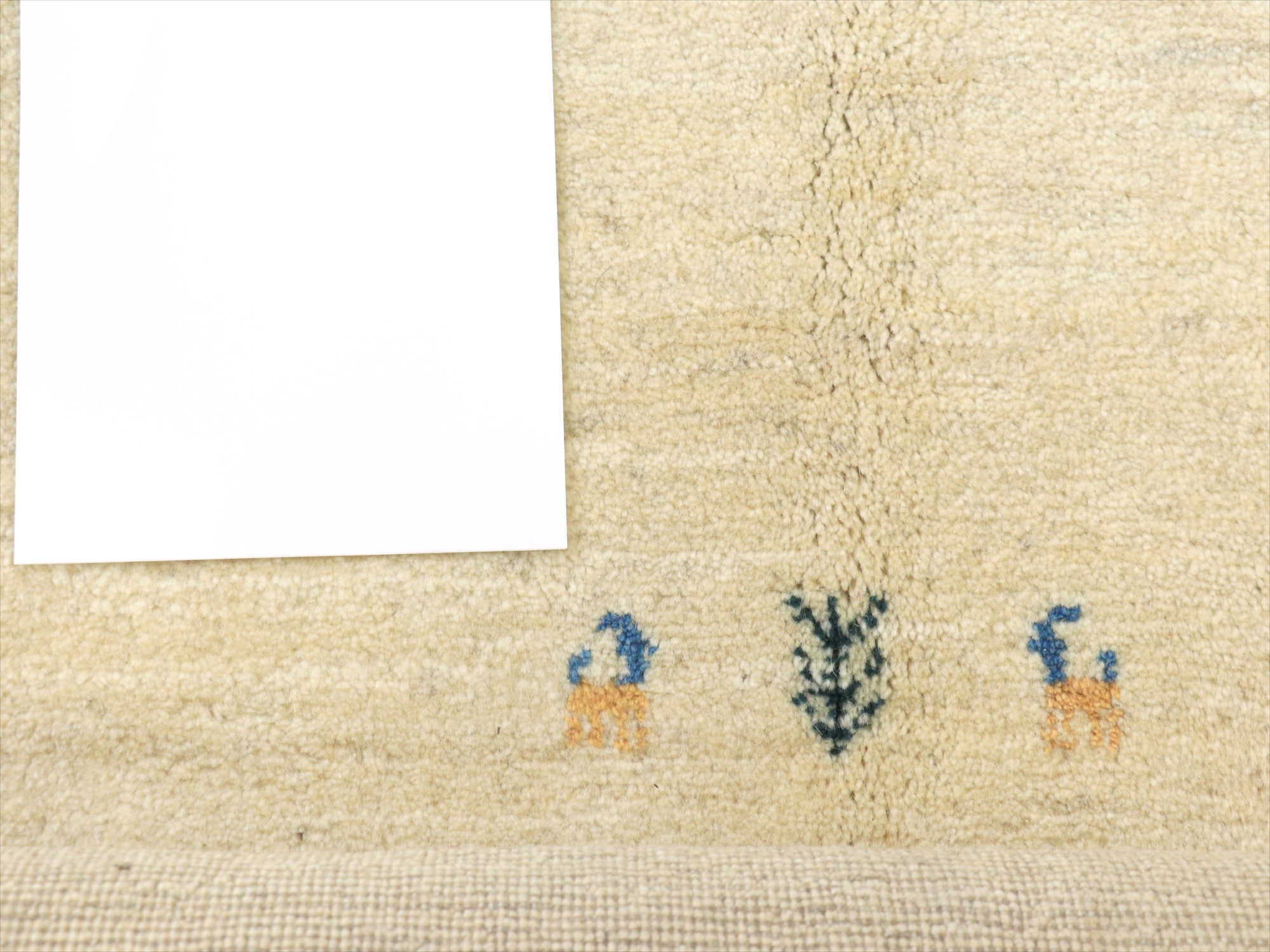 羊毛の色は、当店ではナチュラルアイボリーと呼んでいて、真っ白ではなくやや黄色みのある明るいベージュ系の色です。比較のために、真っ白なコピー用紙を置いてみましたので、ご参考にされてください。パイル(毛足)の方向によって、明るく白っぽく見える側と逆に濃いベージュに見える側があります。