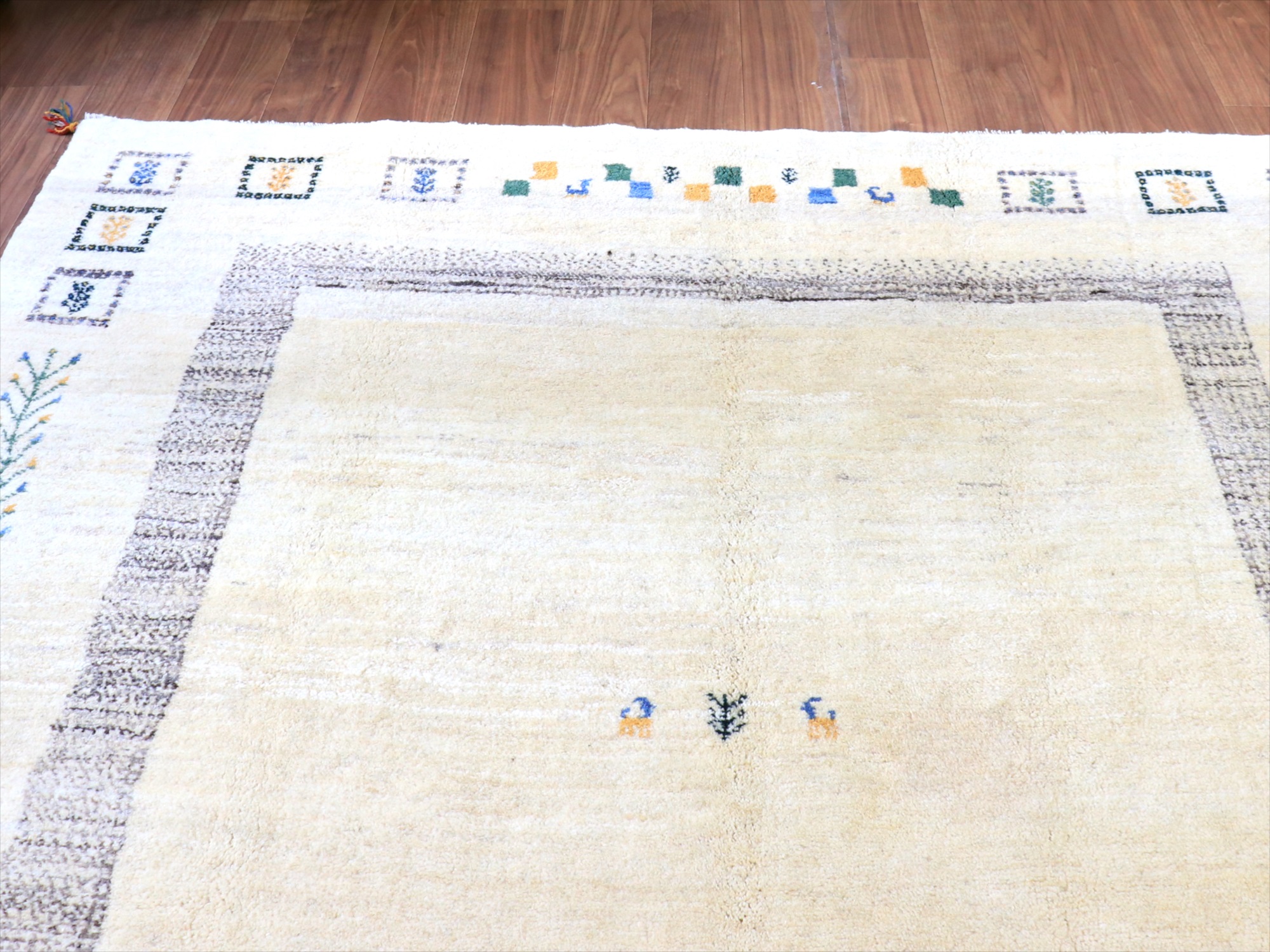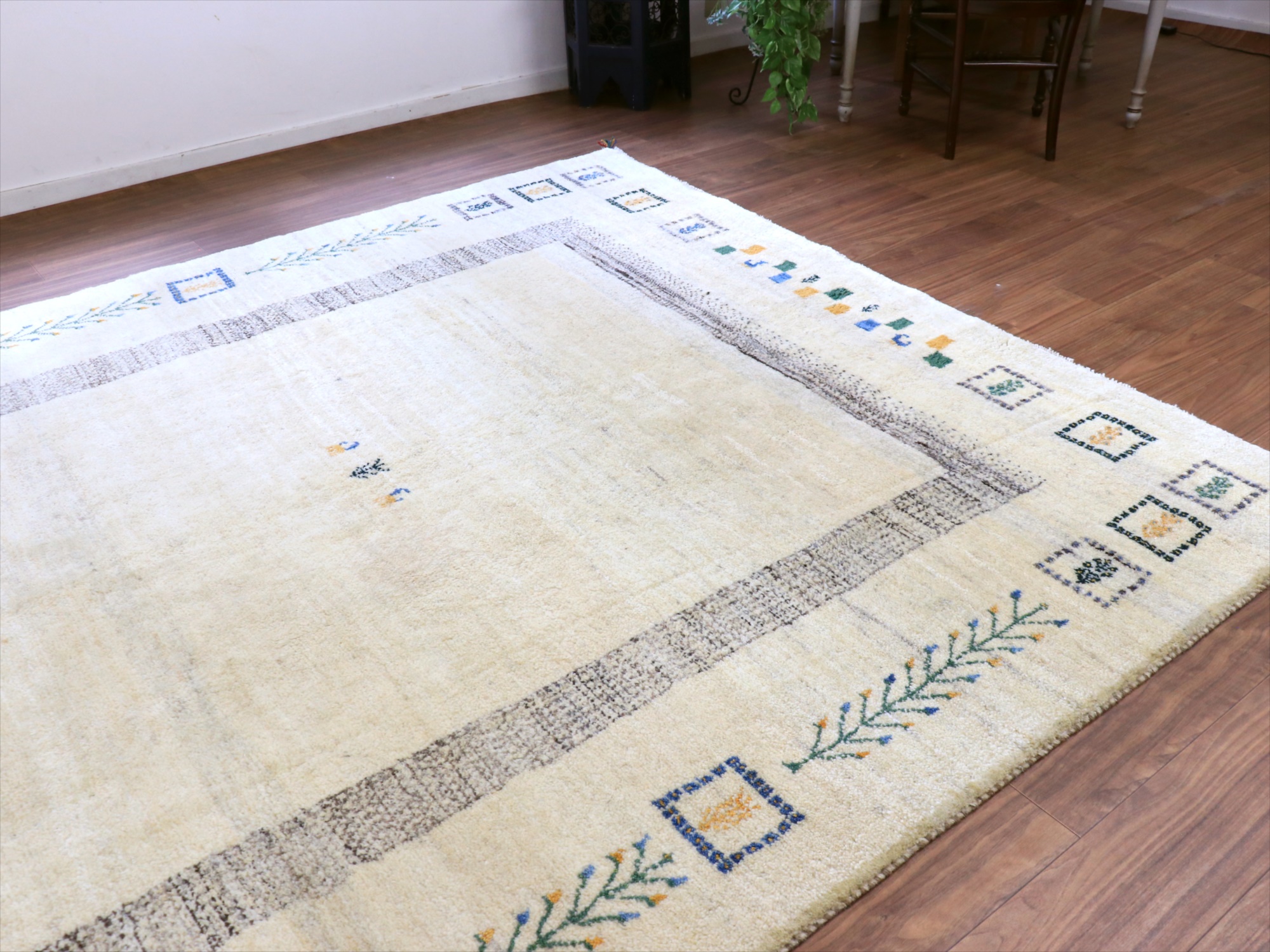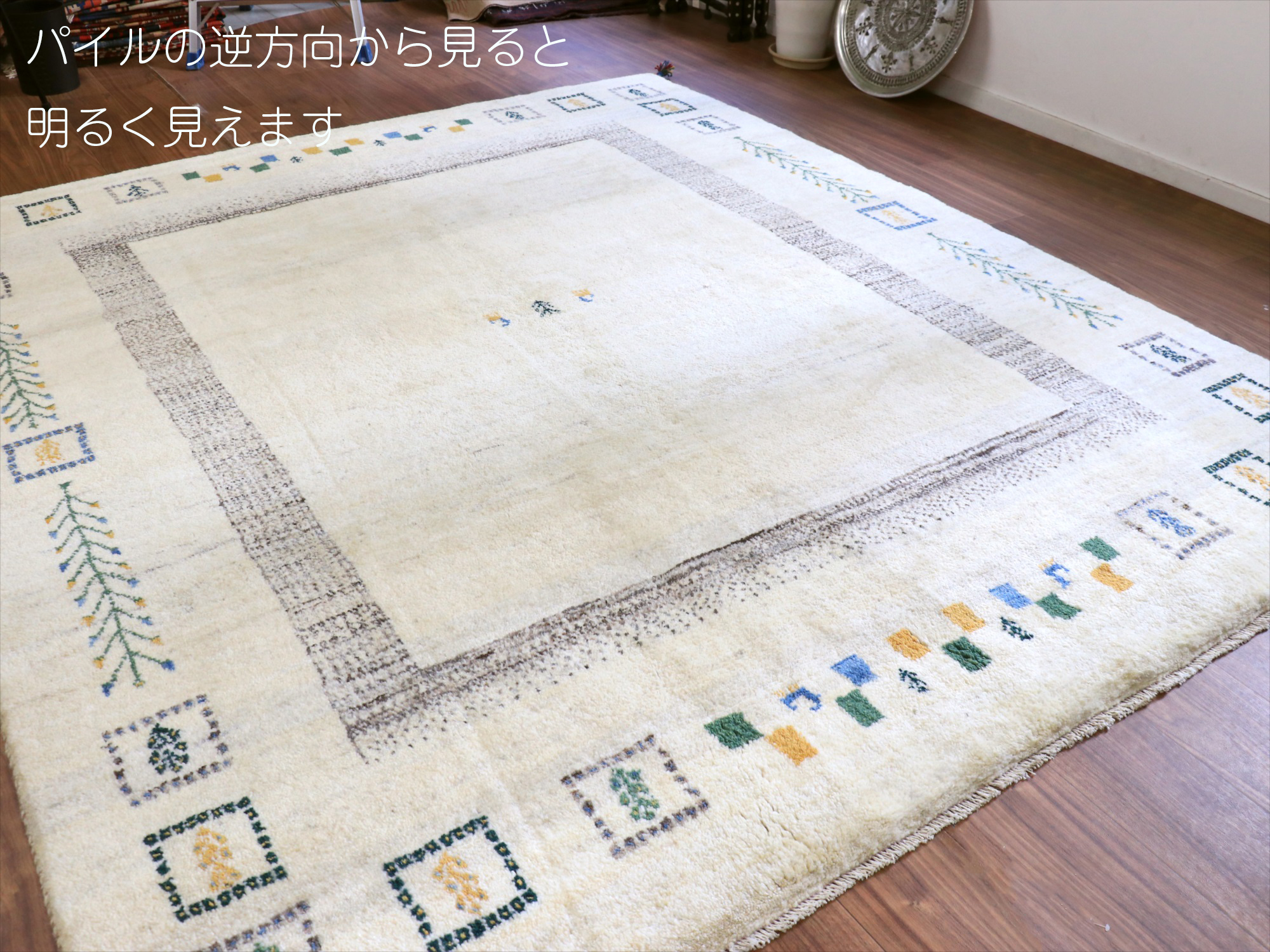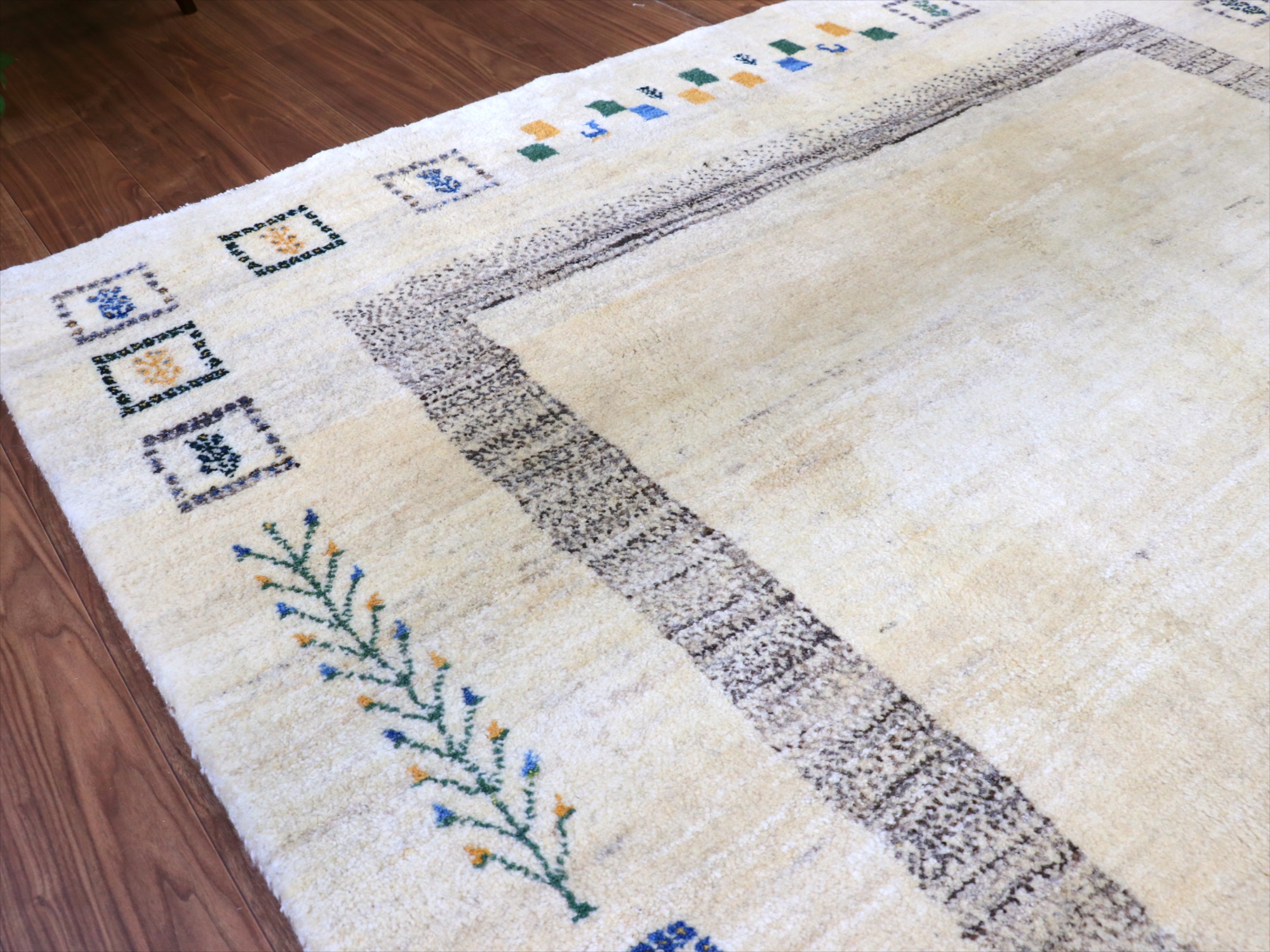 染めていない天然の羊毛のアイボリーをベースに、グレー、イエロー、グリーンなどでモチーフが織り込まれています。横幅が200cmと広めで、正方形に近い使いやすいサイズです。