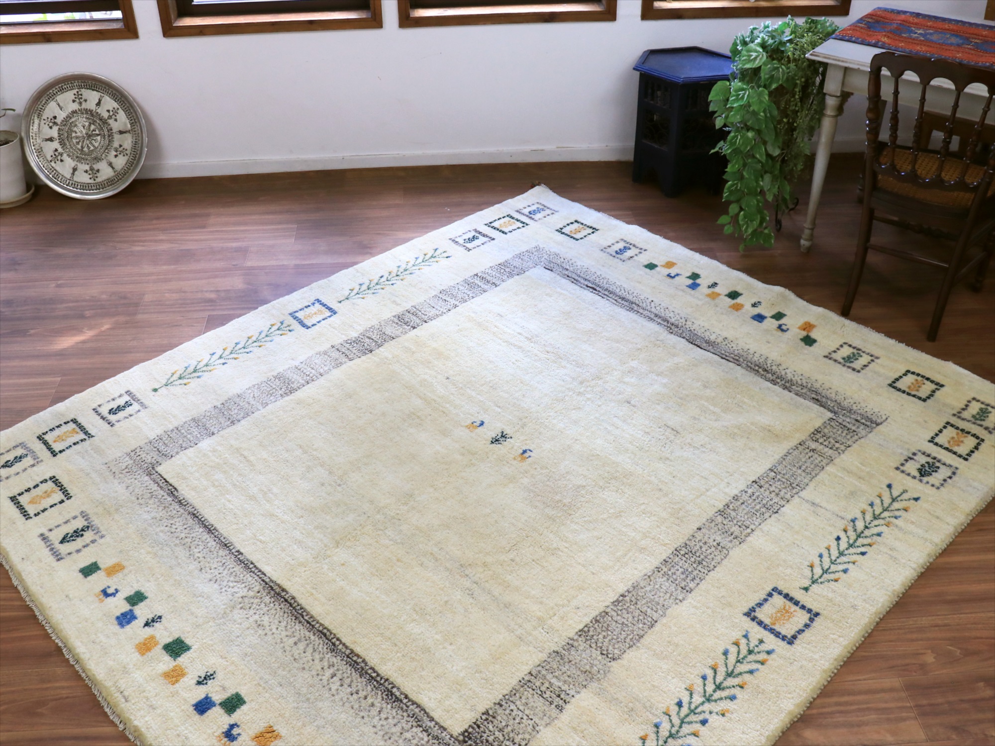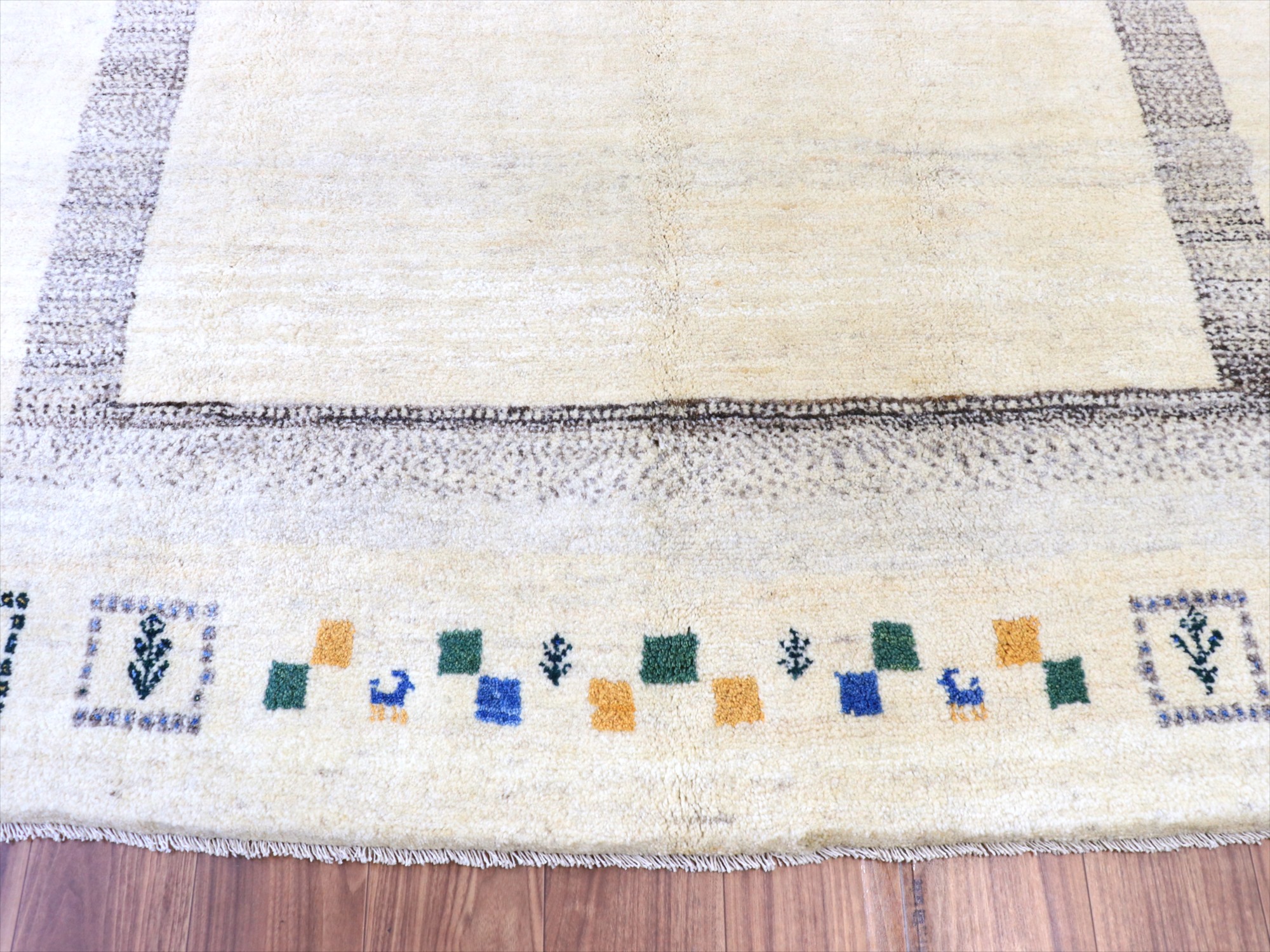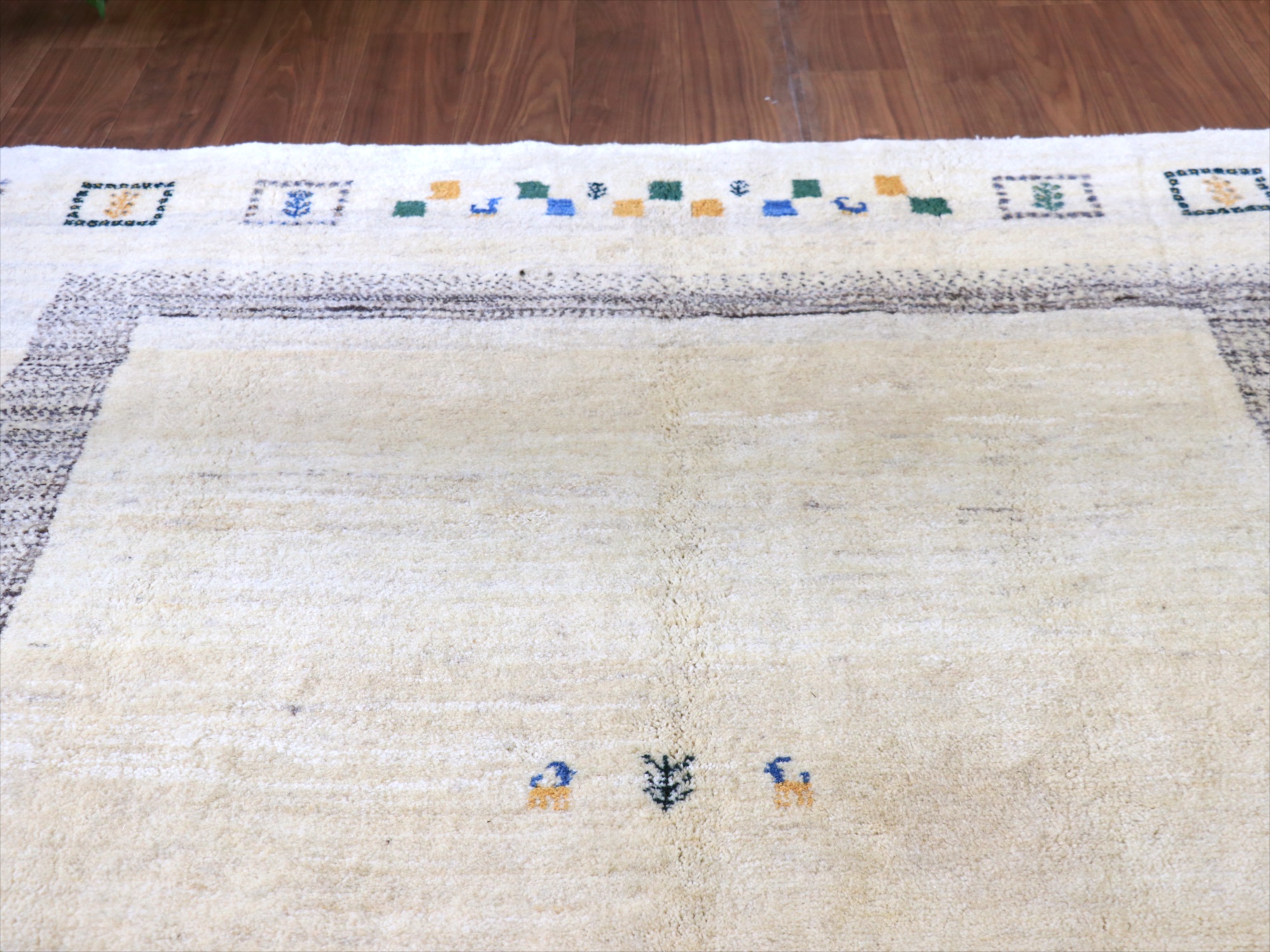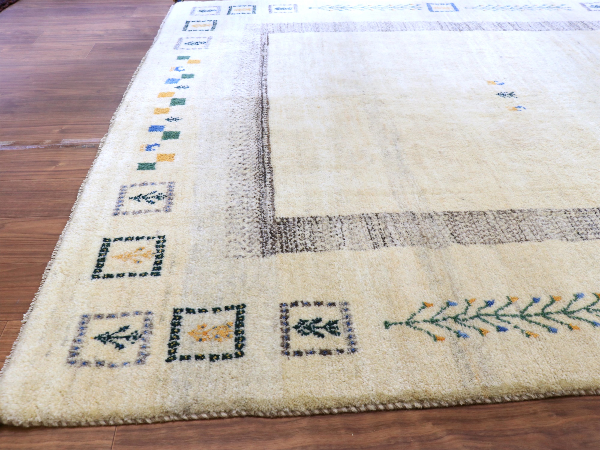 染めていない天然の羊毛のアイボリーをベースに、グレー、イエロー、グリーンなどでモチーフが織り込まれています。横幅が200cmと広めで、正方形に近い使いやすいサイズです。
