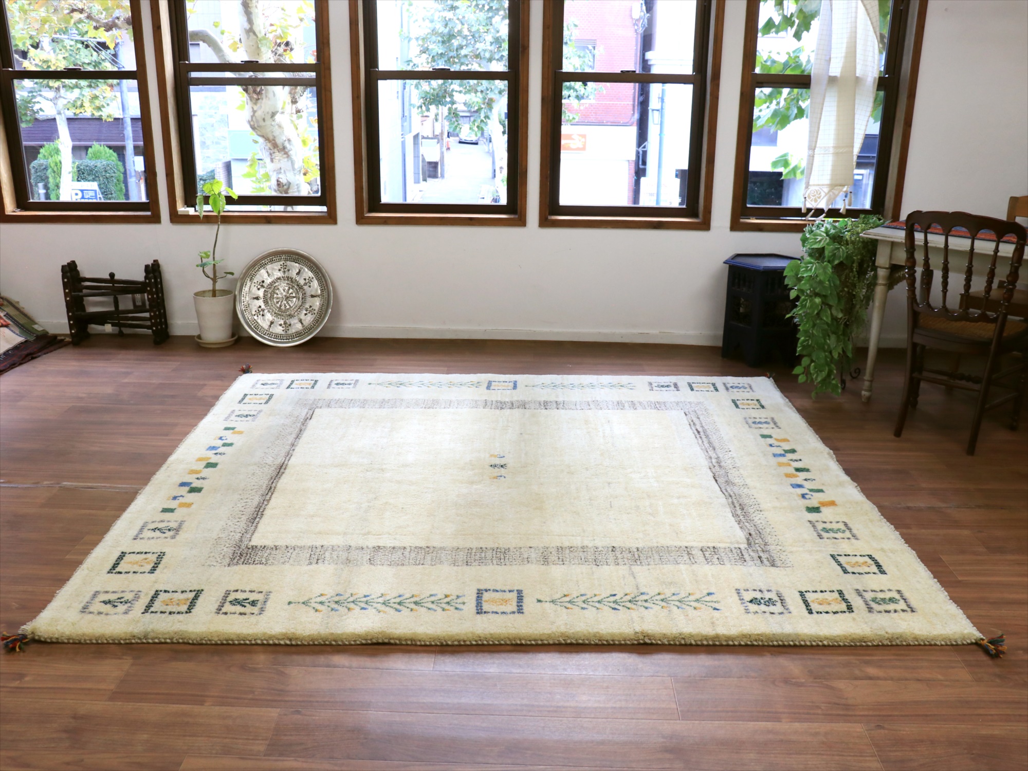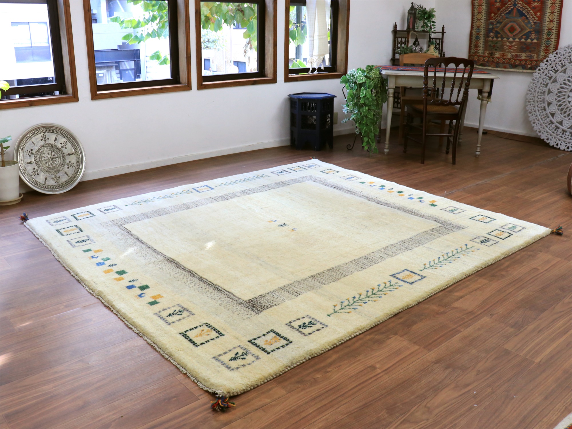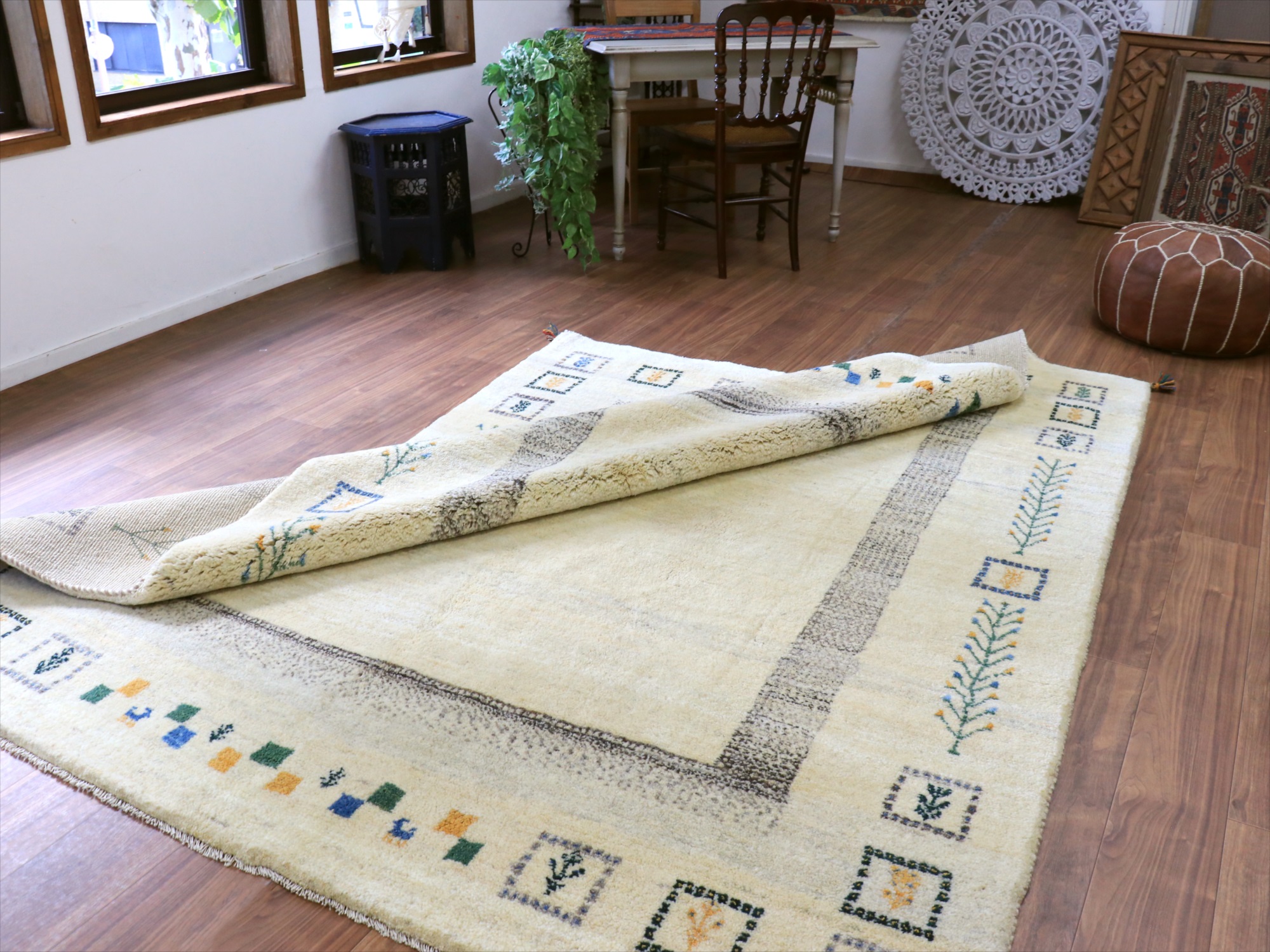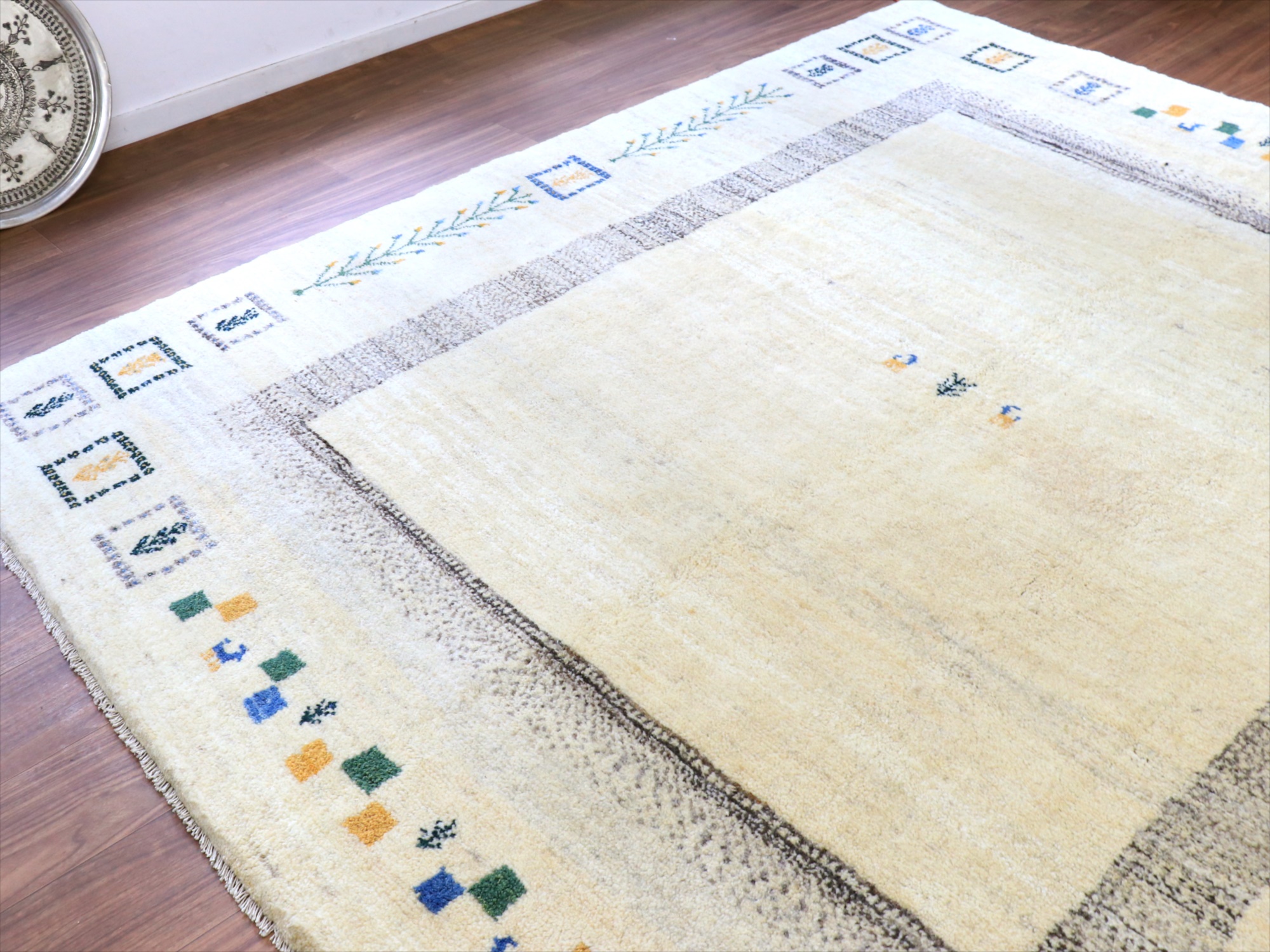 染めていない天然の羊毛のアイボリーをベースに、グレー、イエロー、グリーンなどでモチーフが織り込まれています。横幅が200cmと広めで、正方形に近い使いやすいサイズです。
