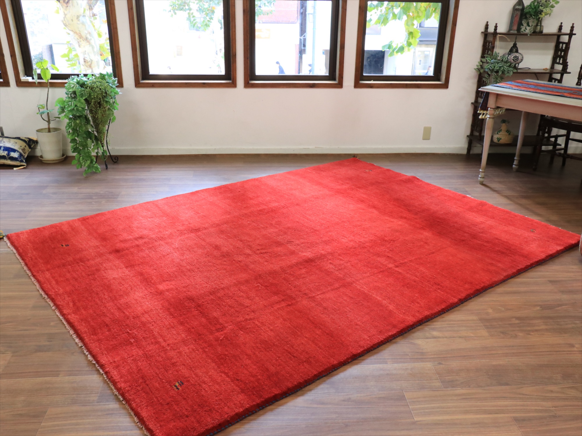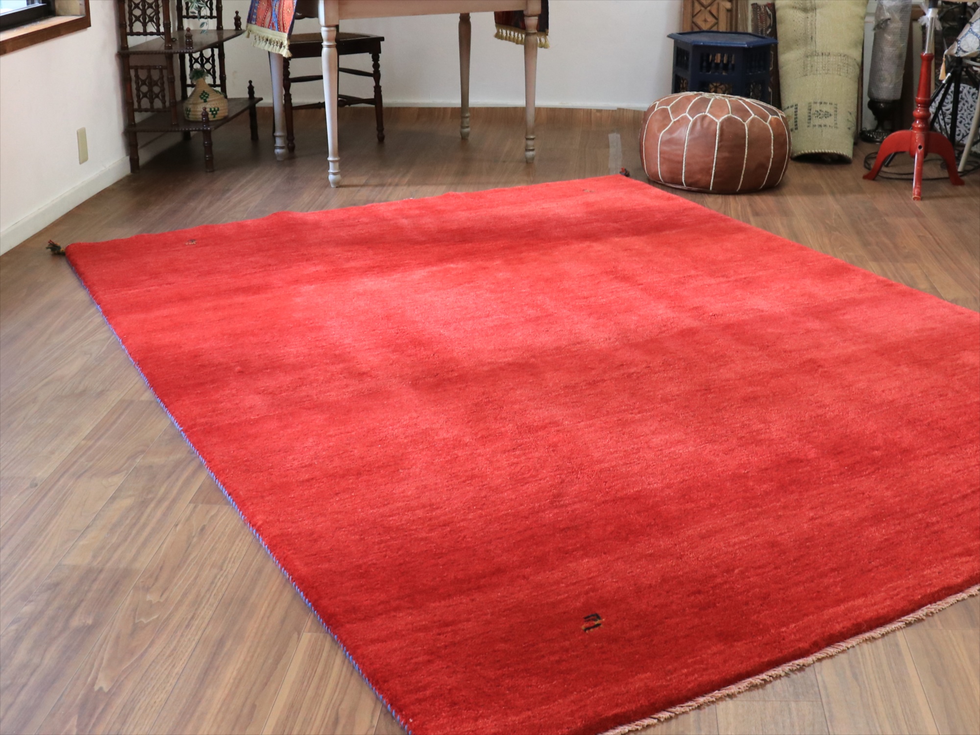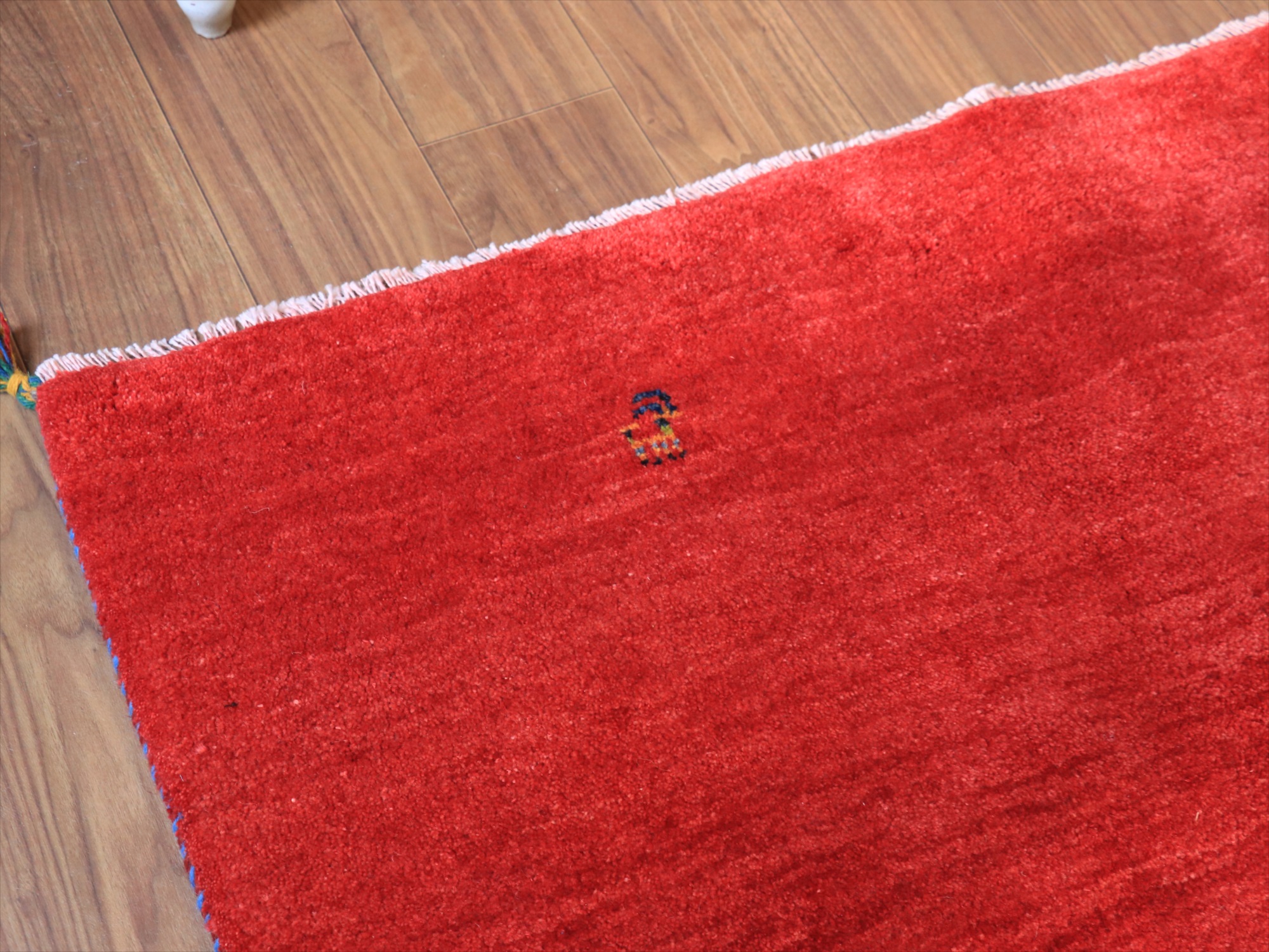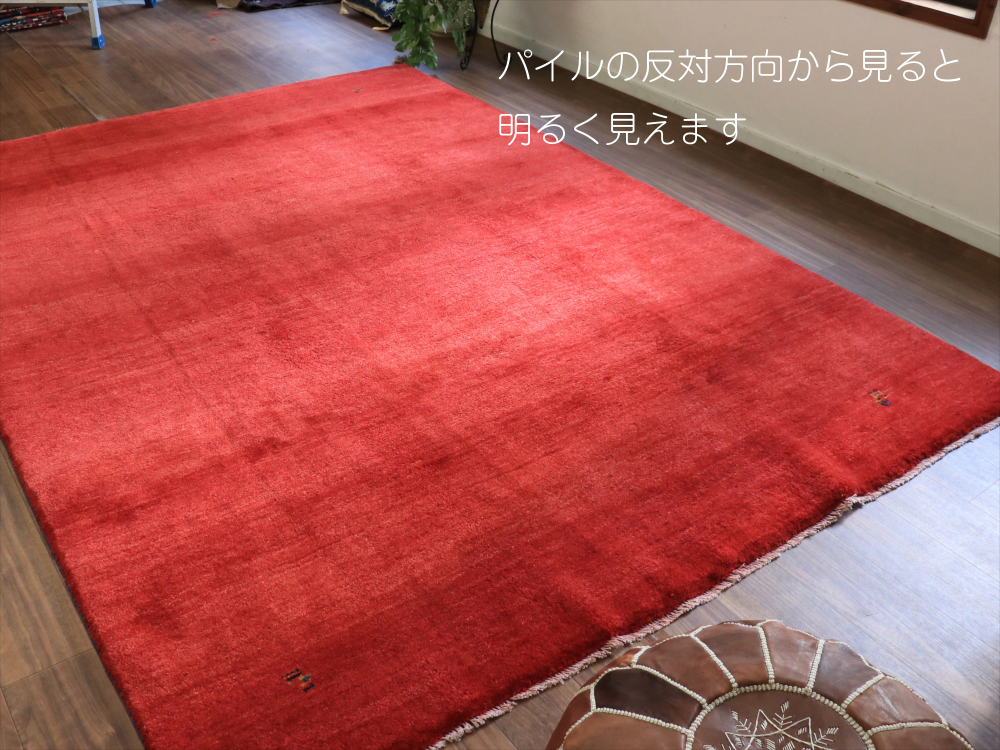 草木染めの染め色の濃淡を活かしたグラデーションがきれいな一枚。発色がよく、明るいイメージのレッドです。モチーフが四隅に入っているシンプルなデザインで、染めの濃淡による自然なグラデーションができています。明るいところで、パイル(毛足)の反対側からみると明るく見えます。