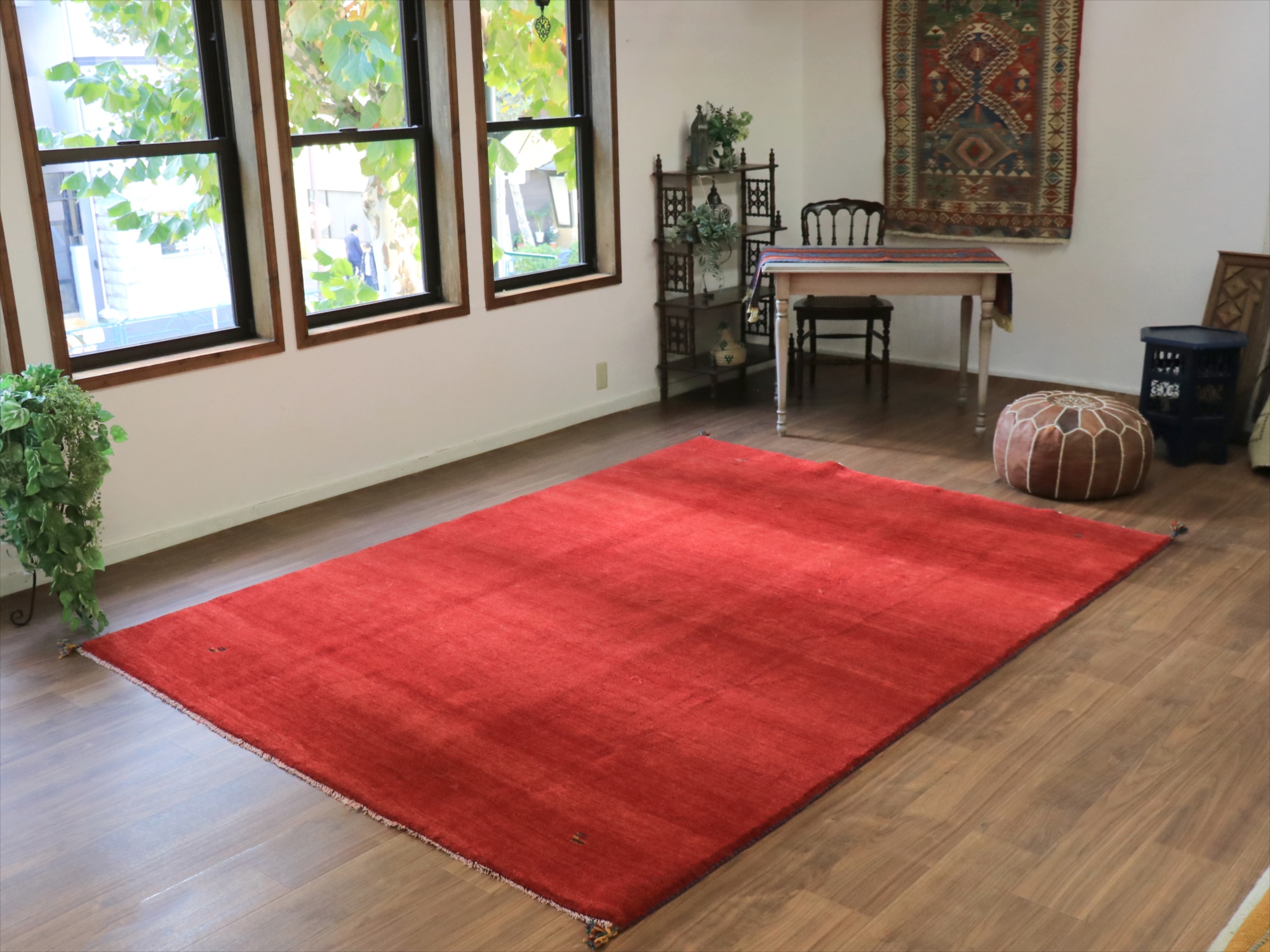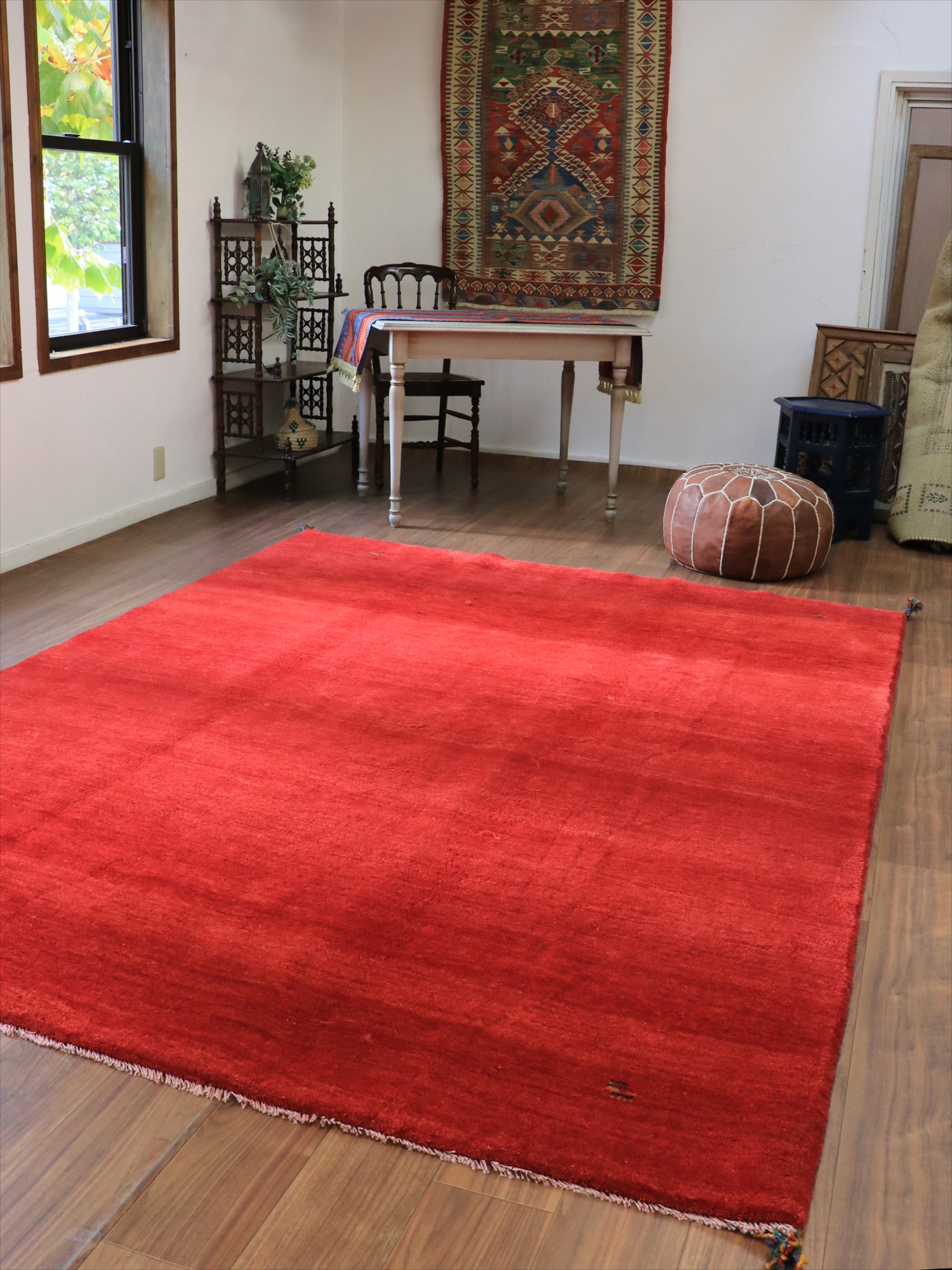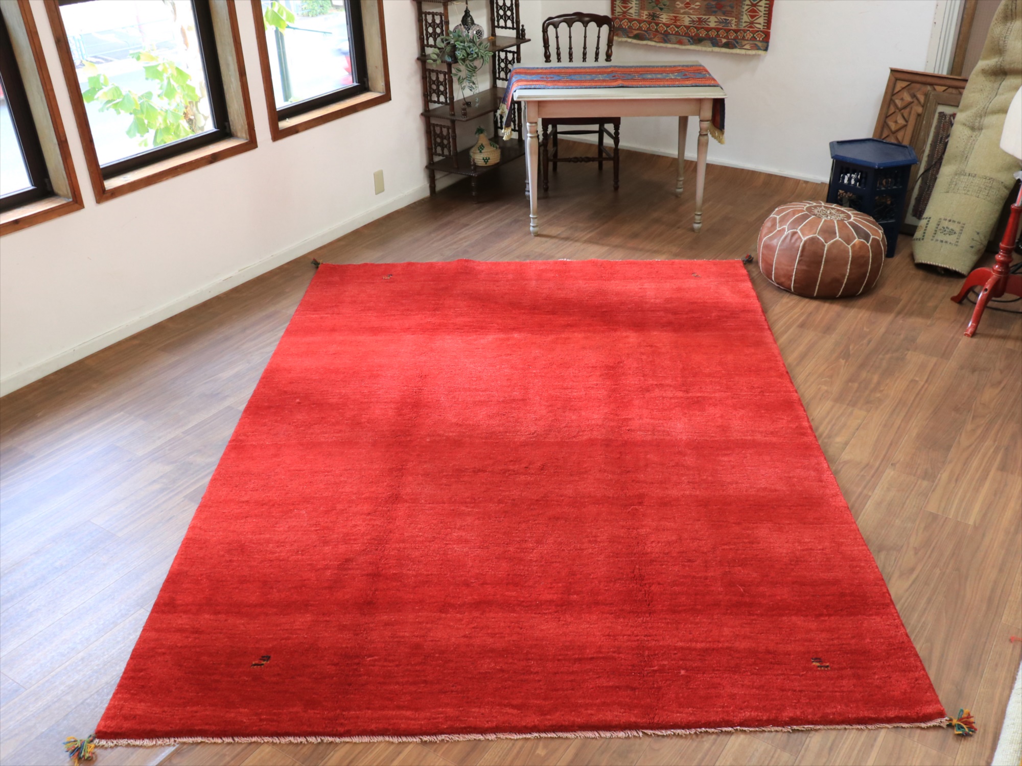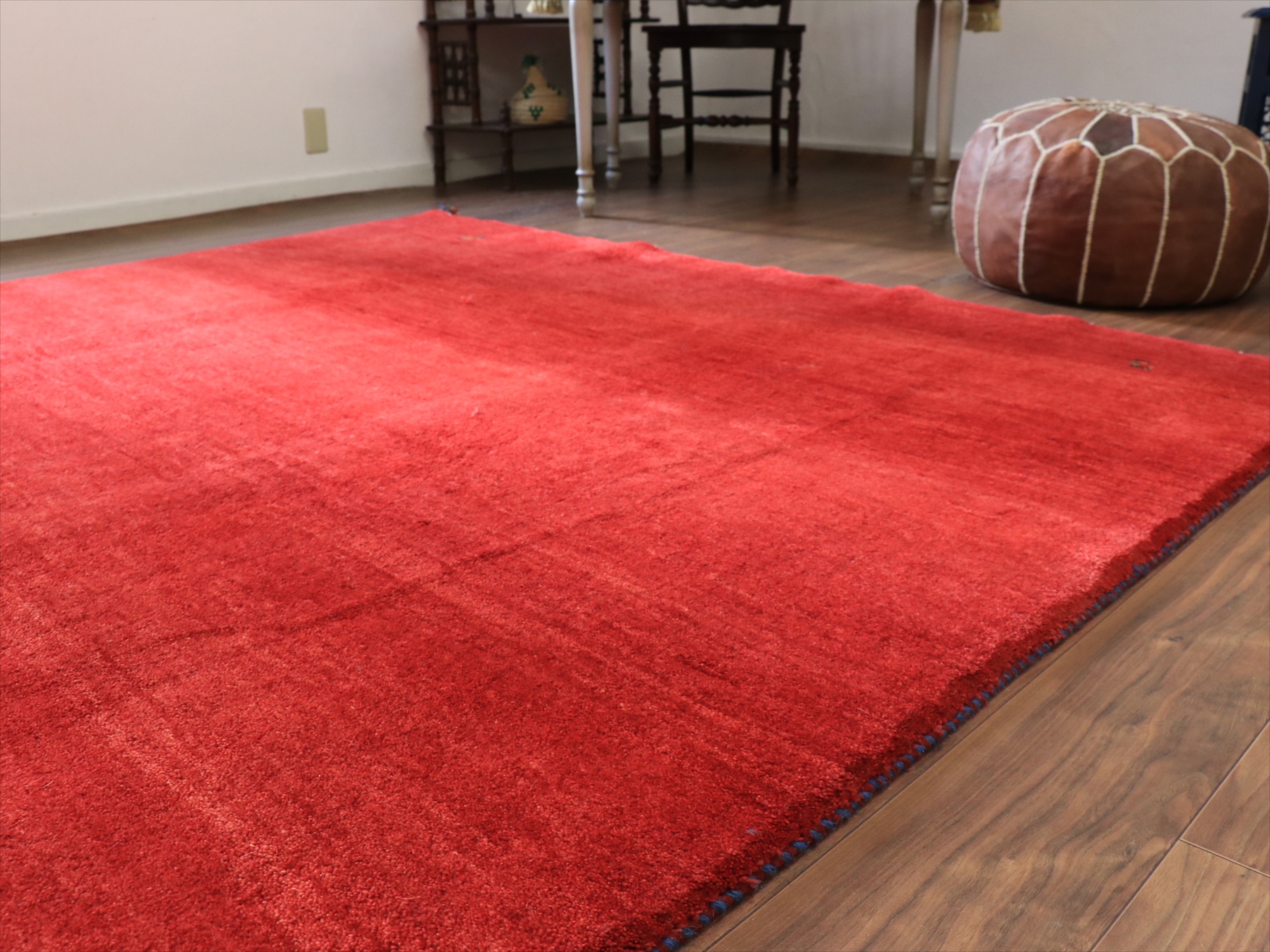 草木染めの染め色の濃淡を活かしたグラデーションがきれいな一枚。発色がよく、明るいイメージのレッドです。モチーフが四隅に入っているシンプルなデザインで、染めの濃淡による自然なグラデーションができています。明るいところで、パイル(毛足)の反対側からみると明るく見えます。