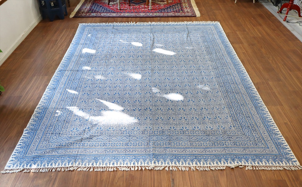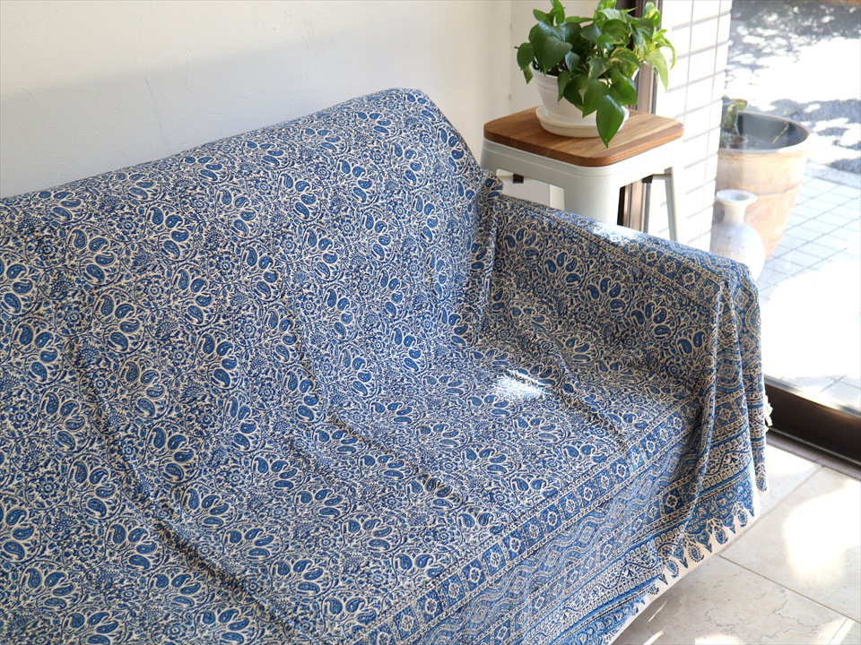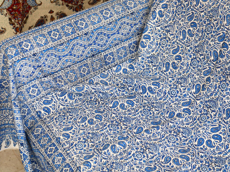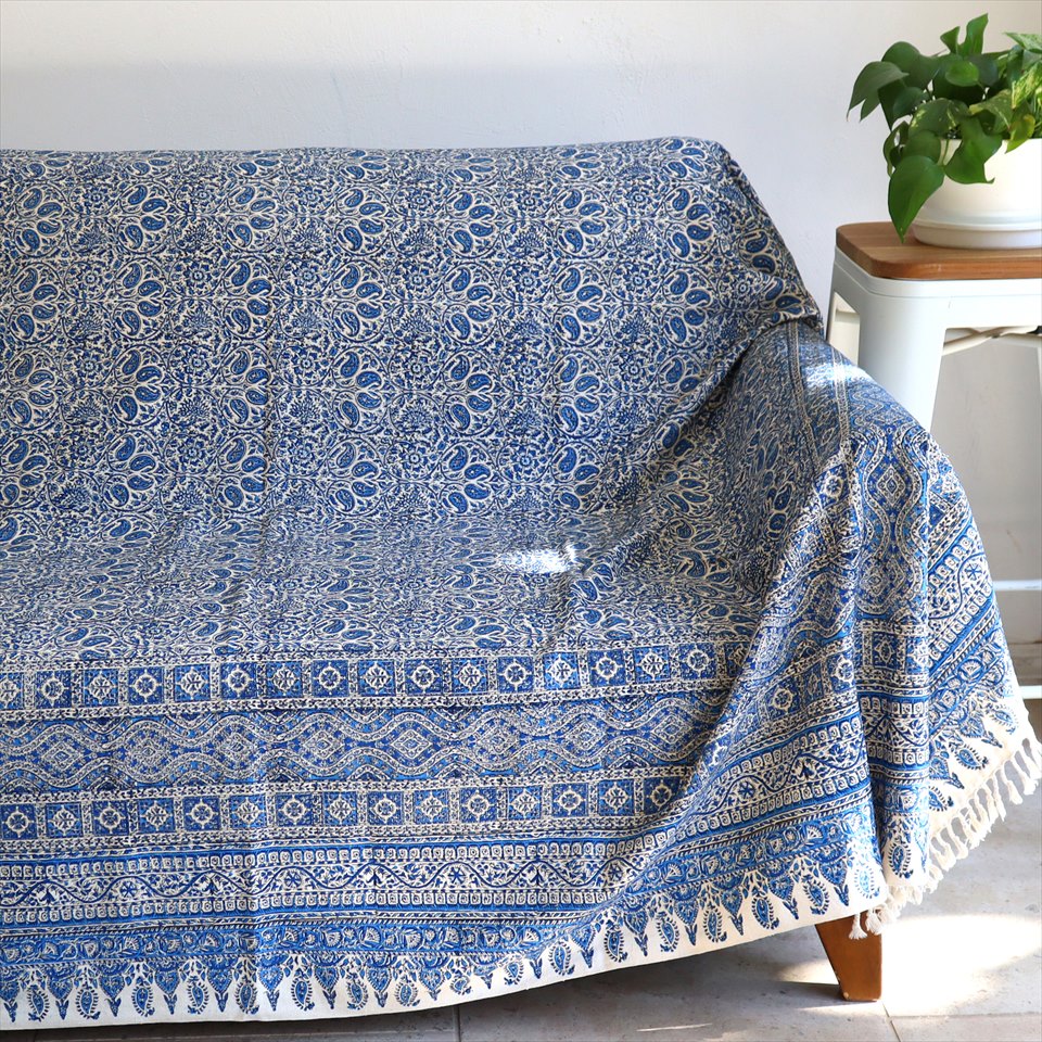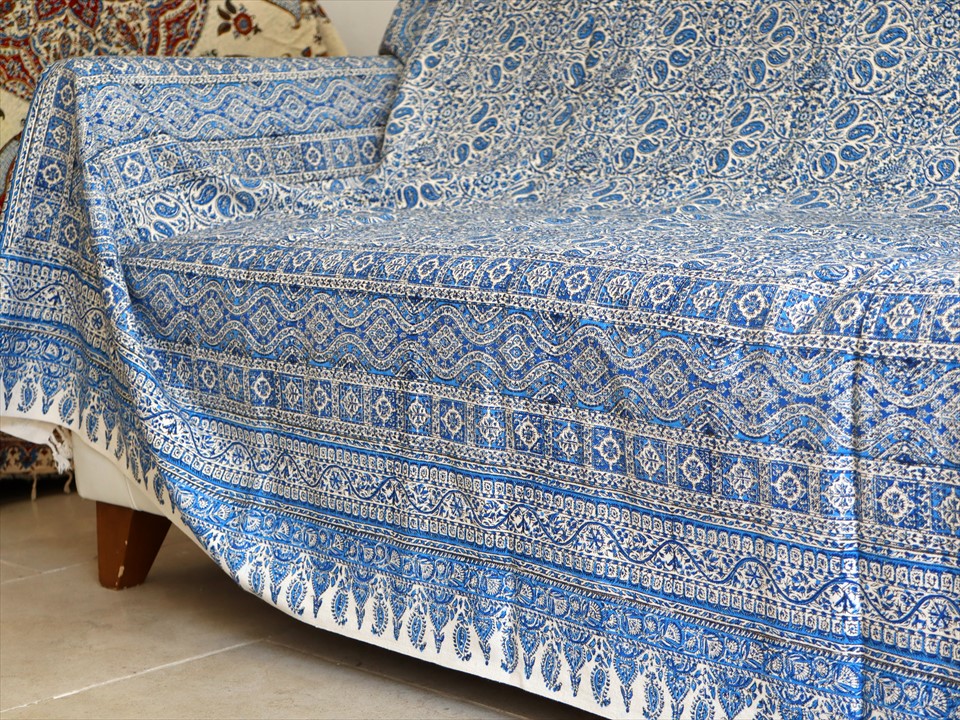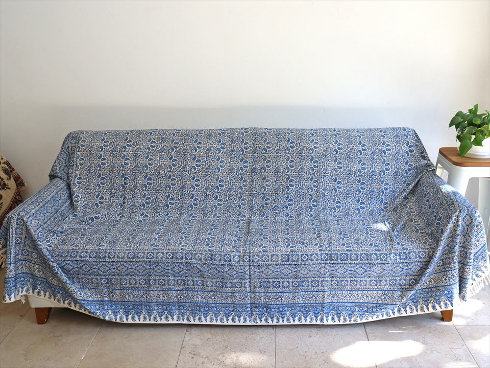 ペルシャ更紗 イラン手染め布 264x208cm ブルー アンティークデザイン ソファーカバー ベッドカバー