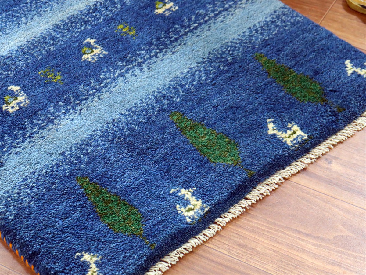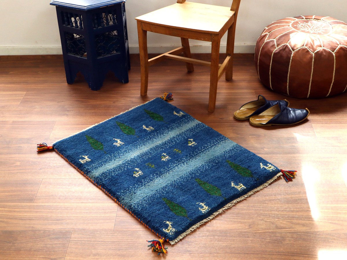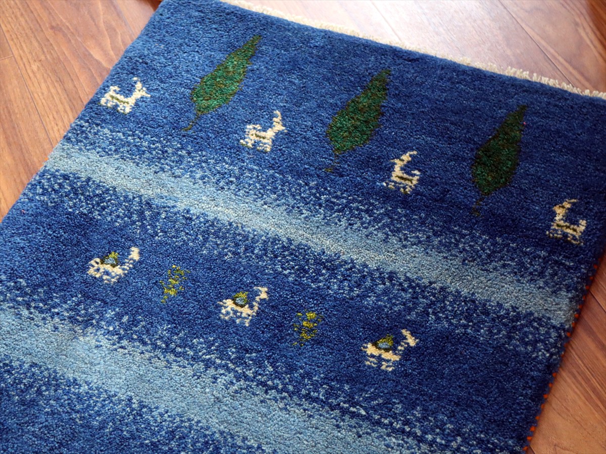 インディゴ藍で染めたブルーをベースに、動物モチーフと糸杉が織られています。糸杉は長寿を願う意味を持っていて、ギャベでは多用されるモチーフのひとつです。