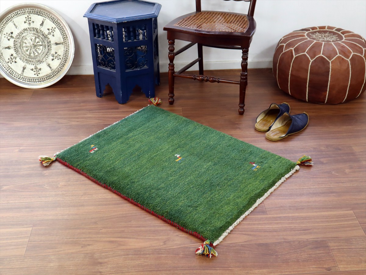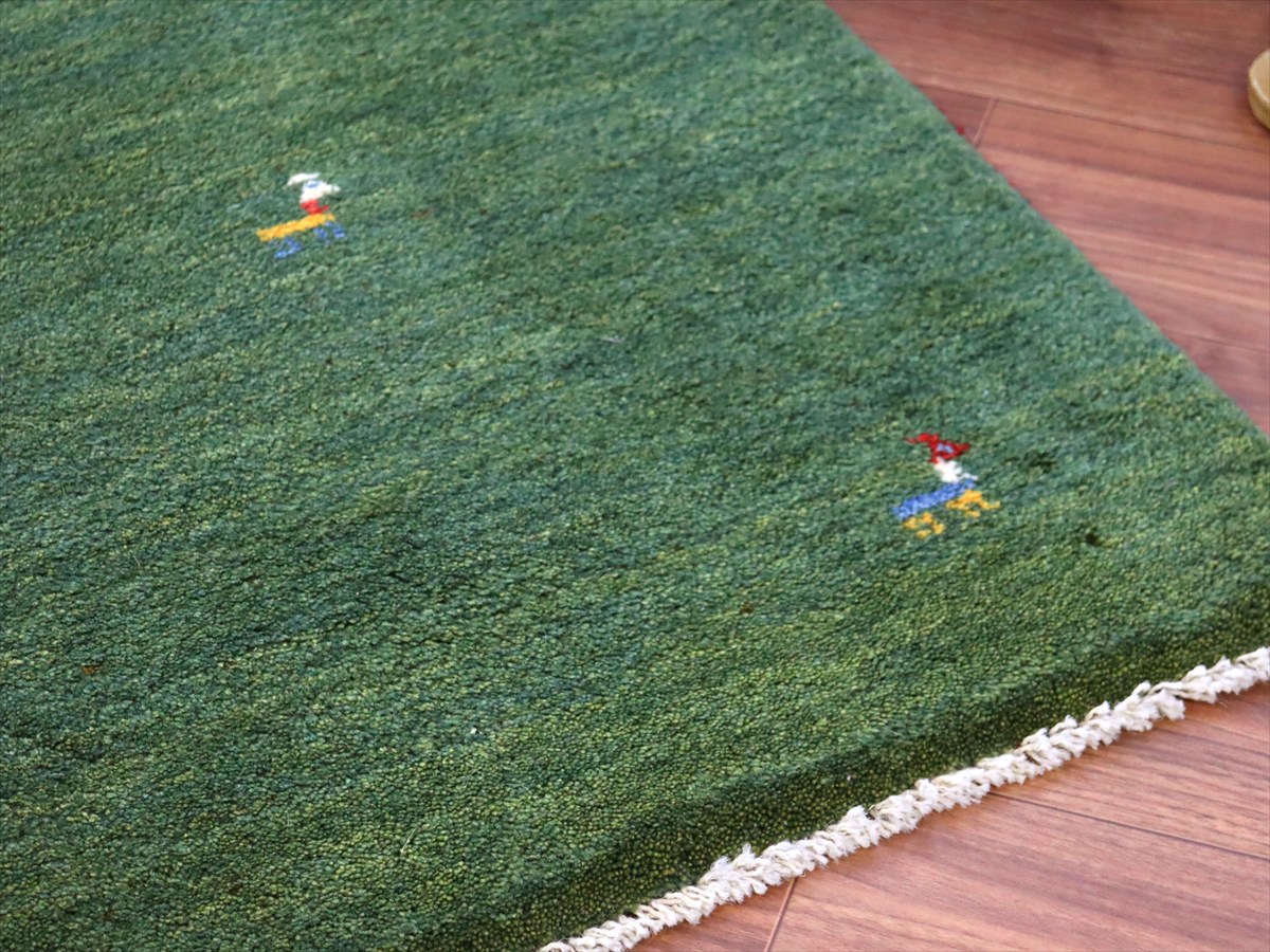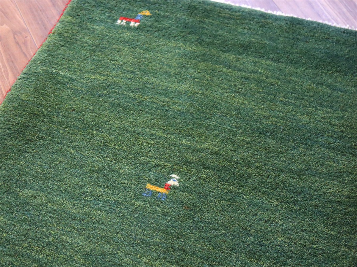 鮮やかなグリーンをベースに、動物モチーフが織られているシンプルなギャッベ。