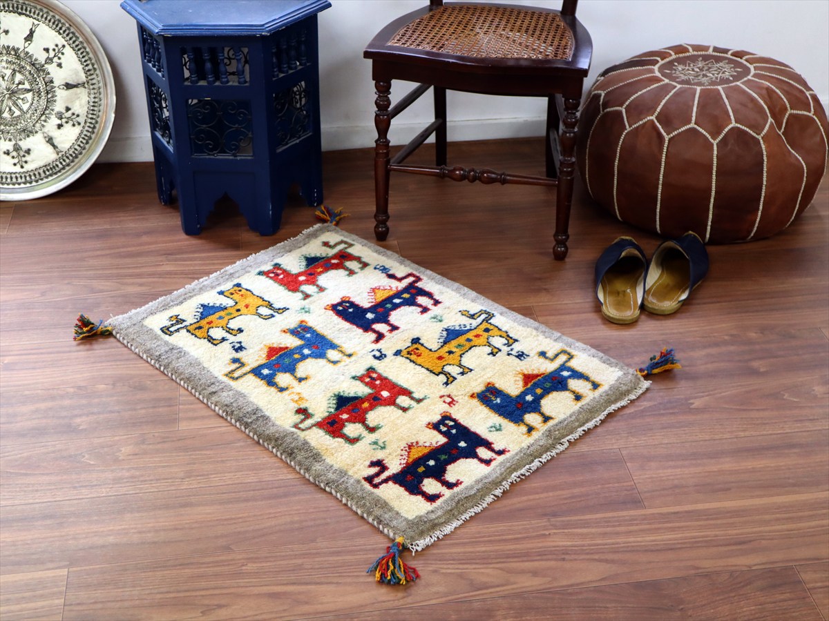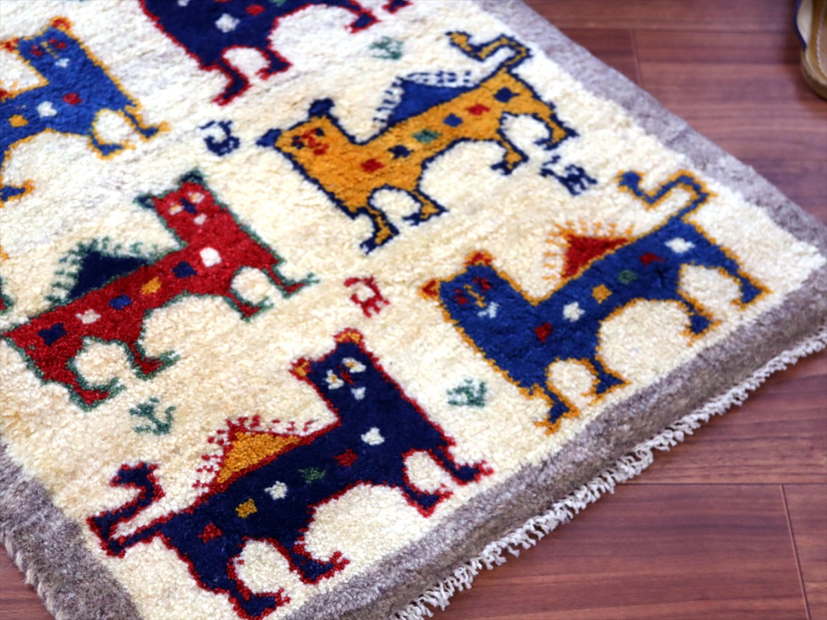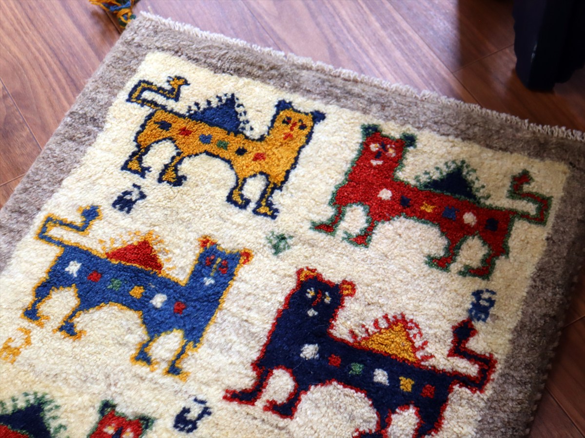 天然の羊毛の色をそのまま使って織られた素朴なナチュラルカラーをベースに、カラフルなライオンたちが綺麗に並んでいます。背中に太陽をのぞかせているライオンのデザインは、1979年にイラン革命が起こる前のパフレヴィー王朝時代のイランの国旗のデザインをモチーフにしています。