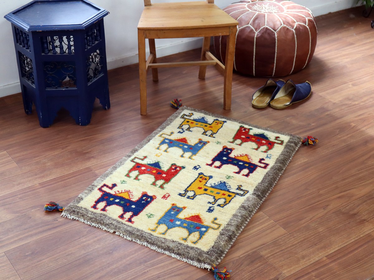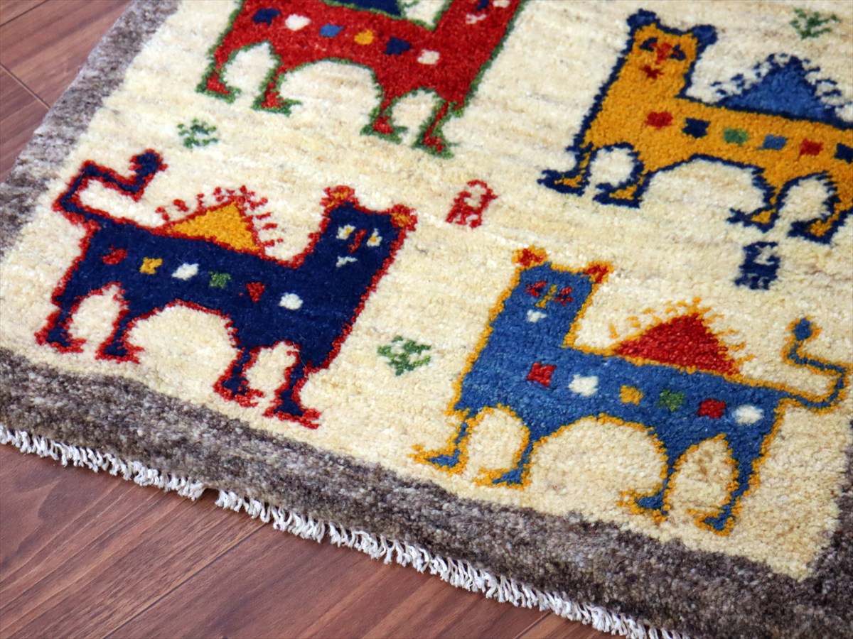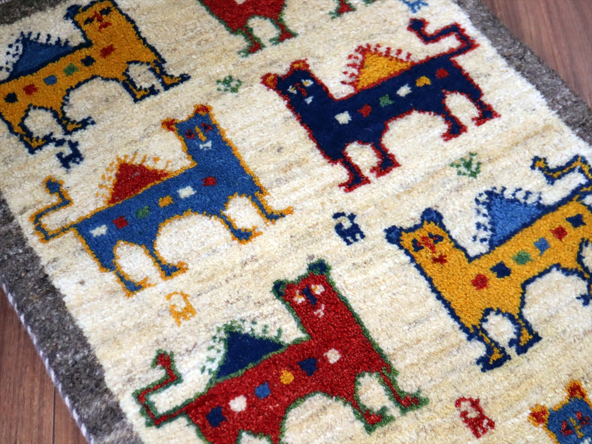 天然の羊毛の色をそのまま使って織られた素朴なナチュラルカラーをベースに、カラフルなライオンたちが綺麗に並んでいます。背中に太陽をのぞかせているライオンのデザインは、1979年にイラン革命が起こる前のパフレヴィー王朝時代のイランの国旗のデザインをモチーフにしています。
