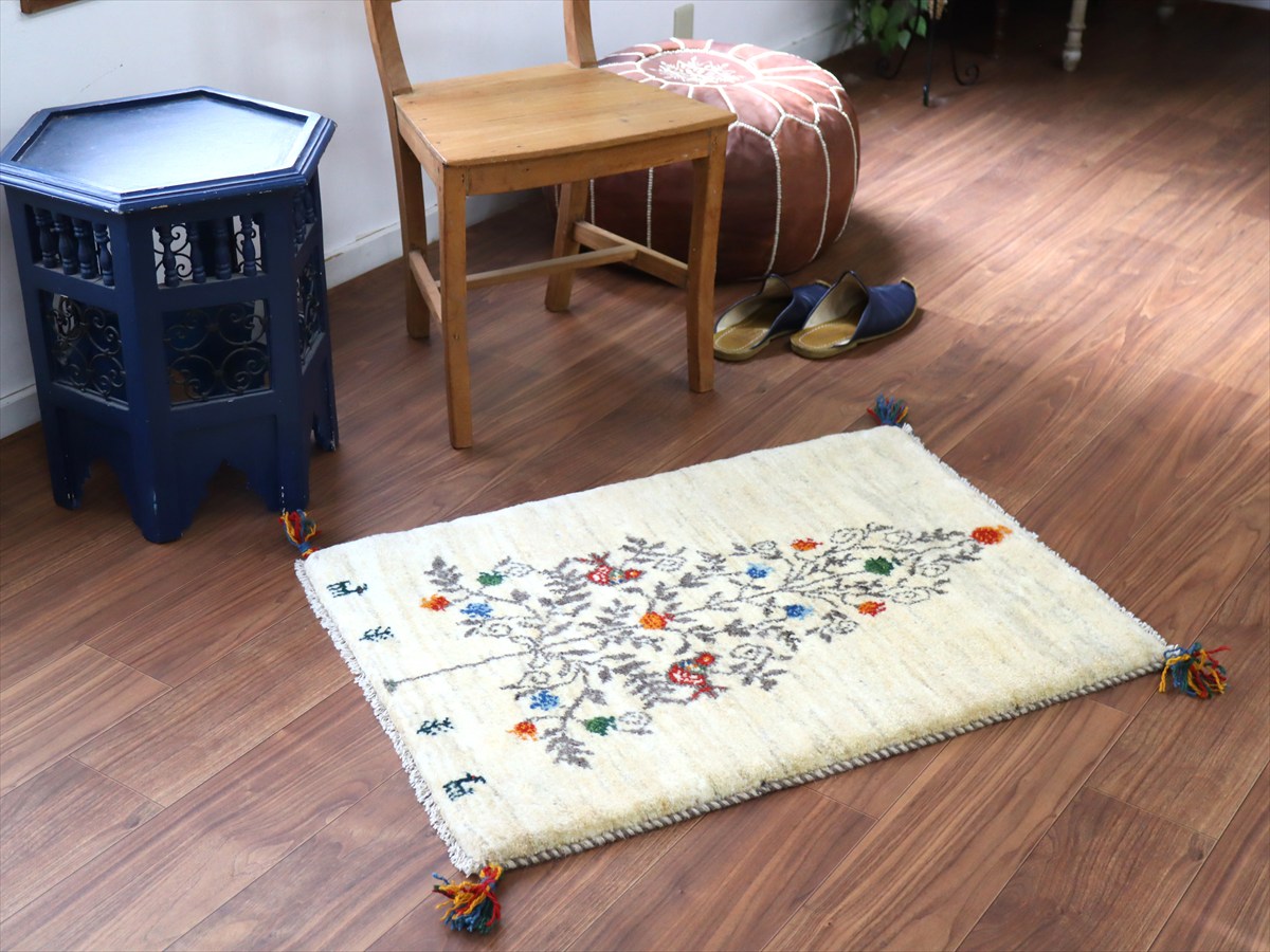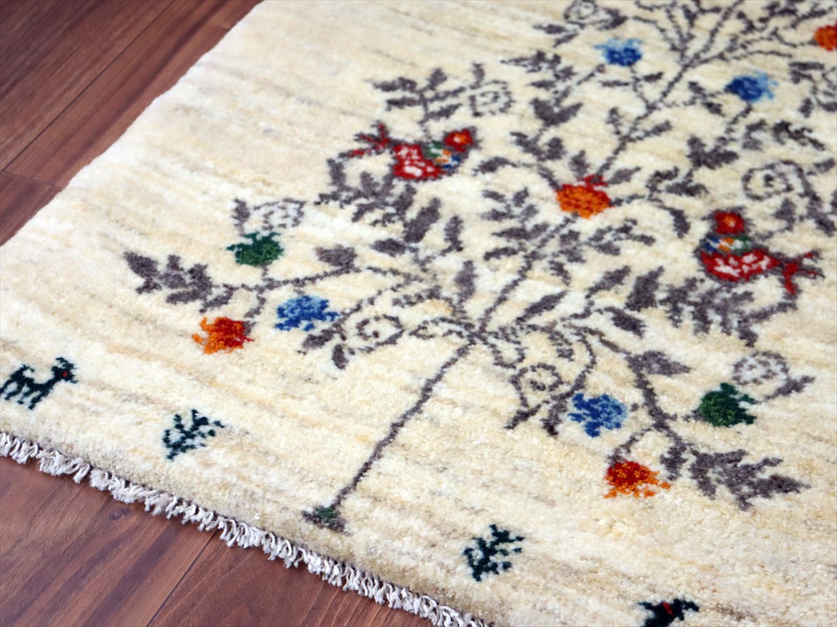 天然の羊毛の色をそのまま使って織られた素朴なナチュラルカラーをベースに、生命の樹にザクロの実と鳥が佇んでいます。樹の下には小さい生命の樹と動物もいます。