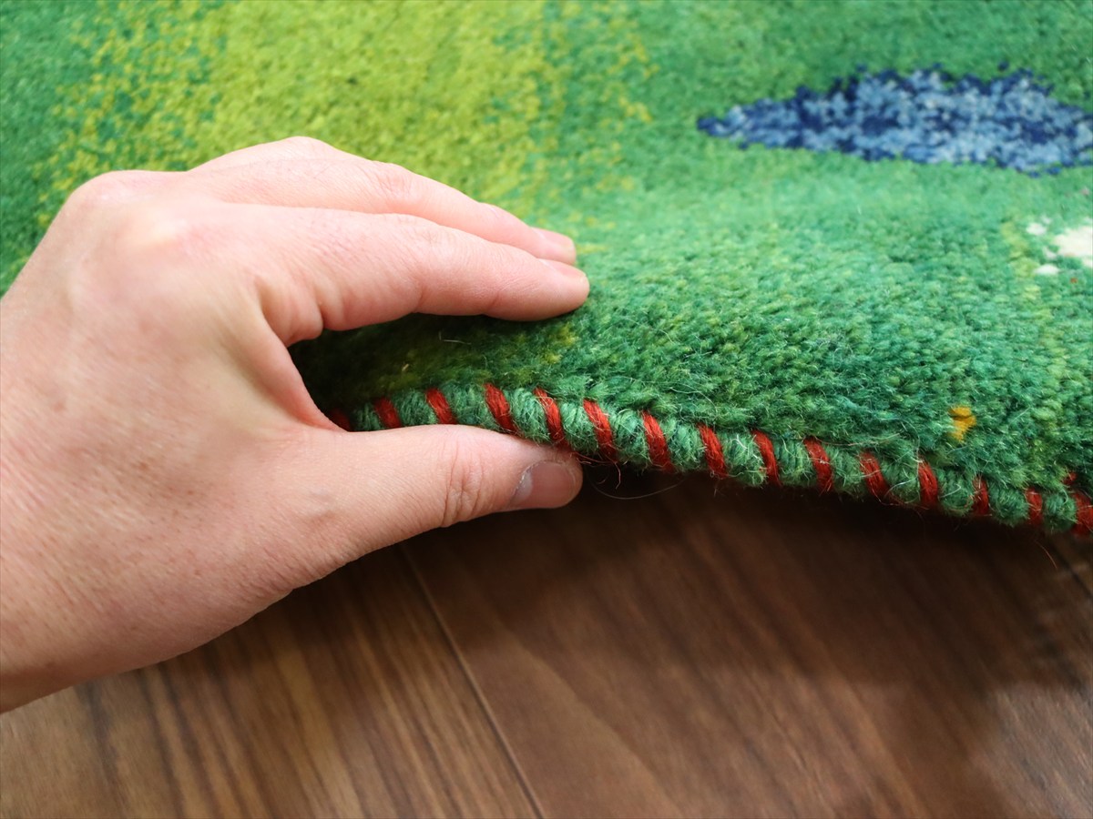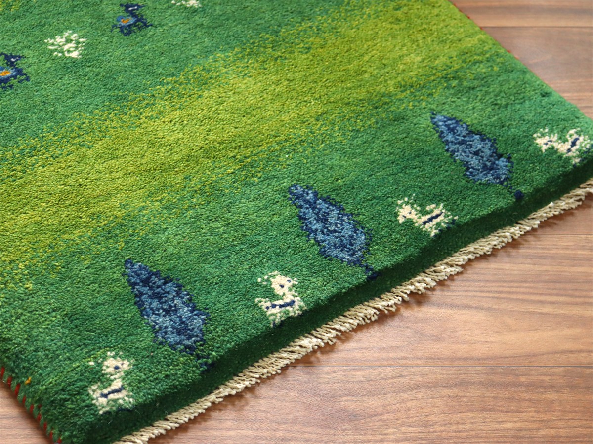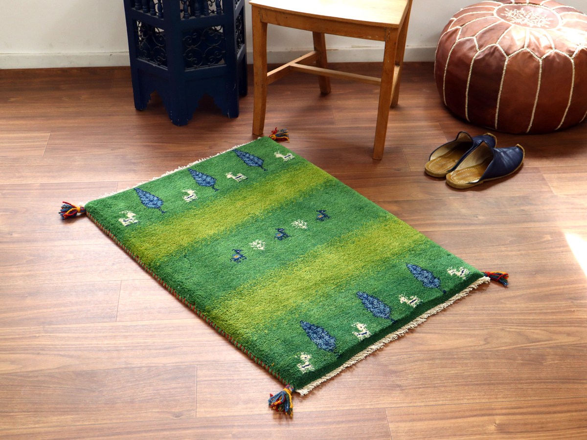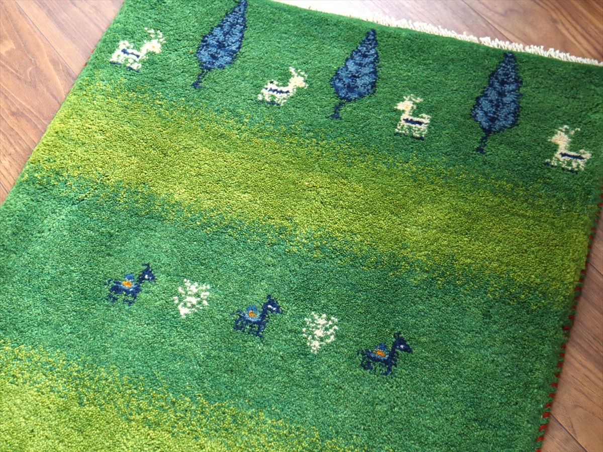 トーンの違うグリーンをベースに、糸杉と動物モチーフが織られています。糸杉は長寿を願う意味を持っていて、ギャベでは多用されるモチーフのひとつです。