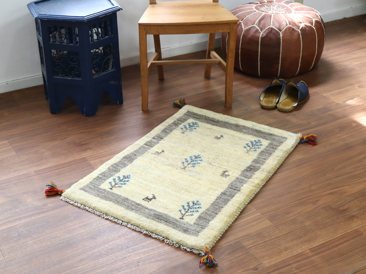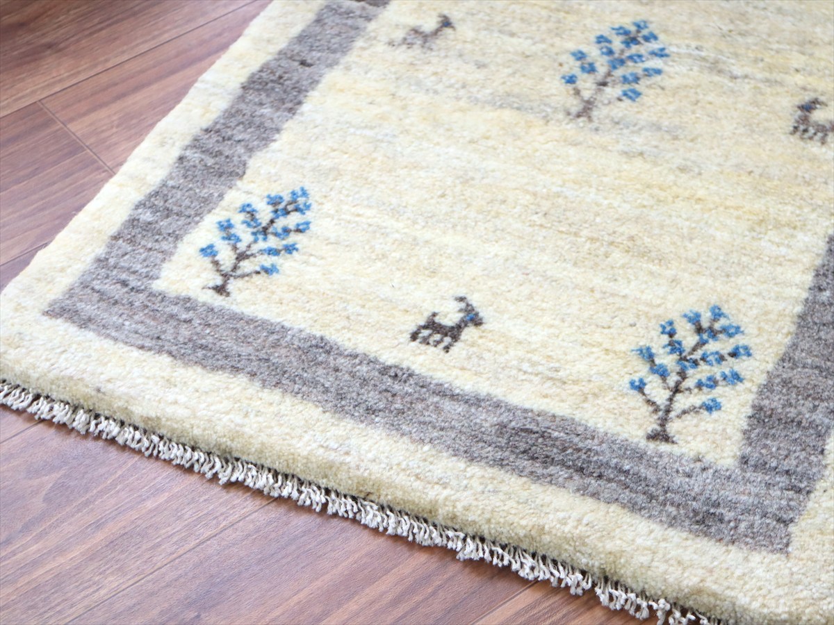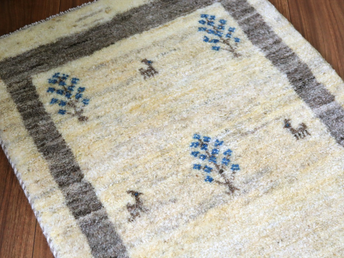 天然の羊毛の色をそのまま使って織られた素朴なナチュラルカラーをベースに、動物と生命の樹が織られています。