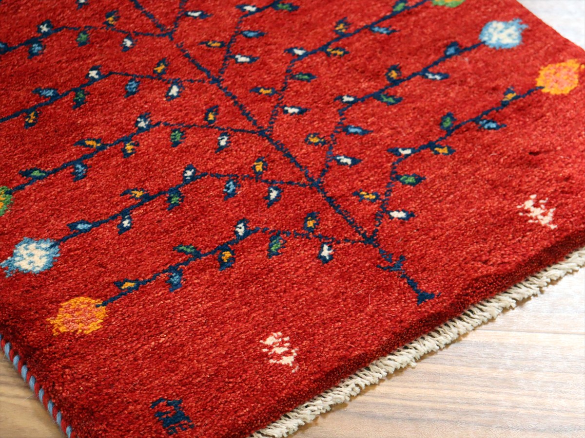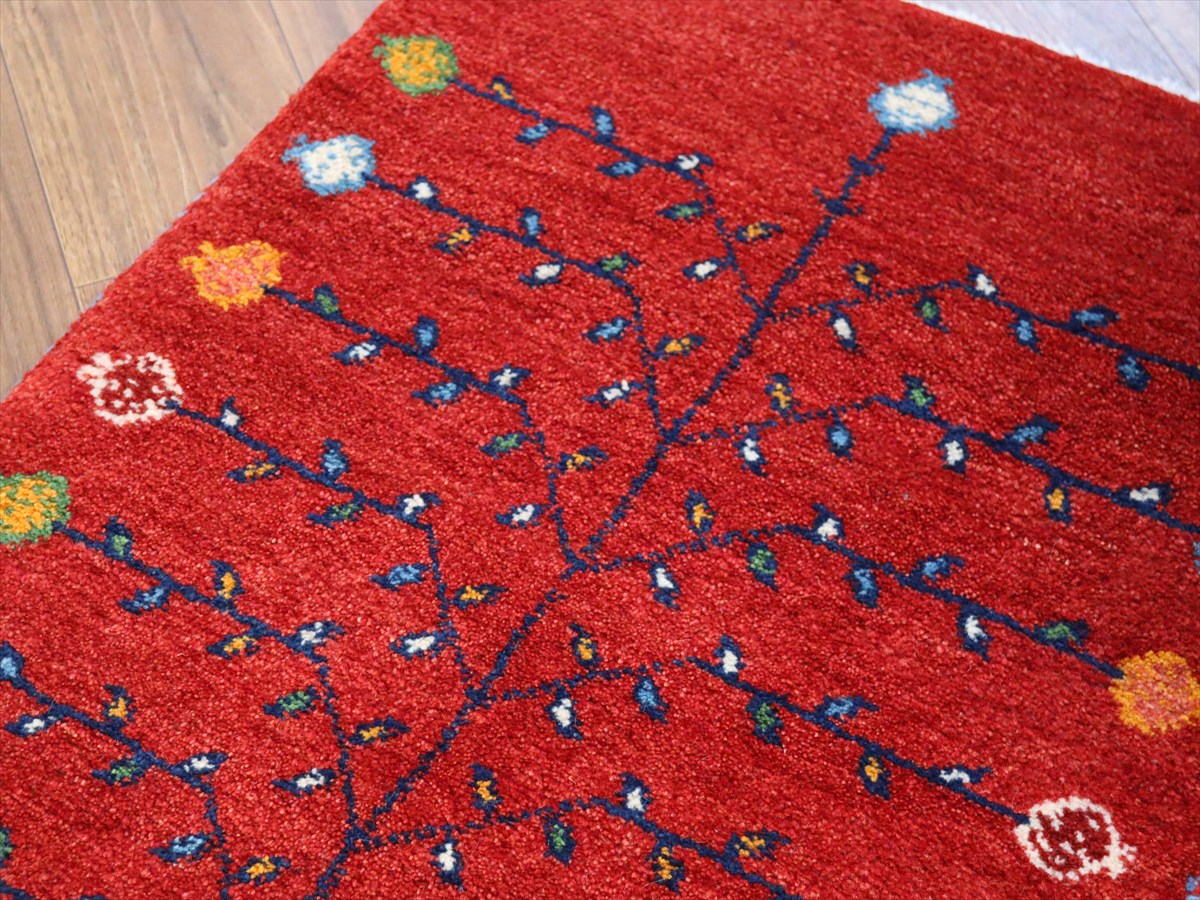 発色のきれいな明るいレッドをベースに、カラフルな葉っぱとザクロの生命の樹が一面に織られています。小さい生命の樹と動物モチーフも織られています。