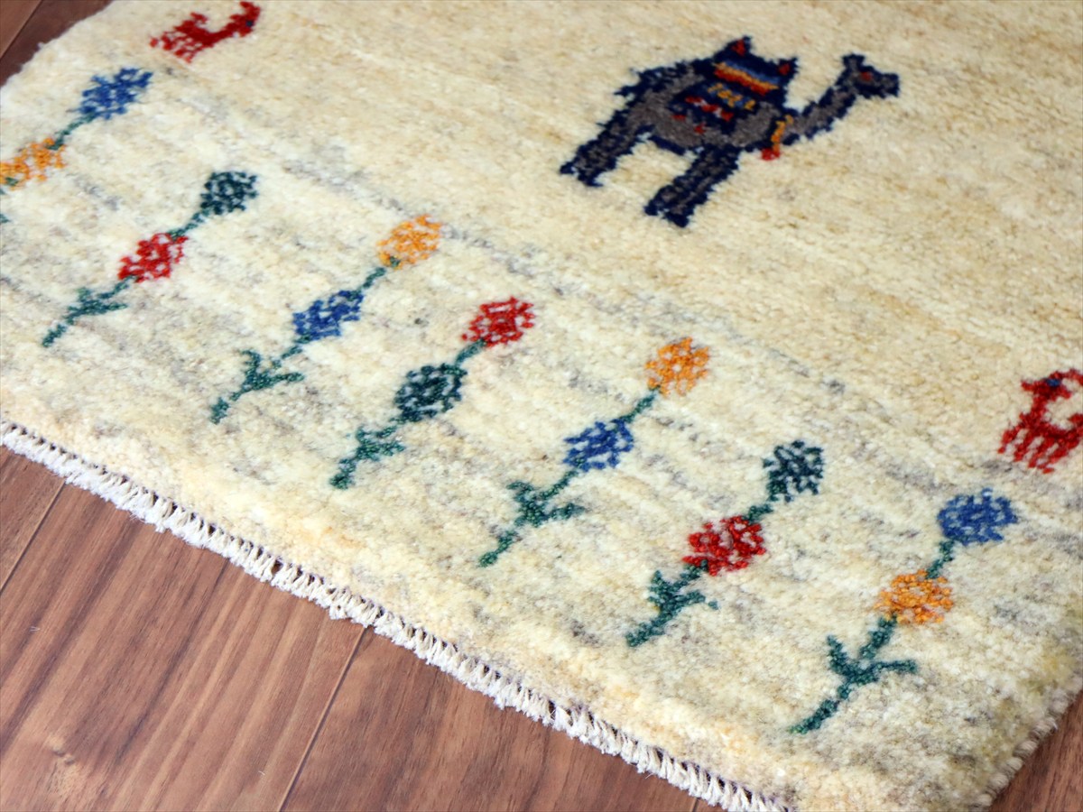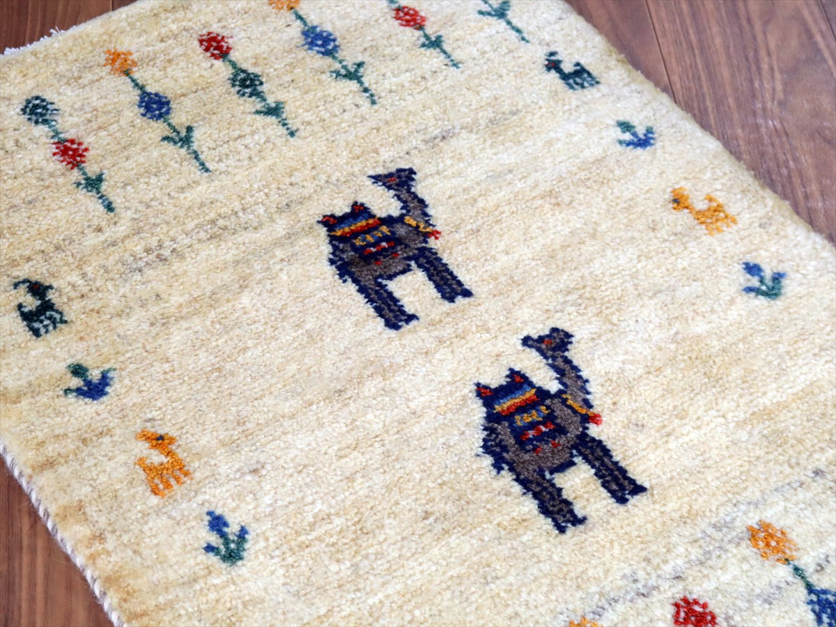 天然の羊毛の色をそのまま使って織られた素朴なナチュラルカラーをベースに、カラフルなフラワーと生命の樹と動物。中央にはラクダが織られています。