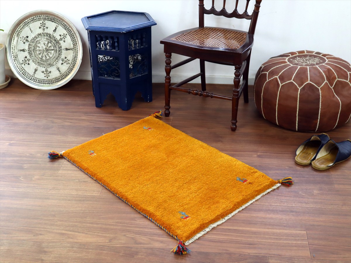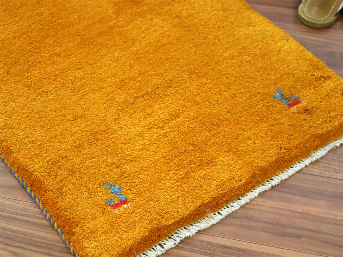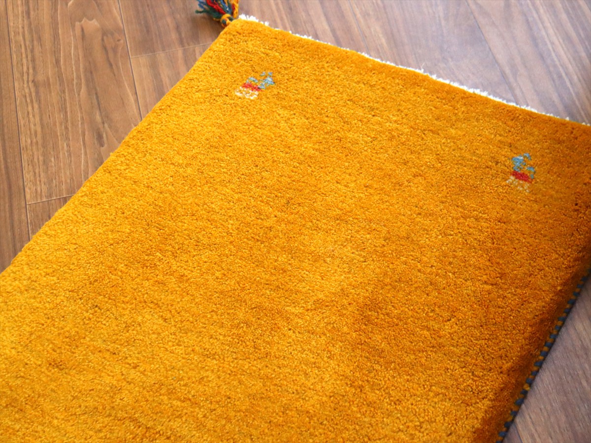 発色のキレイな明るいイエローオレンジをベースに、四隅に動物モチーフが織り込まれた、定番デザインのシンプルな一枚。