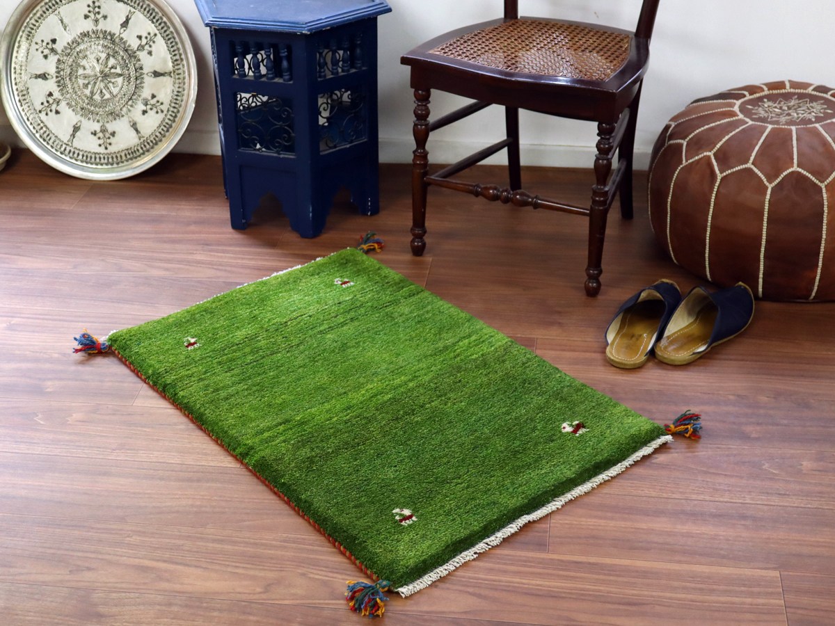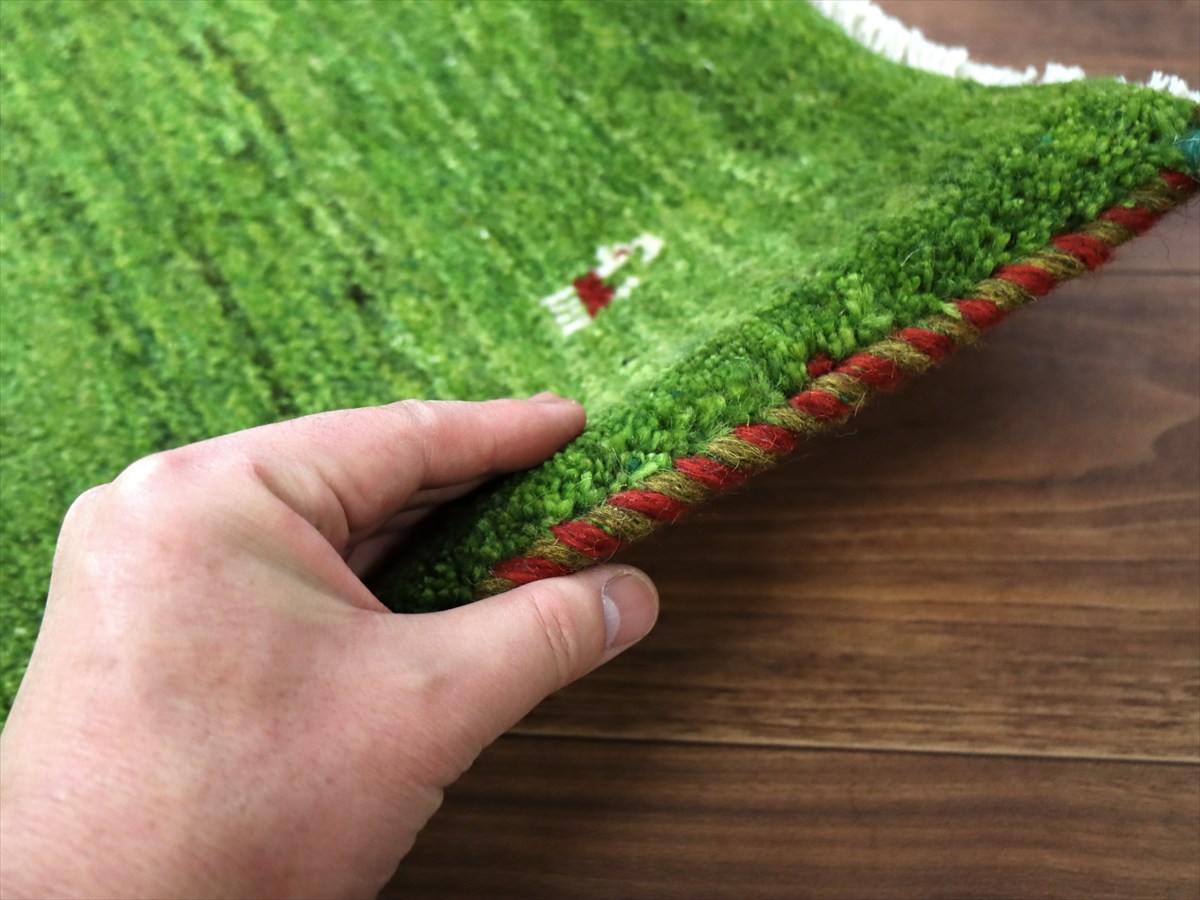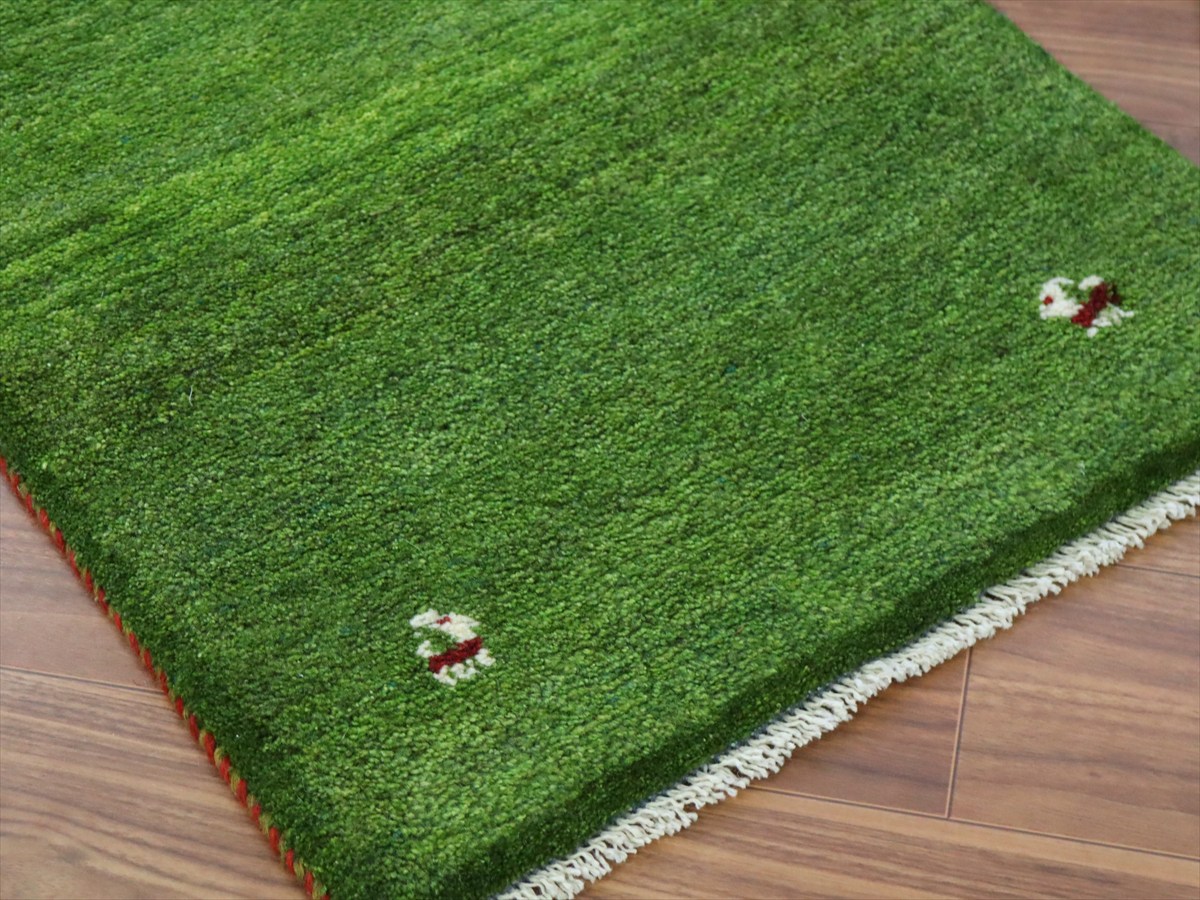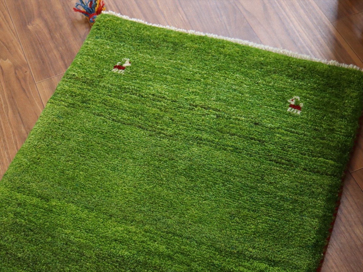 鮮やかなグリーンのグラデーションをベースに、四隅に動物が織られてたシンプルなギャッベ。