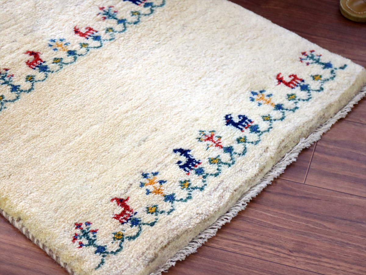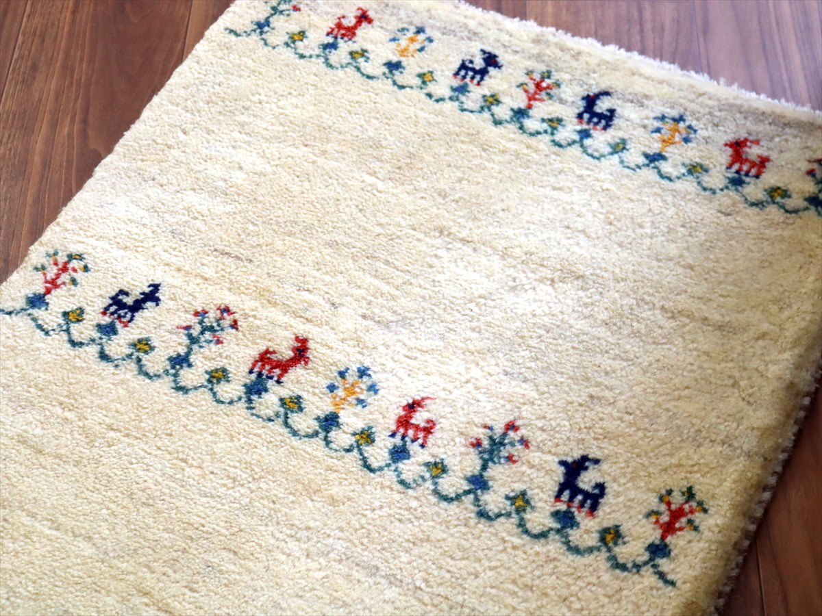 天然の羊毛の色をそのまま使って織られた素朴なナチュラルカラーをベースに、カラフルな生命の樹と動物モチーフが織られています。