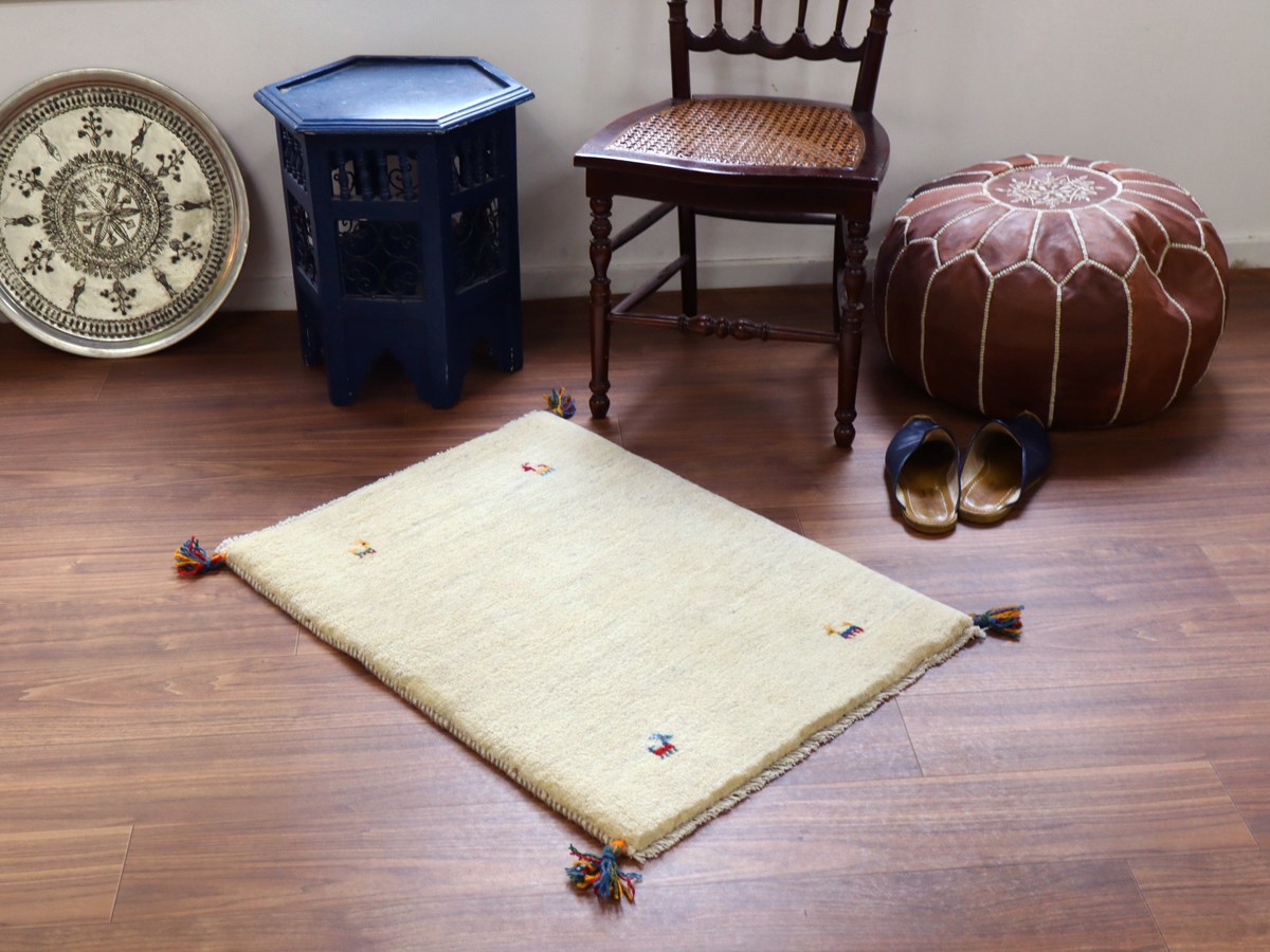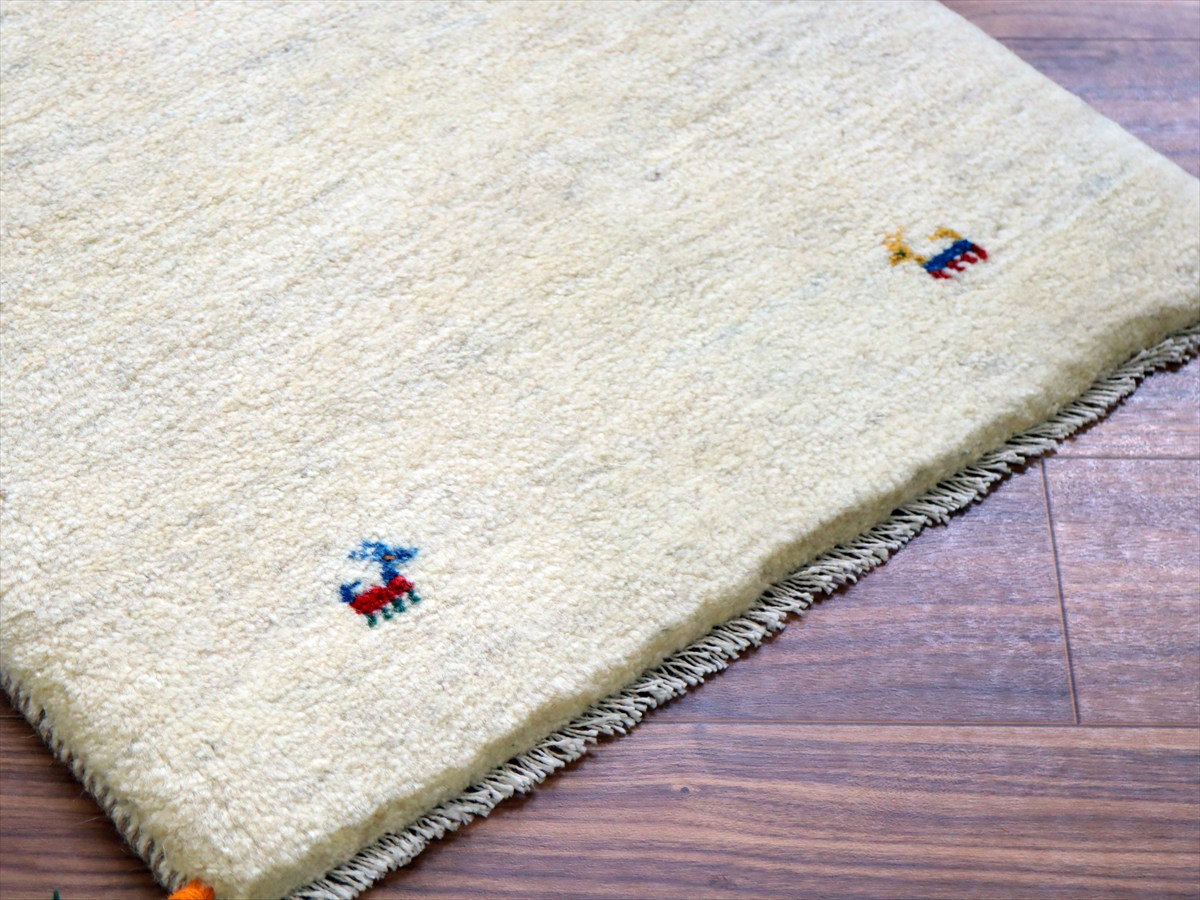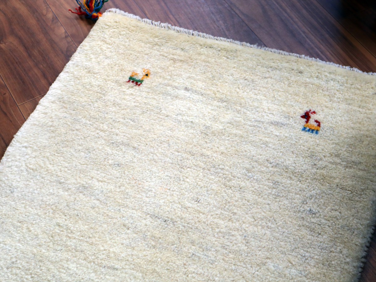 天然の羊毛の色をそのまま使って織られた素朴なナチュラルカラーをベースに、四隅に動物が織られているシンプルなデザイン。