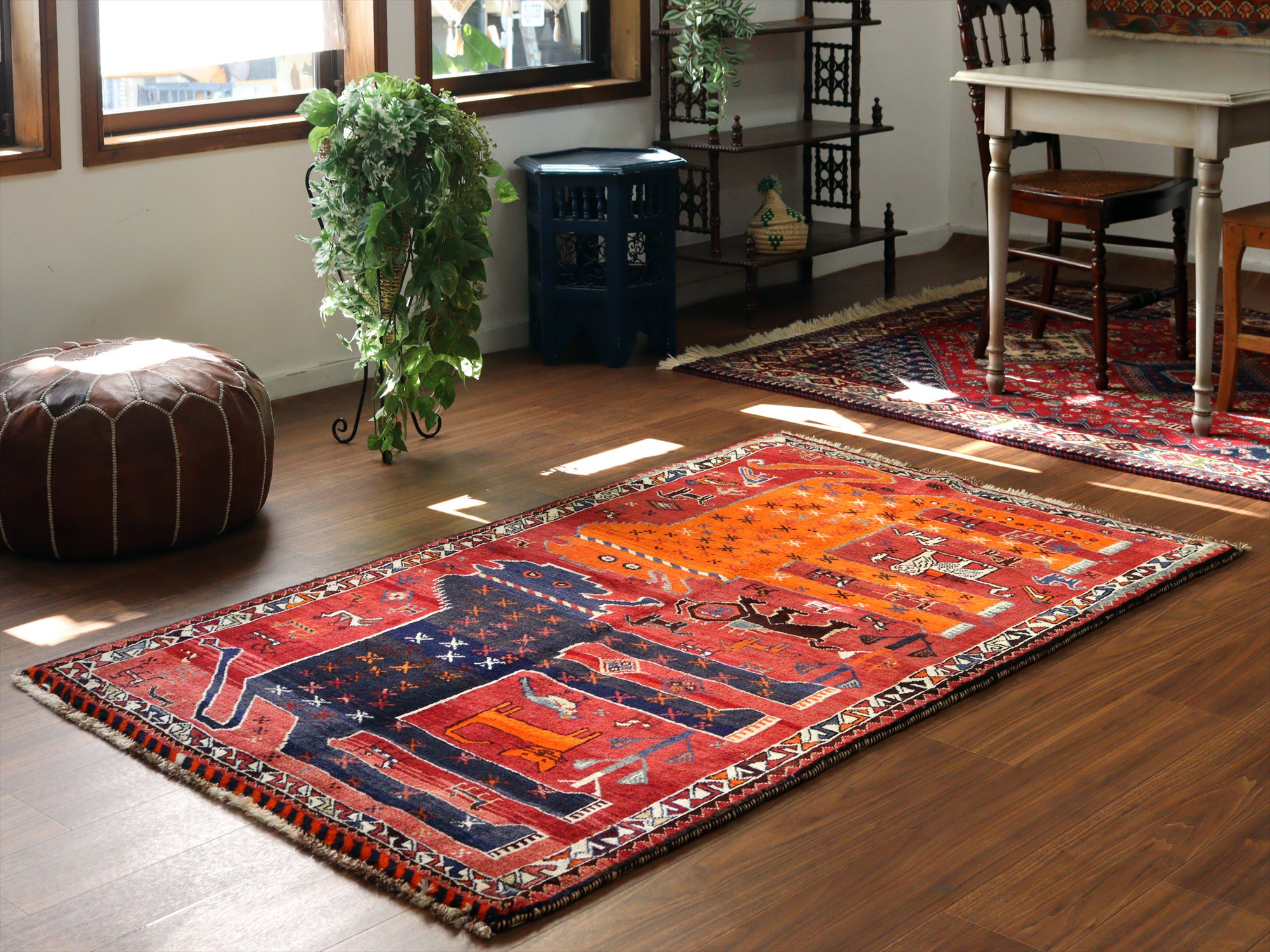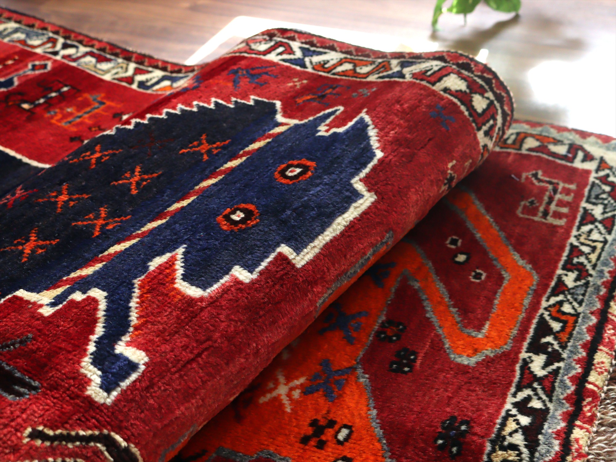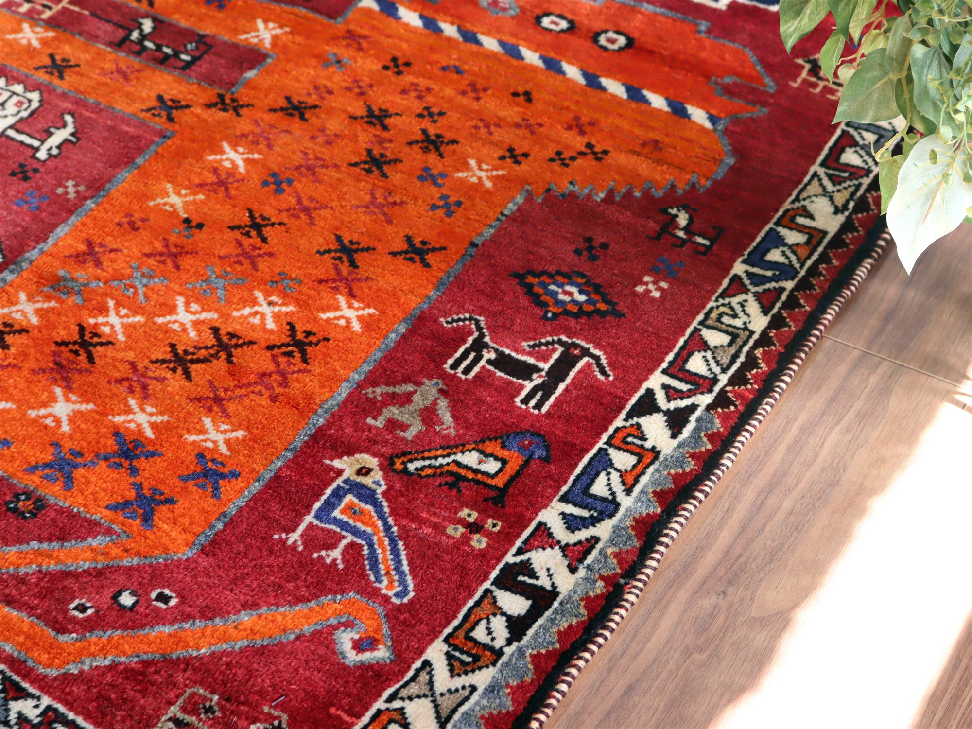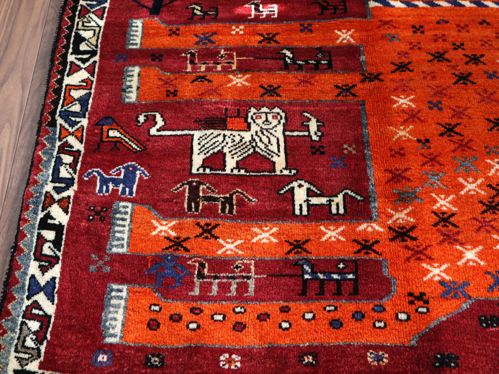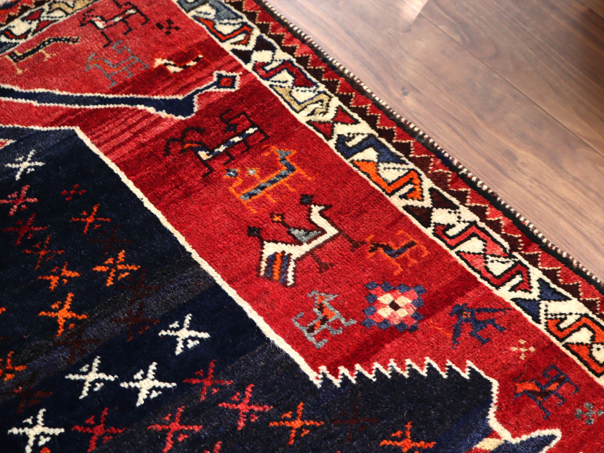 織られてから50年以上が経過したものと推測されます。もっとも特徴があるのは、ボーダー(額縁)デザインのさらに外側にもう一列別のパターンの飾りボーダーが織られているところで、近年商業用に織られているラグには見られないデザインです。