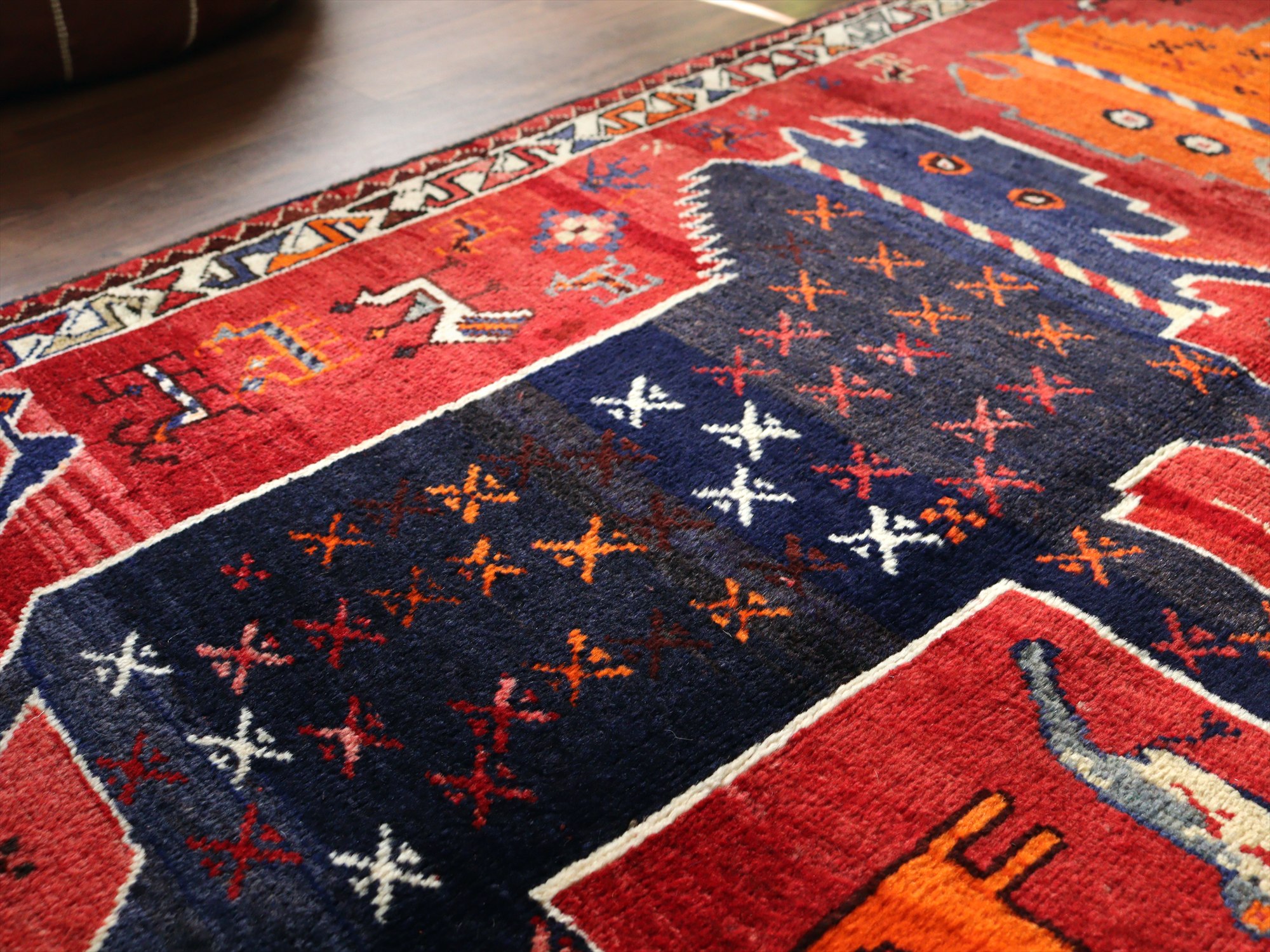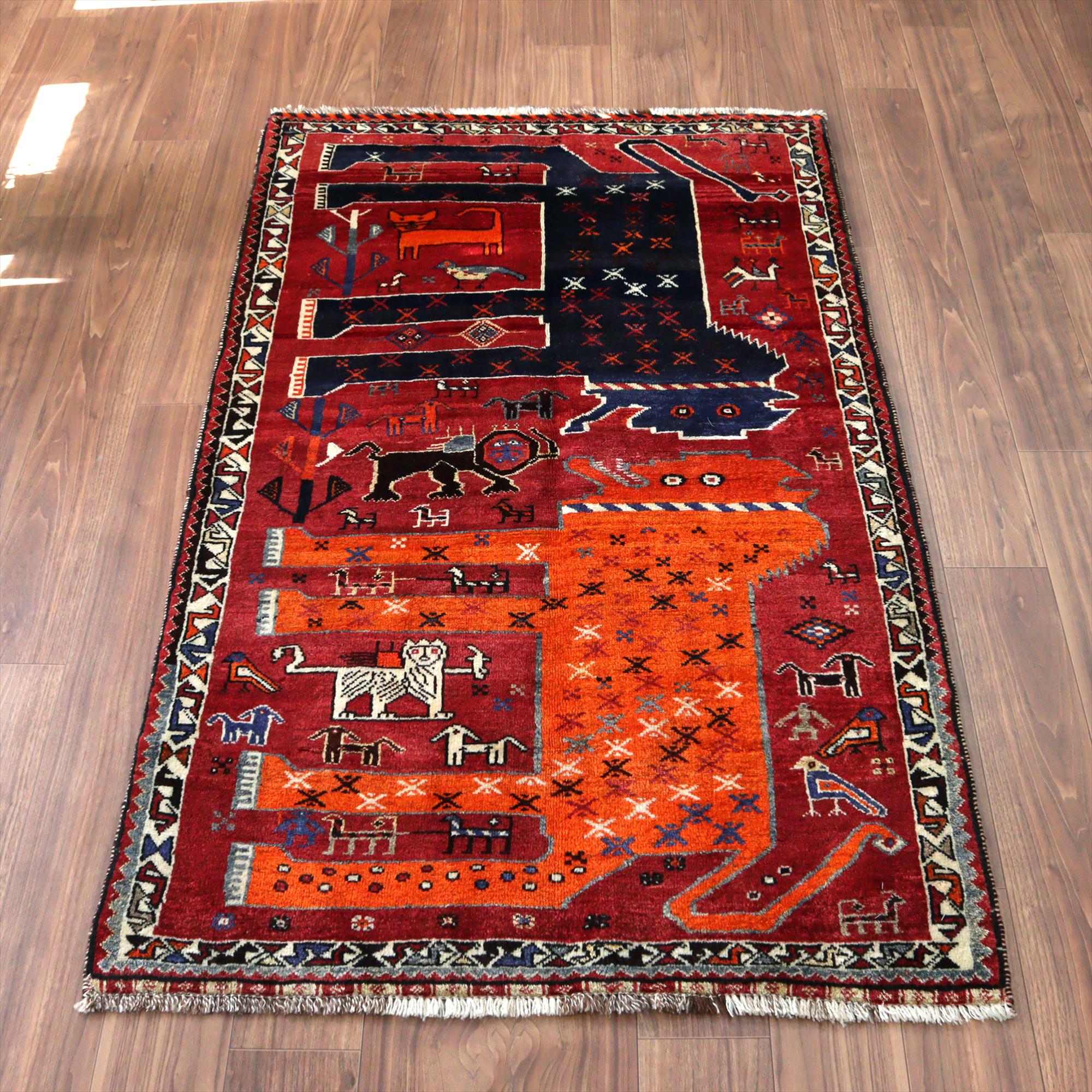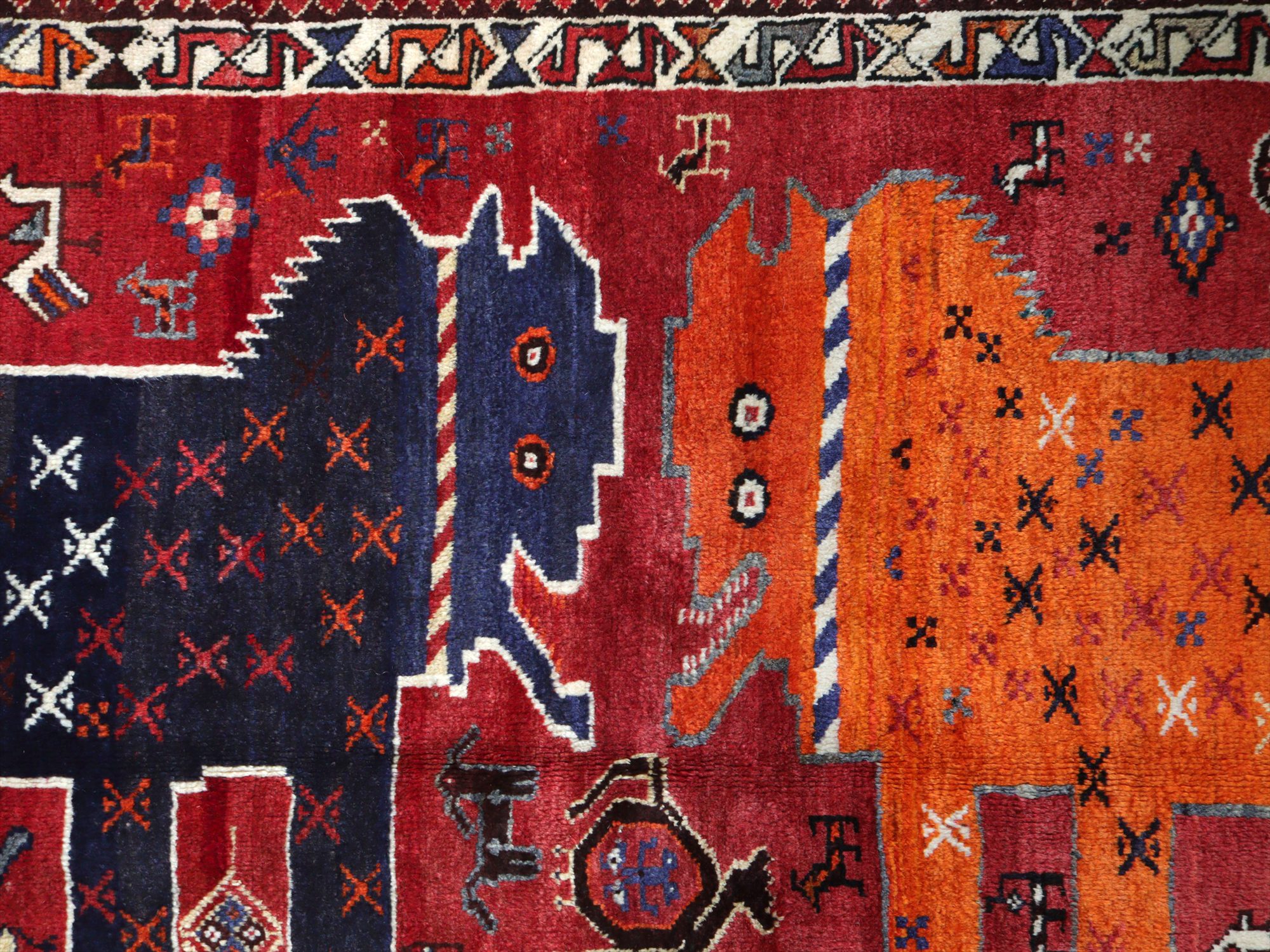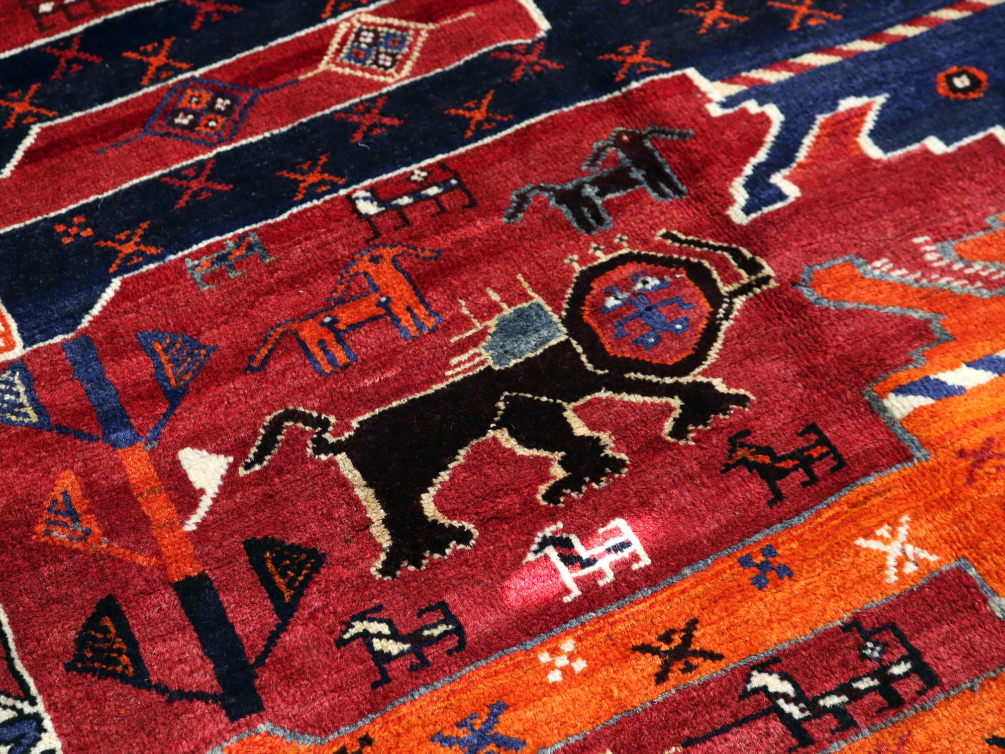 ネイビーブルーとオレンジの2頭の大きなライオンが向かい合っているデザイン。隙間のフィールドには、サーベルを持ったライオンやヤギ、鳥、草花と多くのモチーフが織られています。
