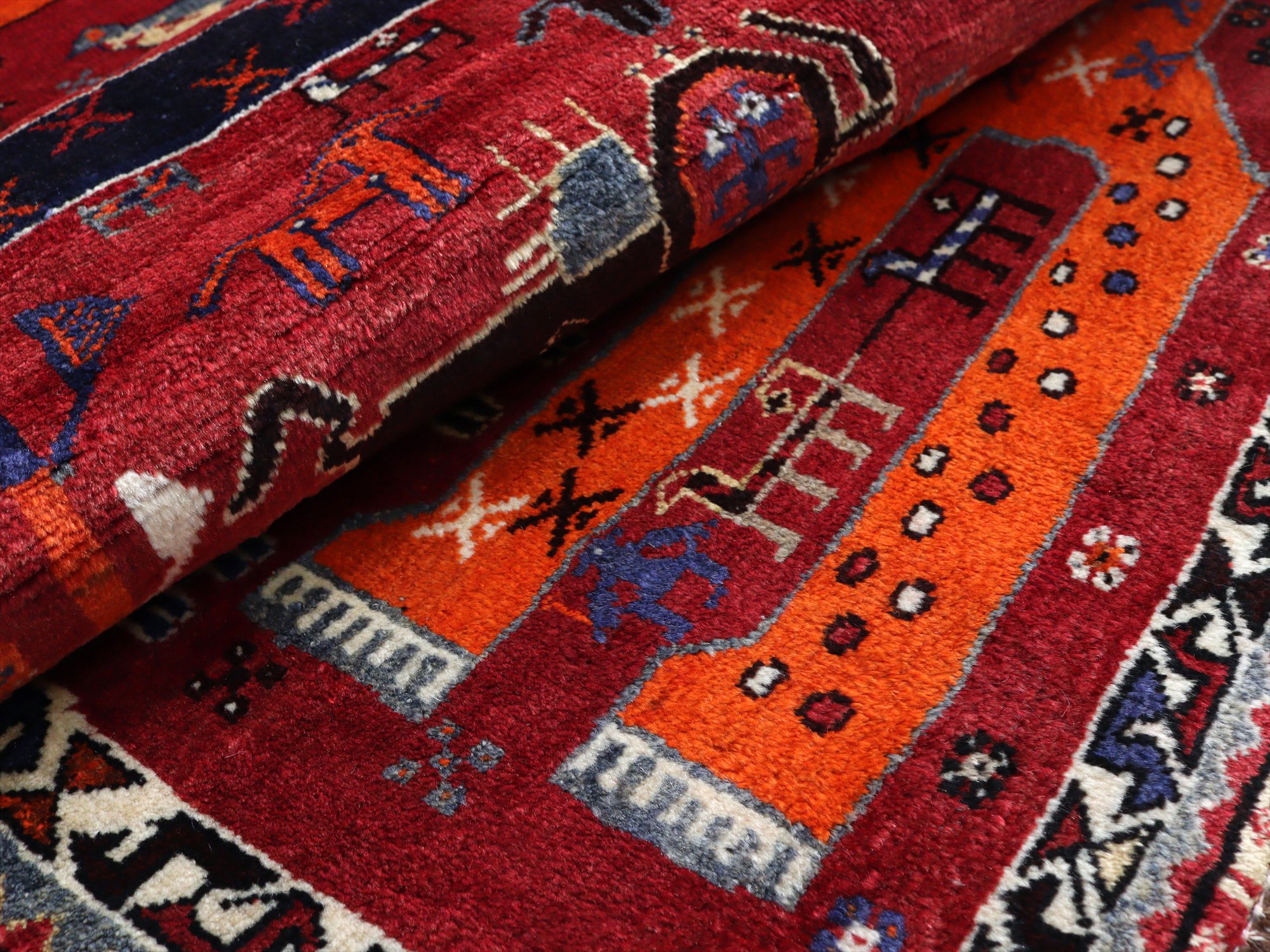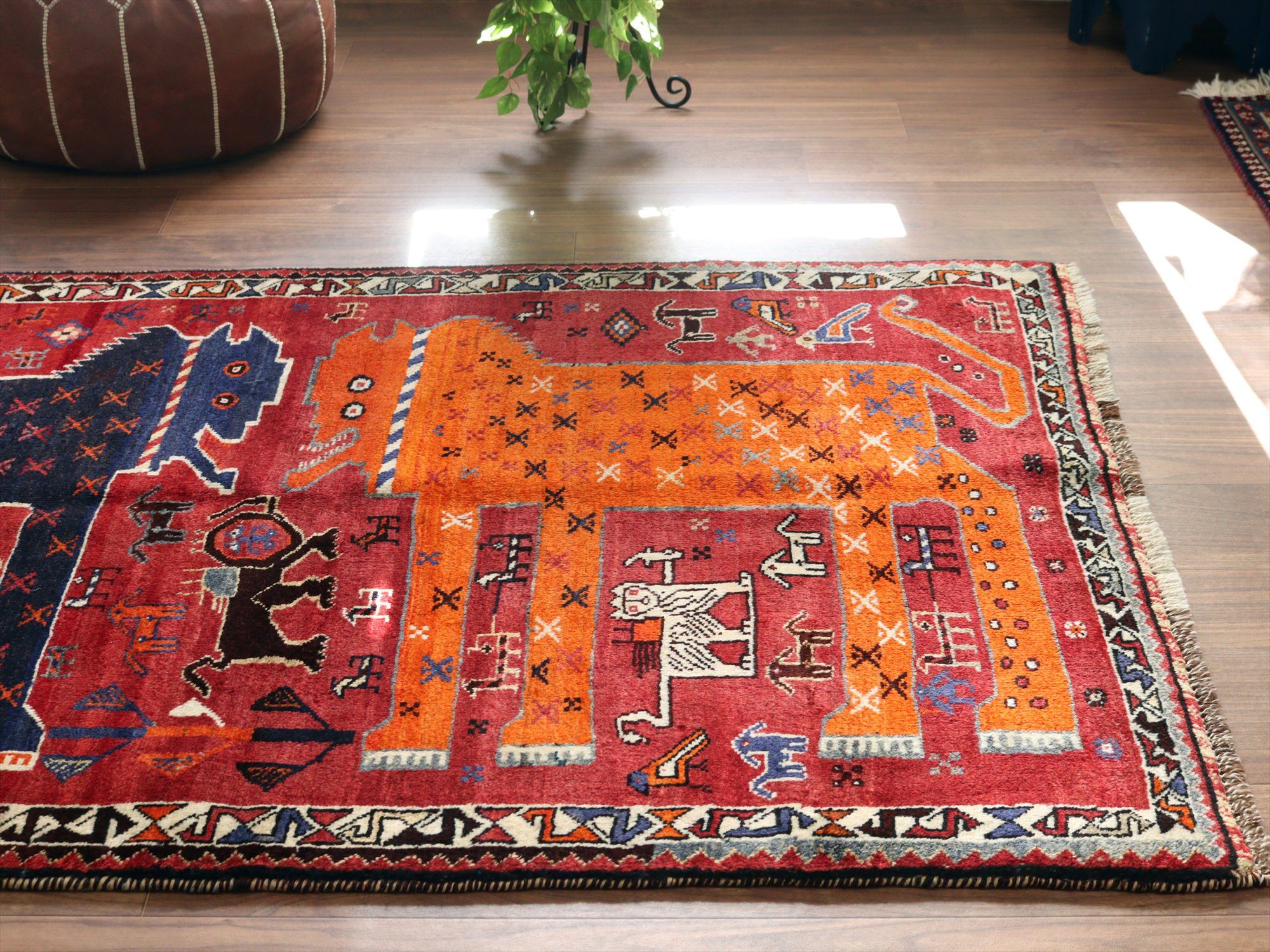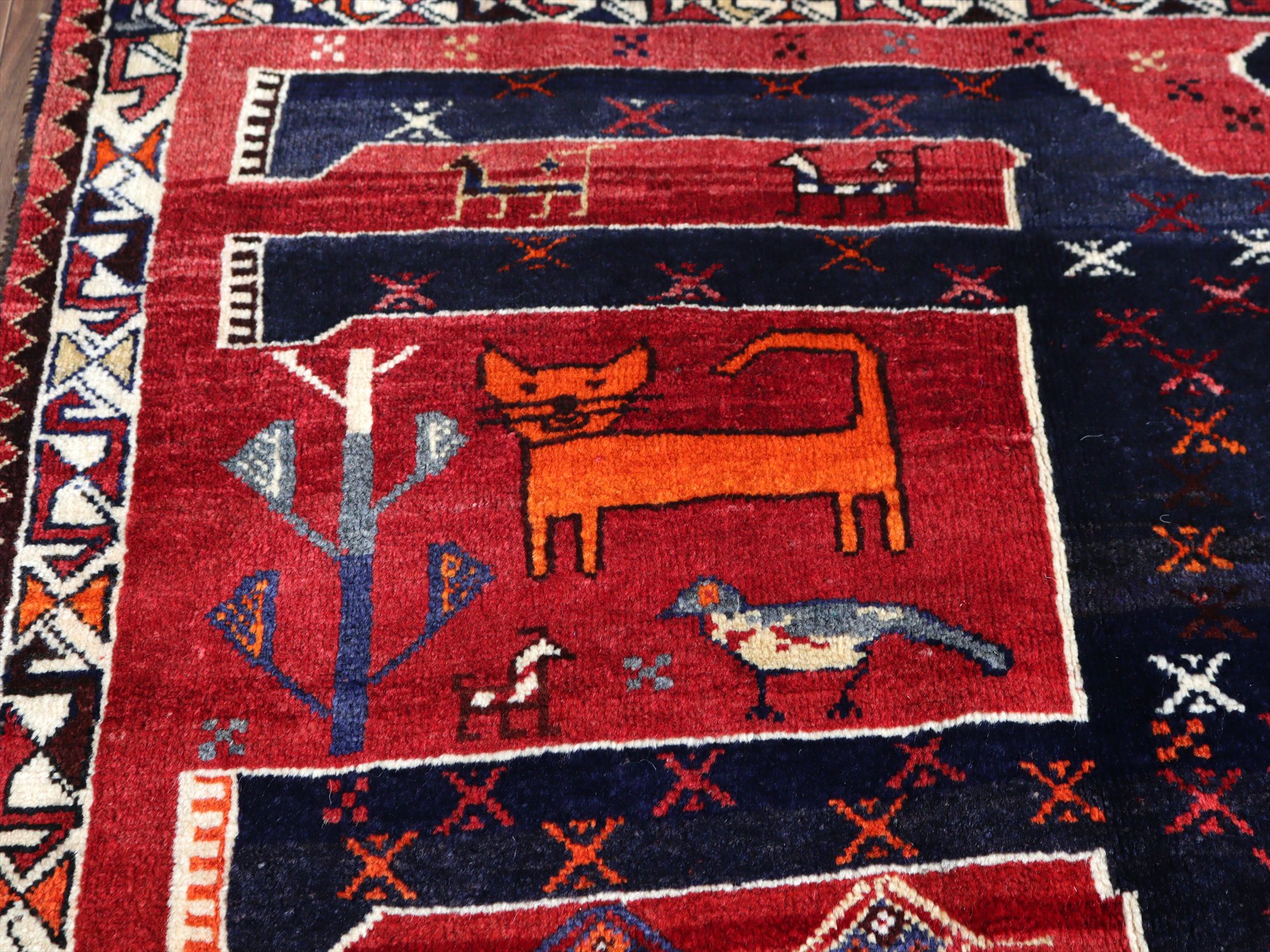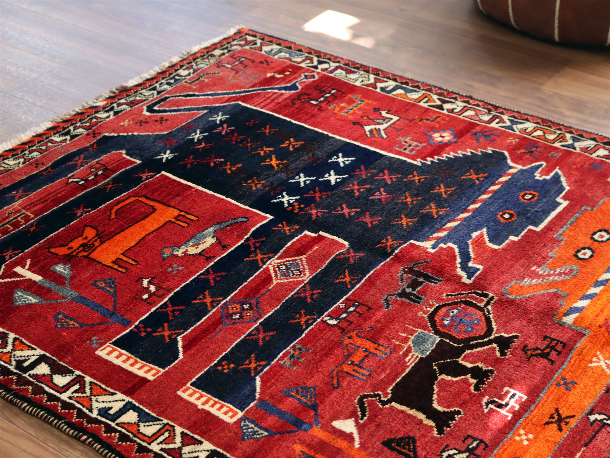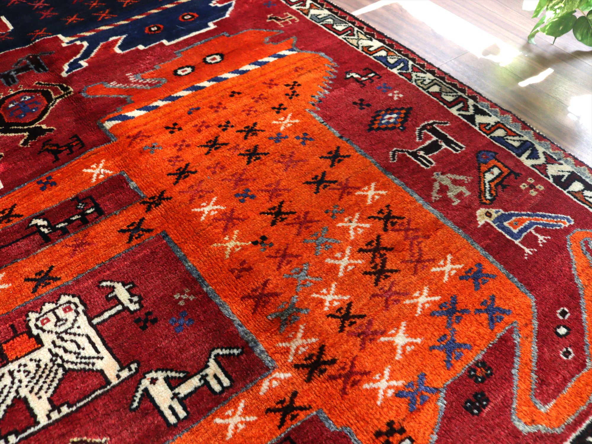 ネイビーブルーとオレンジの2頭の大きなライオンが向かい合っているデザイン。隙間のフィールドには、サーベルを持ったライオンやヤギ、鳥、草花と多くのモチーフが織られています。