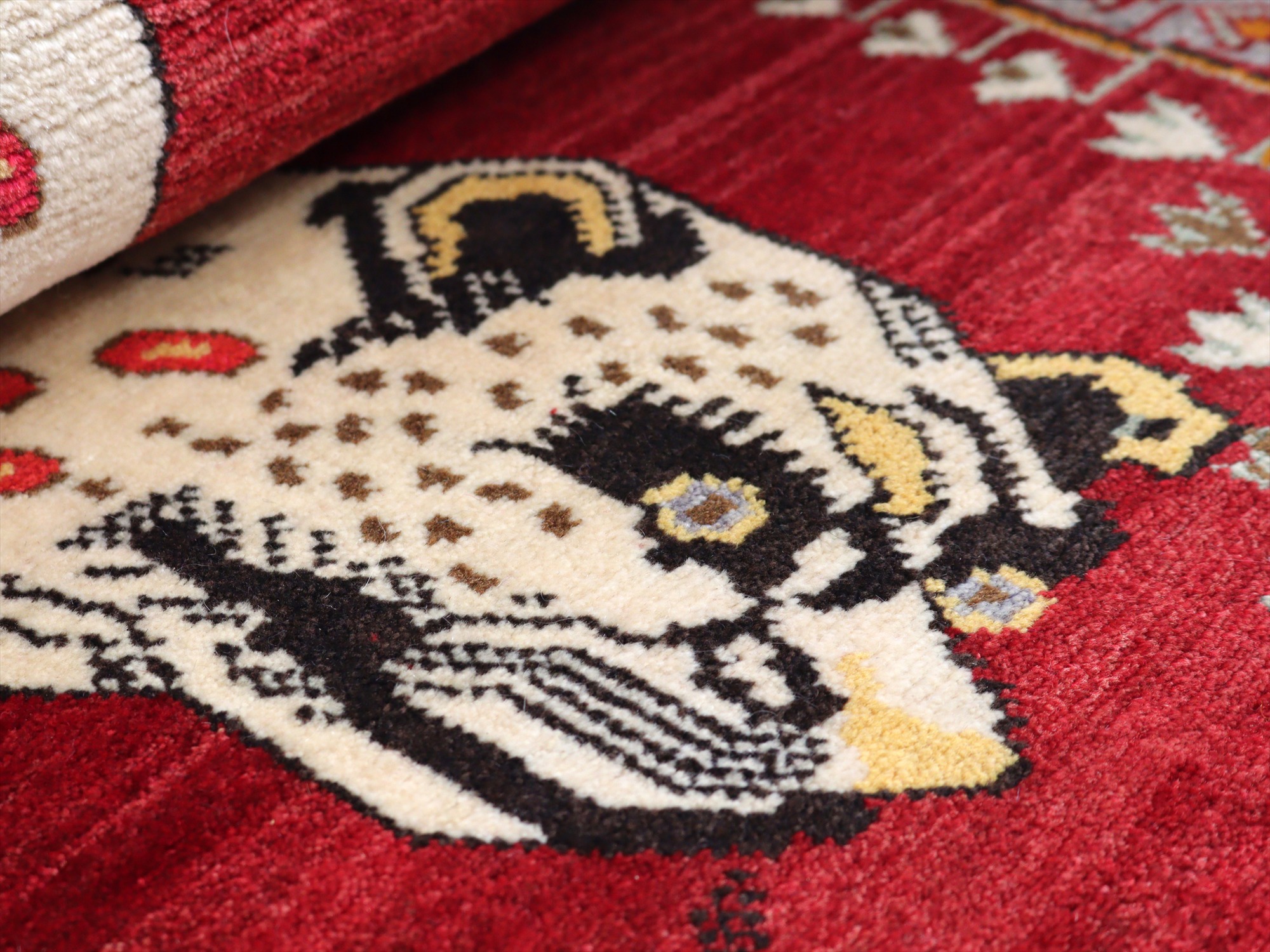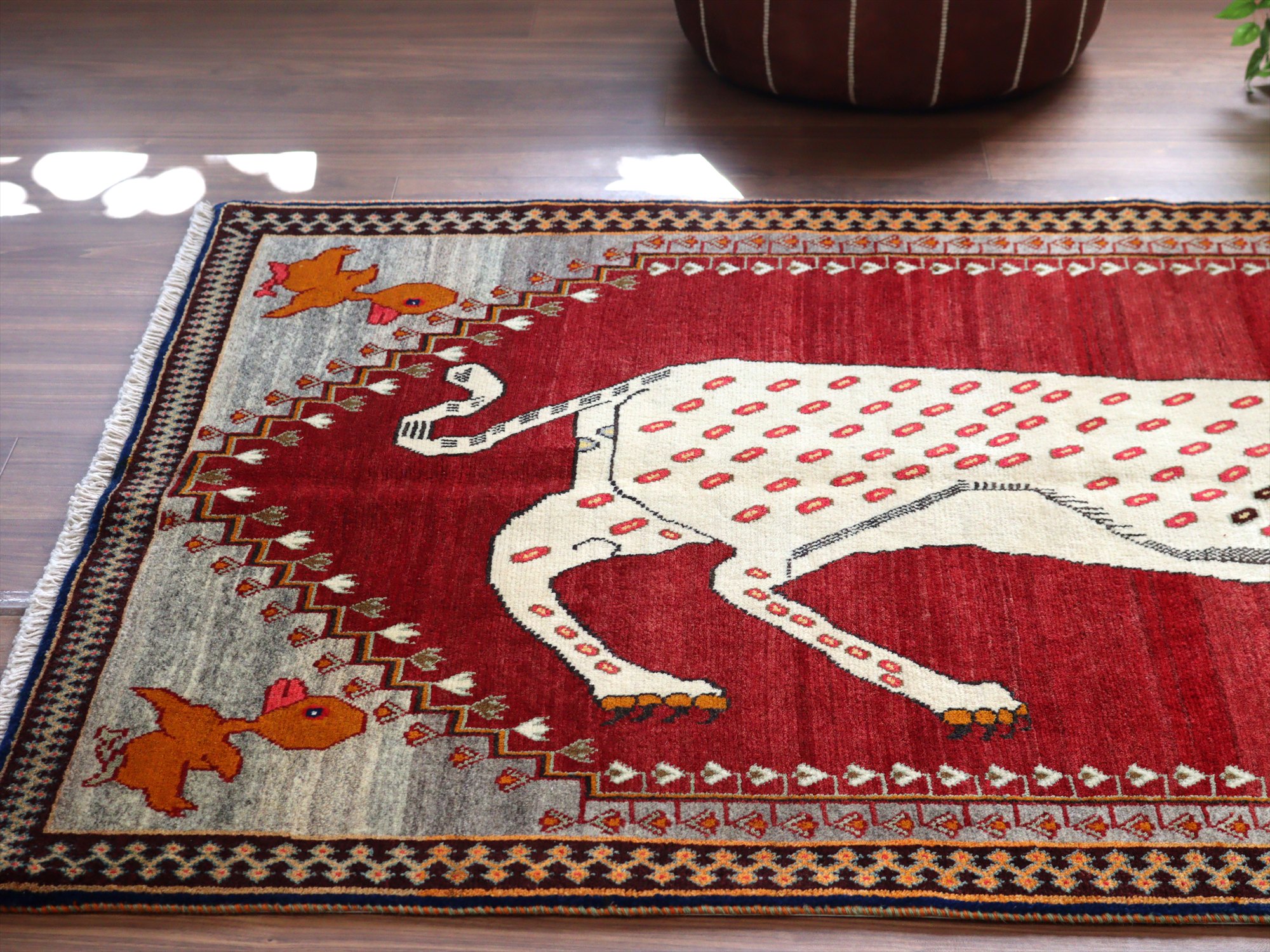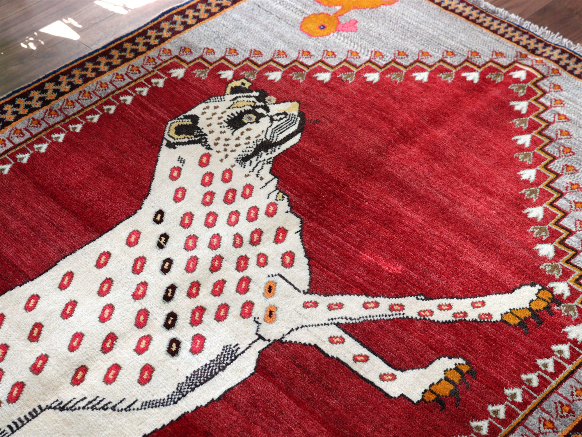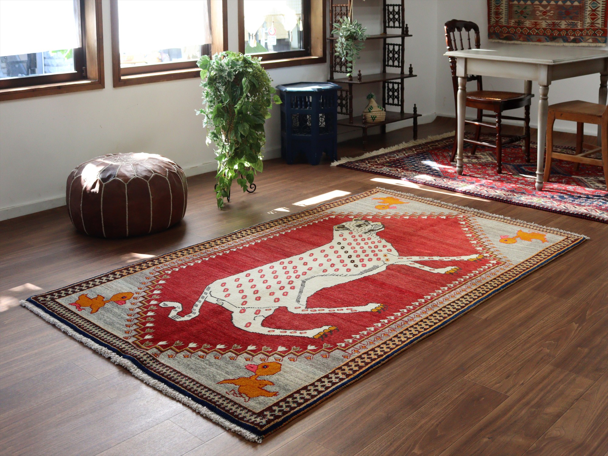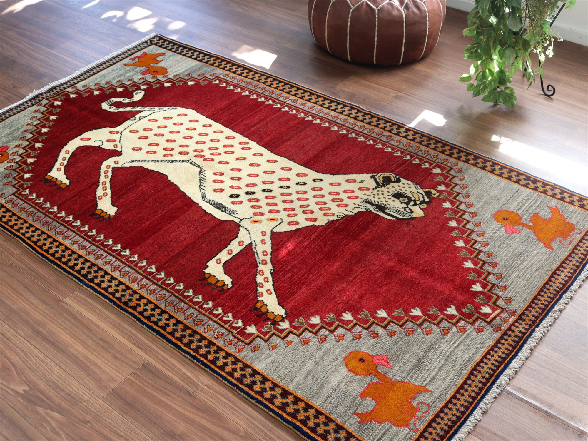 精悍な顔つきのヒョウが六角形のメダリオンの中に織られたデザイン。迫力あるヒョウとは対照的に、四隅のアヒルは脱力感たっぷりのゆるーい感じで表現されているのが面白いです。このアヒルのおかげで、数あるライオンラグの中でも特別にユニークな一枚と言えそうです。