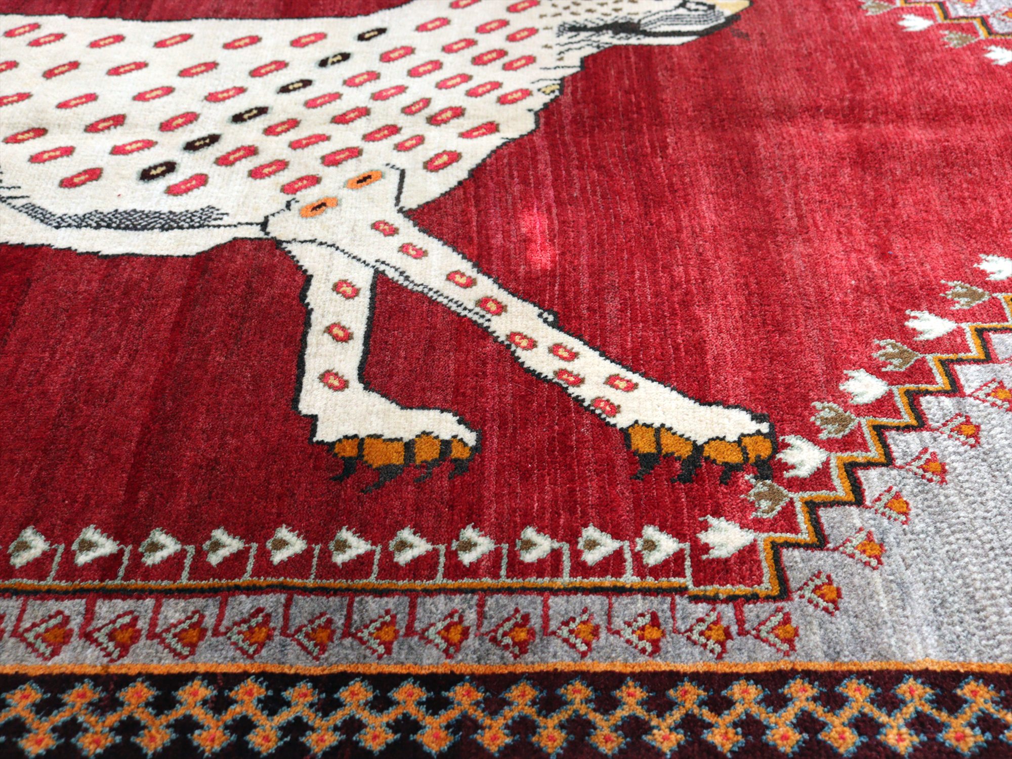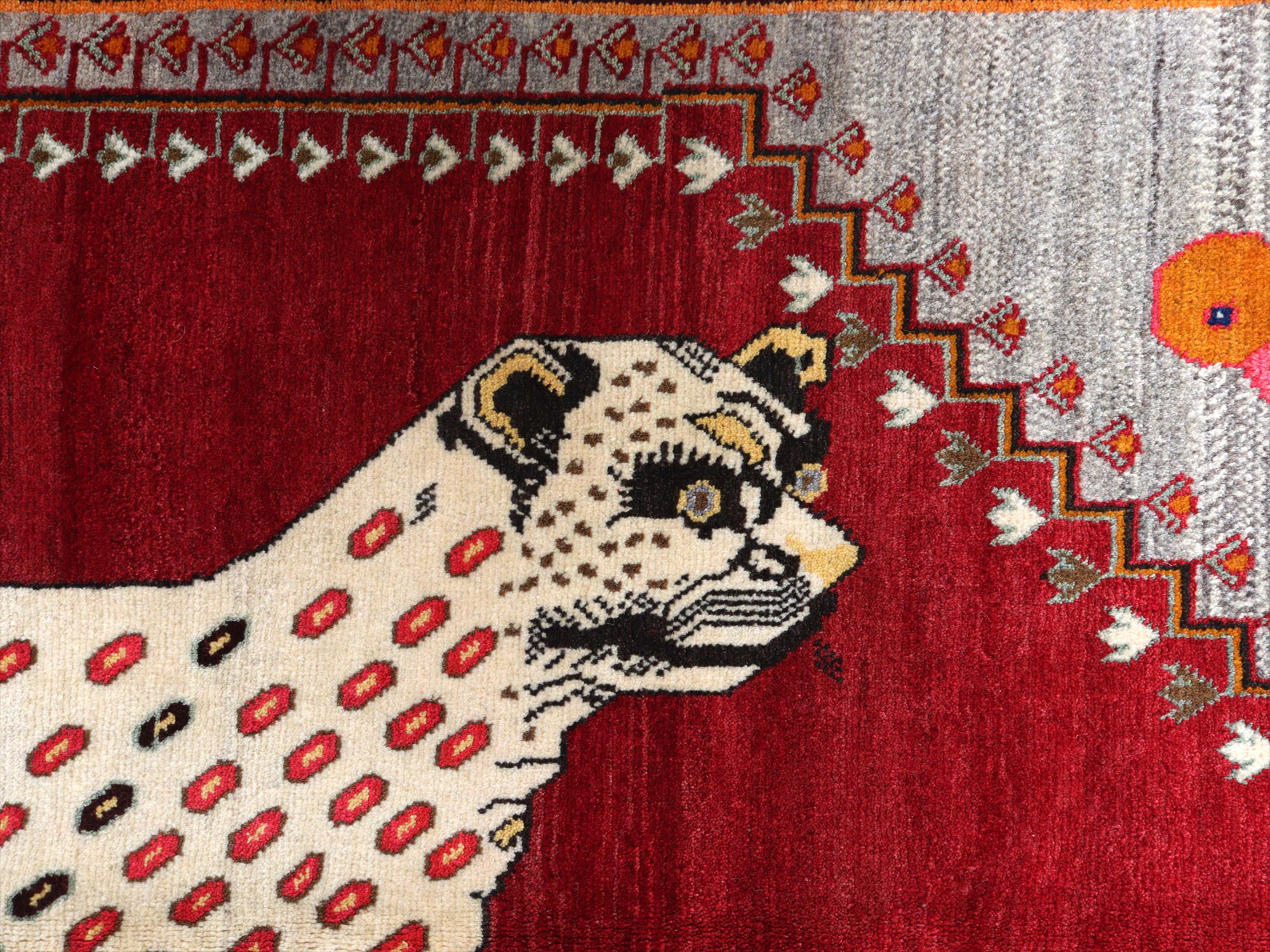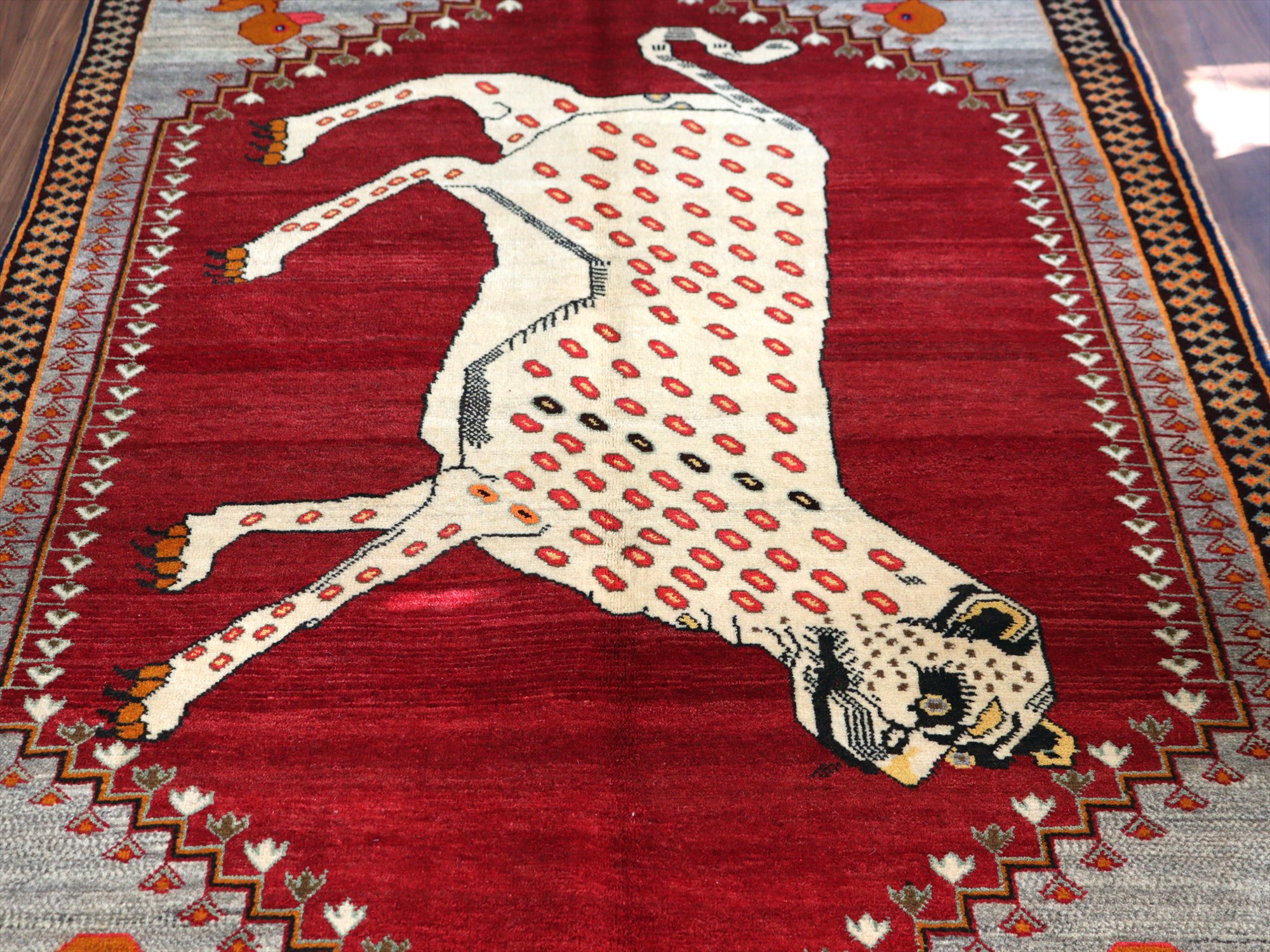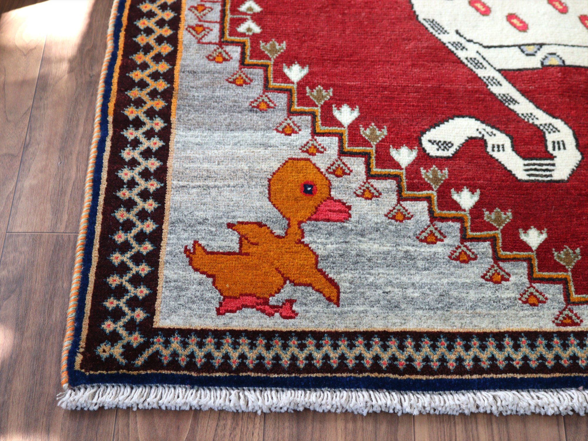精悍な顔つきのヒョウが六角形のメダリオンの中に織られたデザイン。迫力あるヒョウとは対照的に、四隅のアヒルは脱力感たっぷりのゆるーい感じで表現されているのが面白いです。このアヒルのおかげで、数あるライオンラグの中でも特別にユニークな一枚と言えそうです。