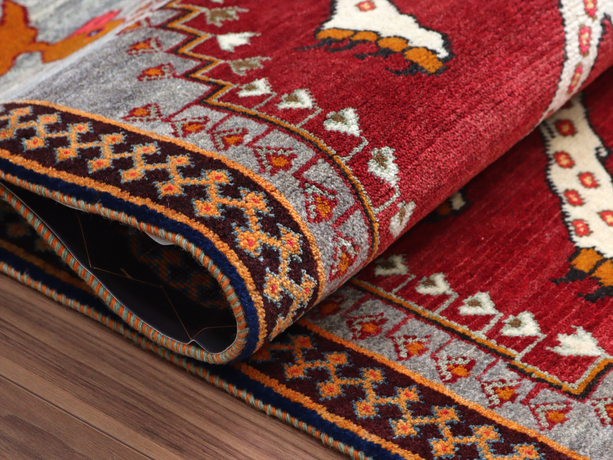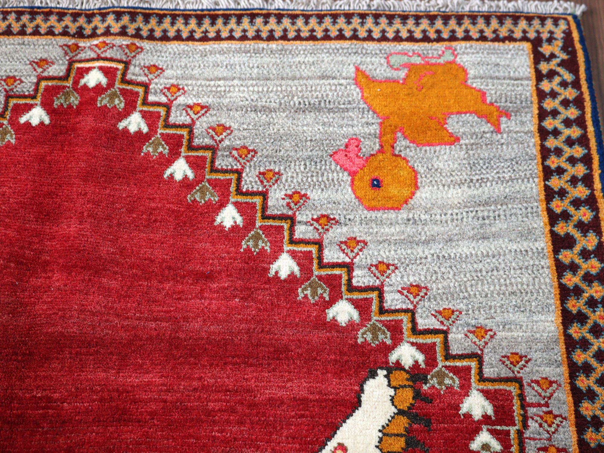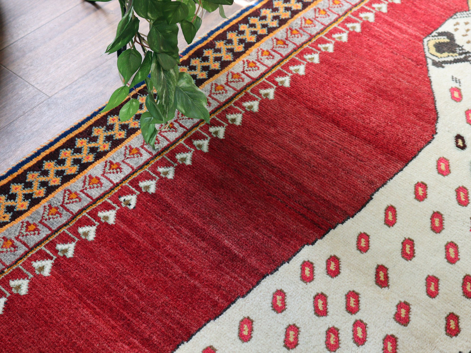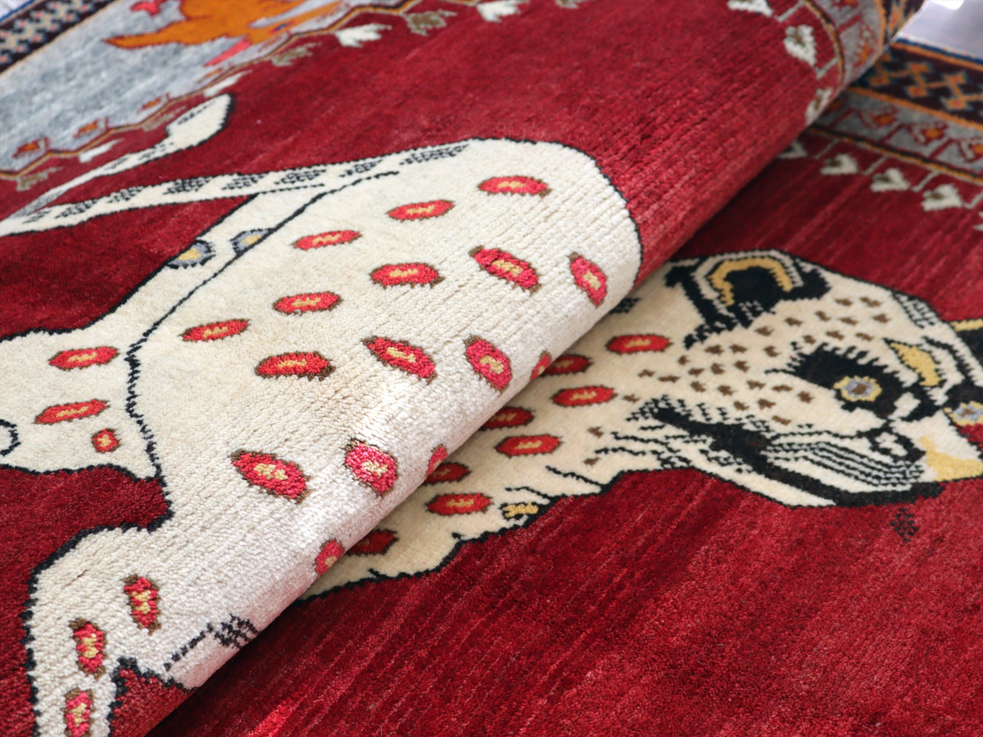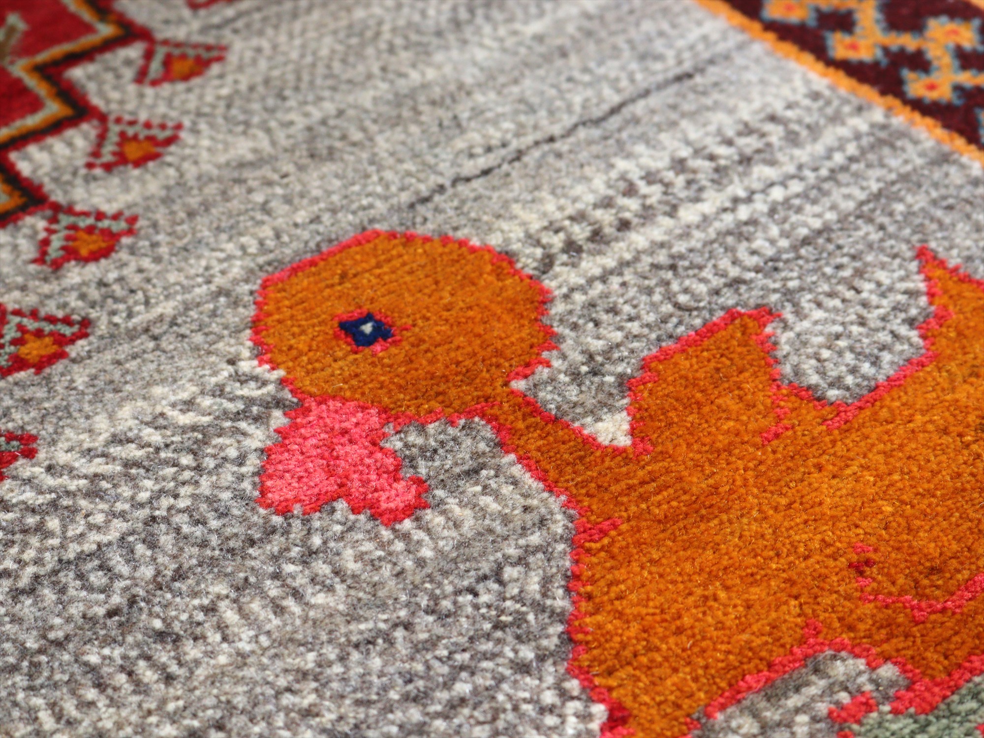 精悍な顔つきのヒョウが六角形のメダリオンの中に織られたデザイン。迫力あるヒョウとは対照的に、四隅のアヒルは脱力感たっぷりのゆるーい感じで表現されているのが面白いです。このアヒルのおかげで、数あるライオンラグの中でも特別にユニークな一枚と言えそうです。