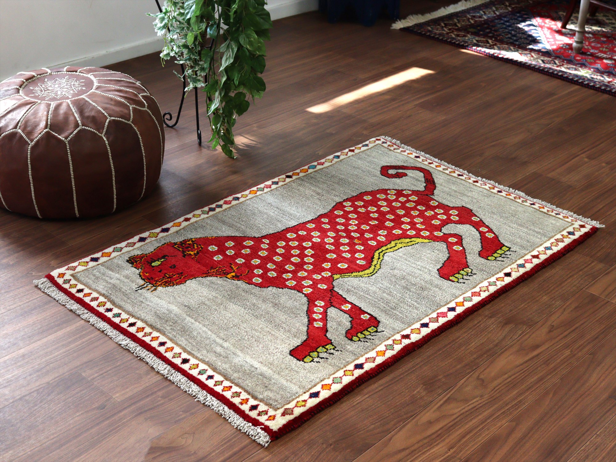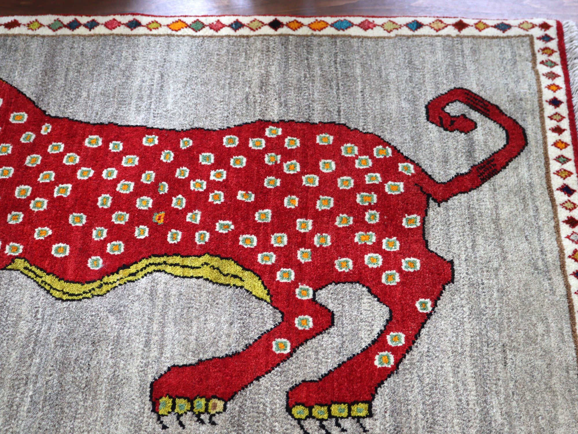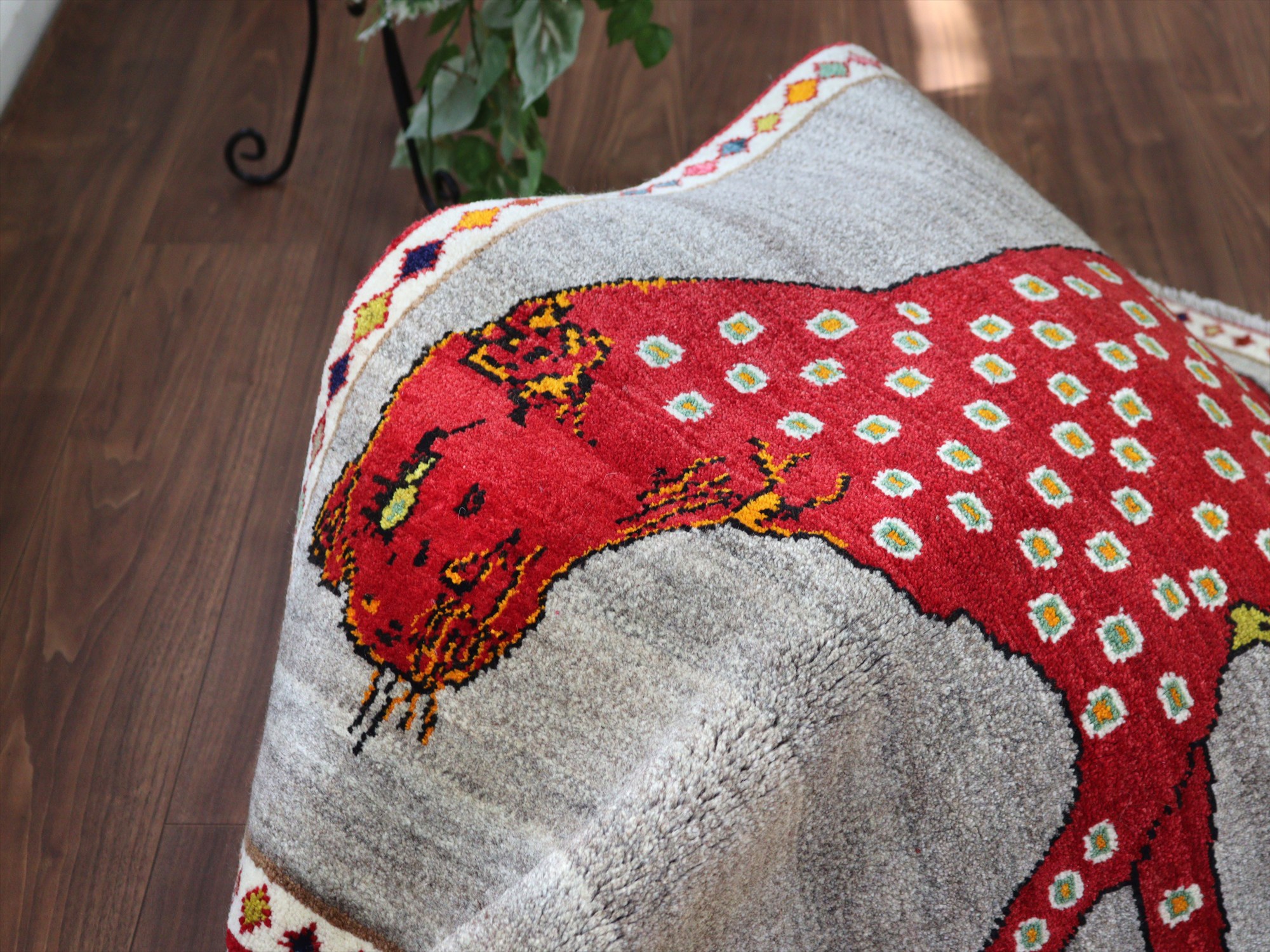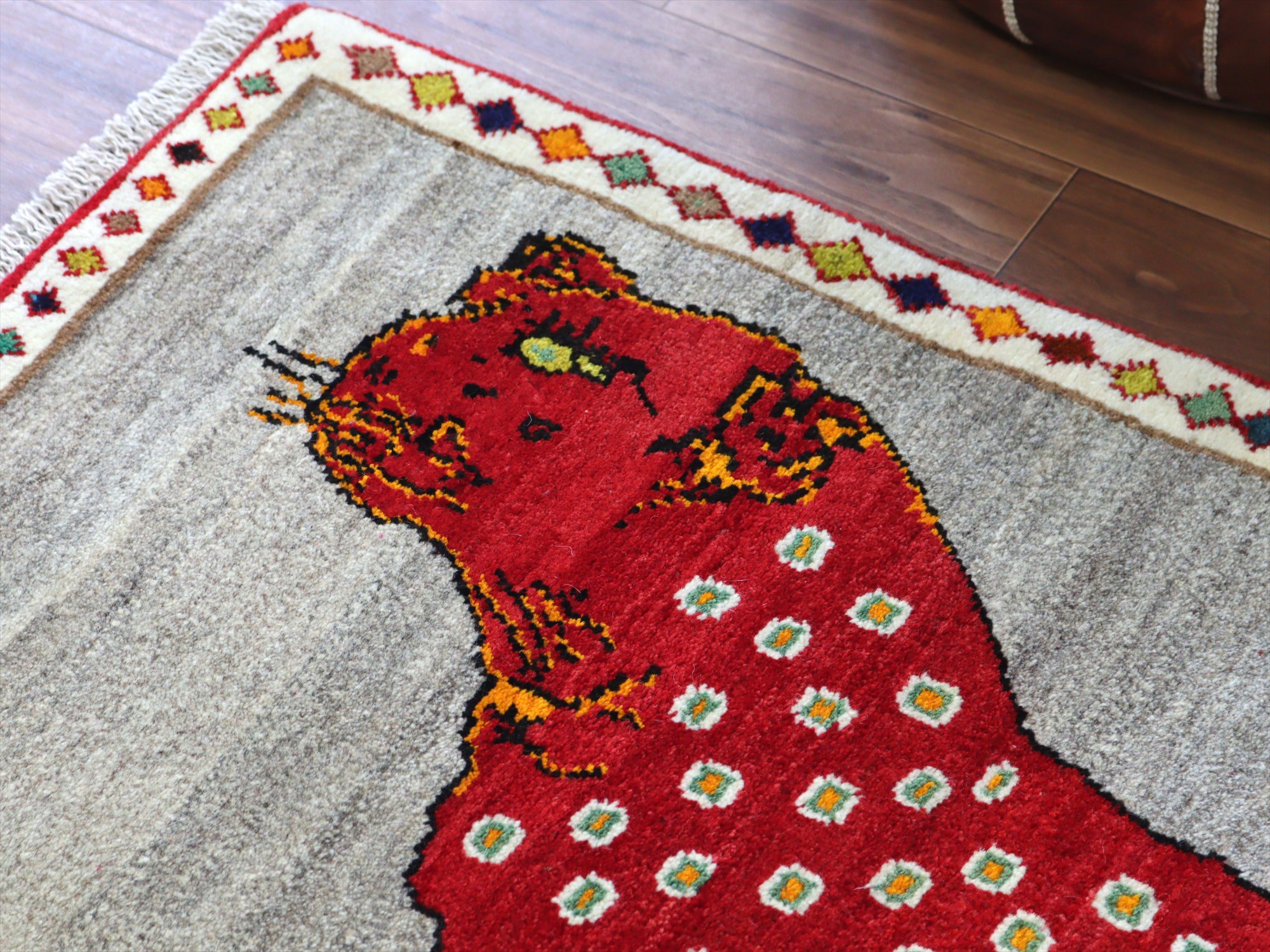 カシュカイ族の象徴でもあるライオンとともに、よく登場するヒョウのデザイン(メスのライオンとも言われています)。グレーの水玉模様とクルンと丸まった尻尾がオシャレです。