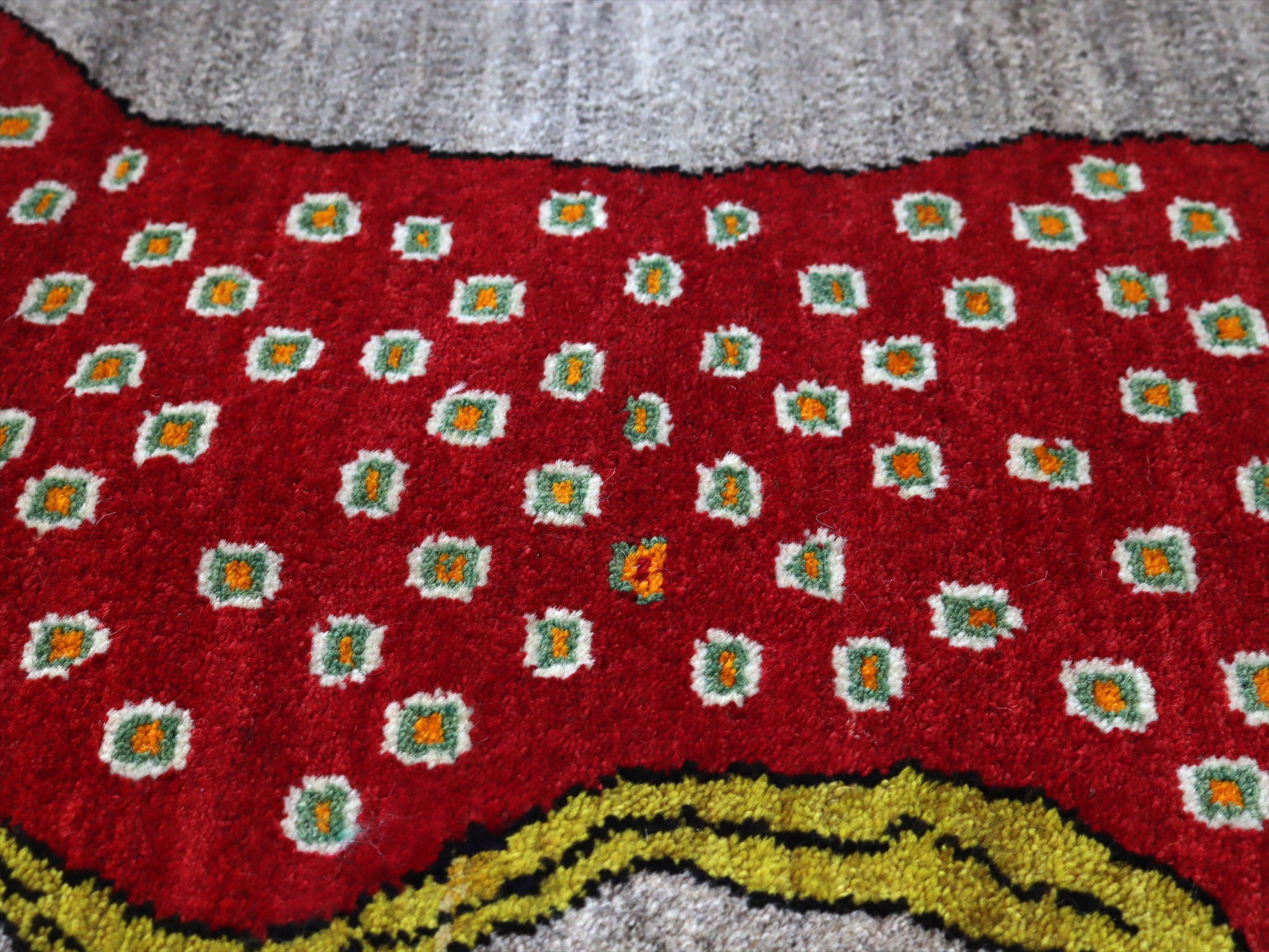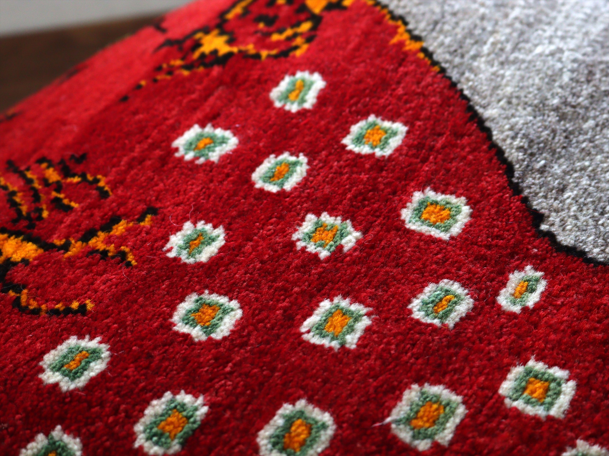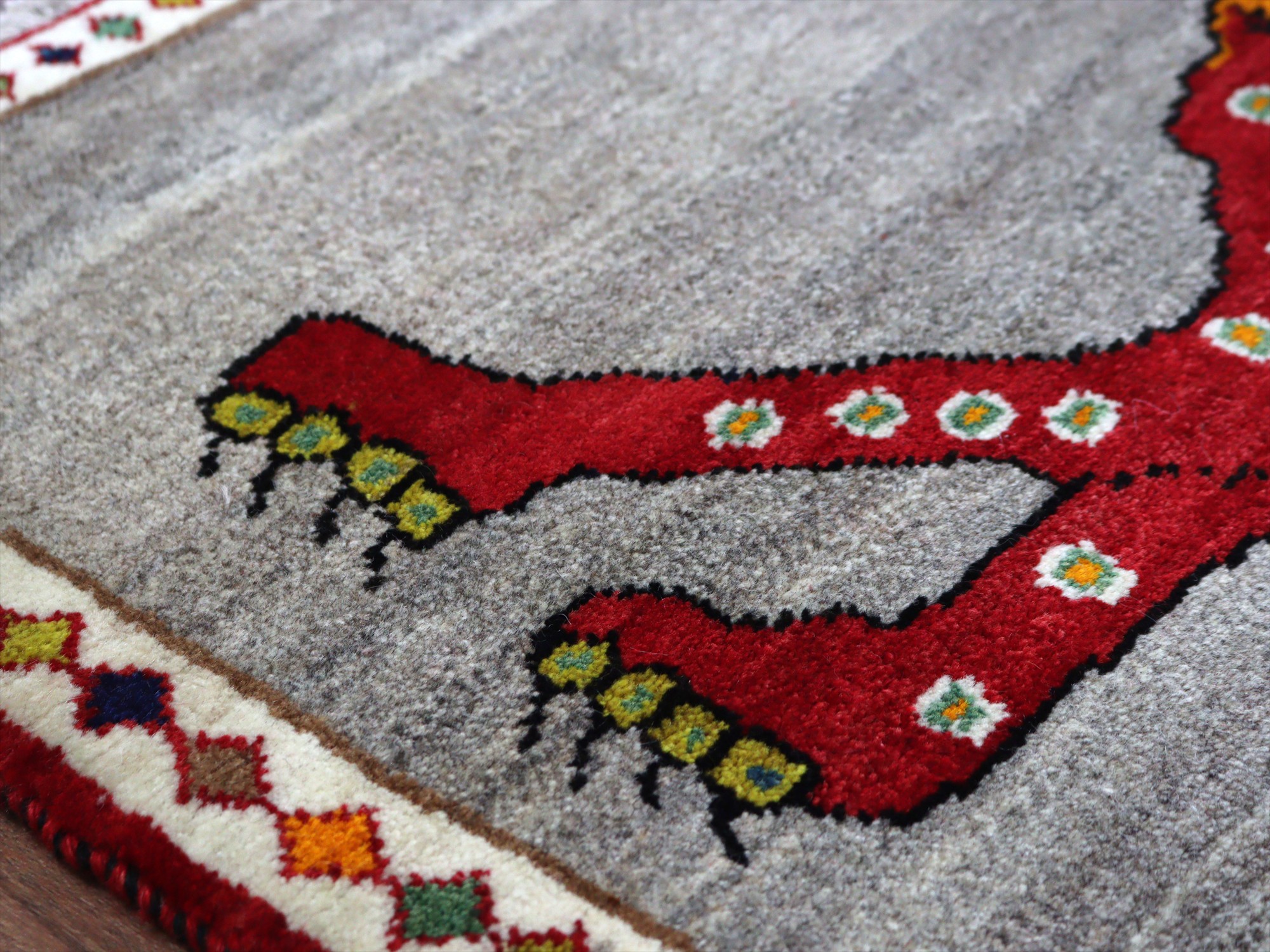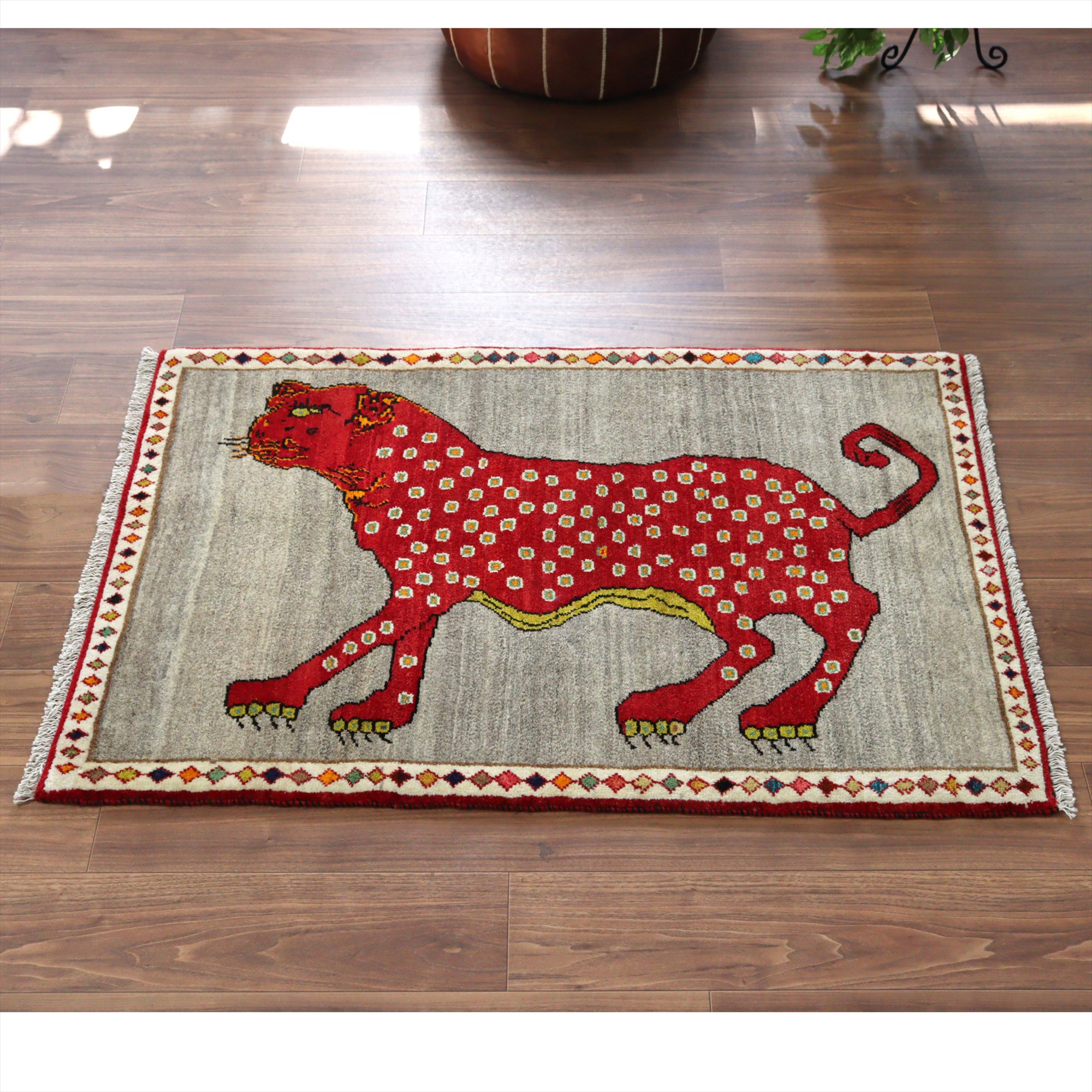 カシュカイ族の象徴でもあるライオンとともに、よく登場するヒョウのデザイン(メスのライオンとも言われています)。グレーの水玉模様とクルンと丸まった尻尾がオシャレです。
