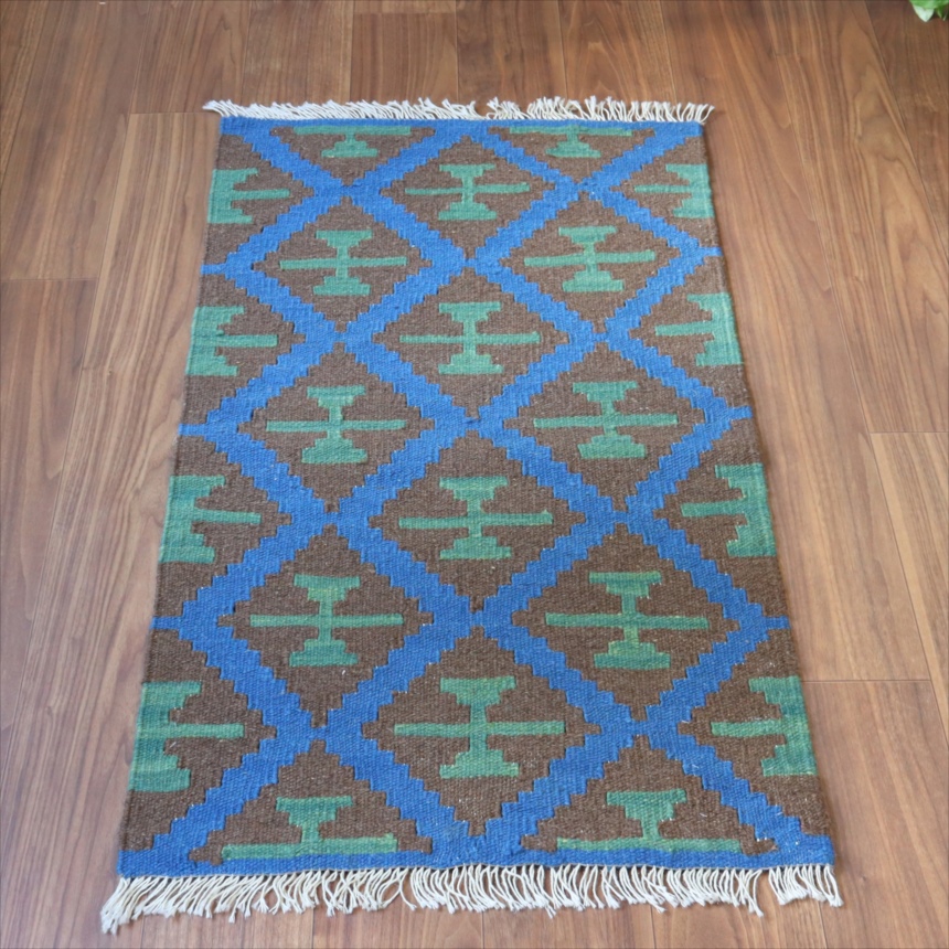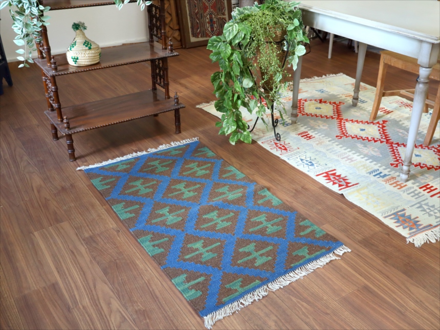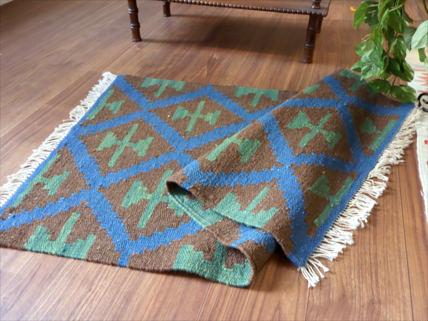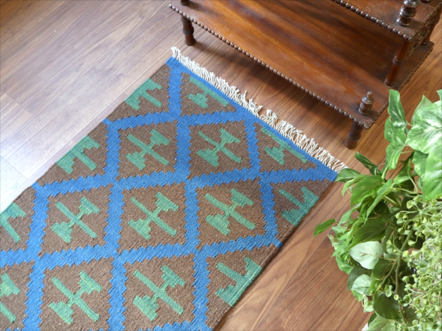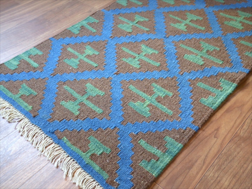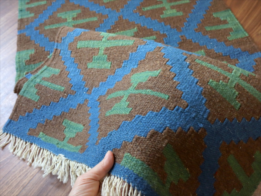 6-7mm程度の厚みがあり、パイル(毛足)がない平織りの敷物で表面は少しザラっとした肌ざわりです。織り手の自由なアイデアでデザインされていますので、左右対象でなかったり、モチーフが少しずれていたりということもありますが、世界で一枚だけの作品ですからその点はご了承ください。