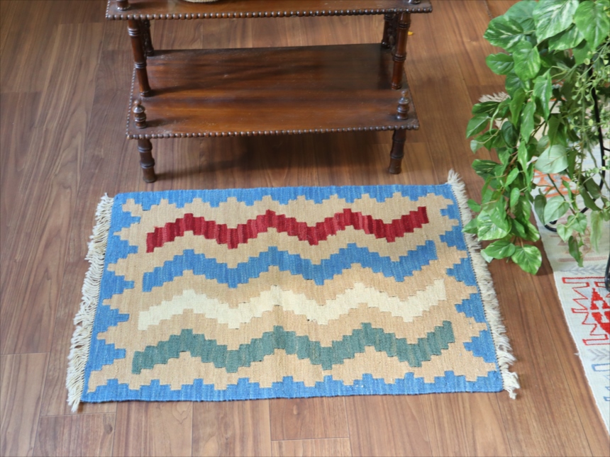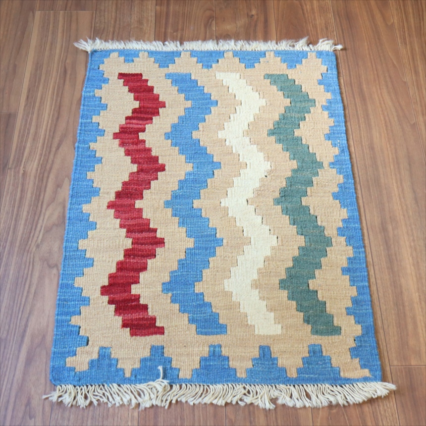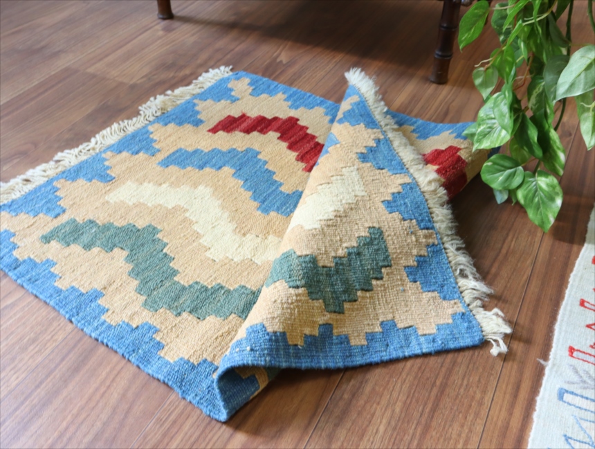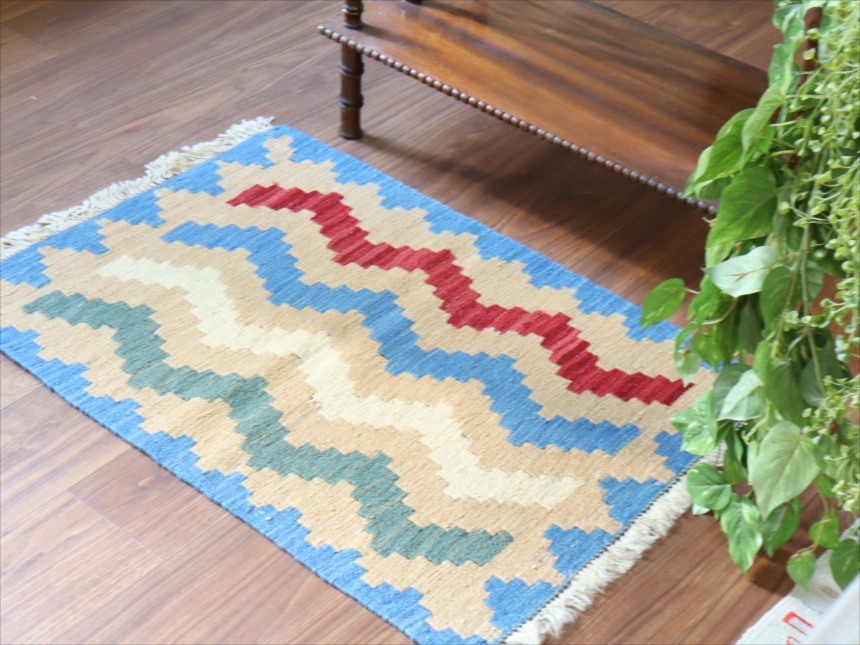 6-7mm程度の厚みがあり、パイル(毛足)がない平織りの敷物で表面は少しザラっとした肌ざわりです。織り手の自由なアイデアでデザインされていますので、左右対象でなかったり、モチーフが少しずれていたりということもありますが、世界で一枚だけの作品ですからその点はご了承ください。