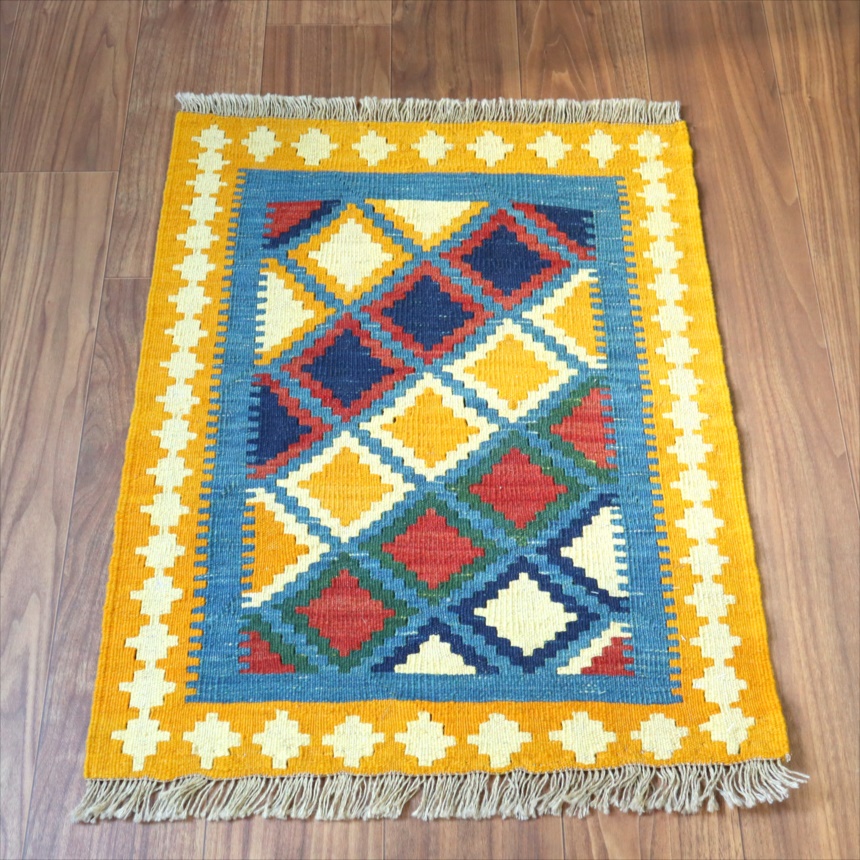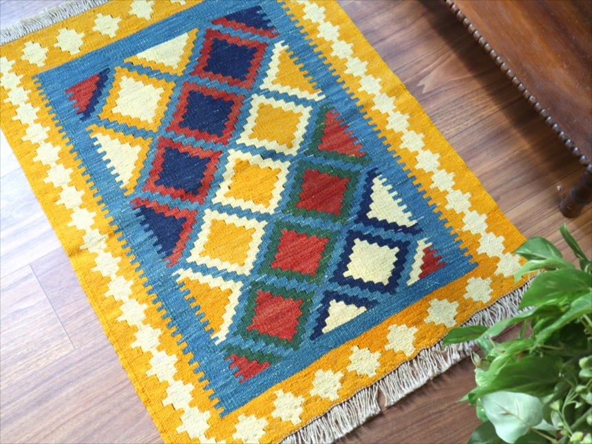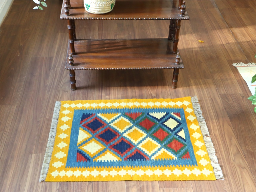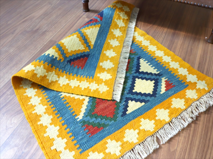 6-7mm程度の厚みがあり、パイル(毛足)がない平織りの敷物で表面は少しザラっとした肌ざわりです。織り手の自由なアイデアでデザインされていますので、左右対象でなかったり、モチーフが少しずれていたりということもありますが、世界で一枚だけの作品ですからその点はご了承ください。