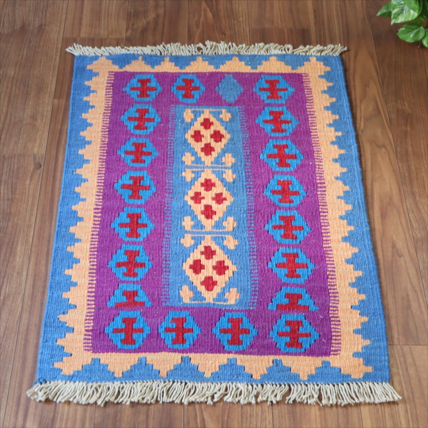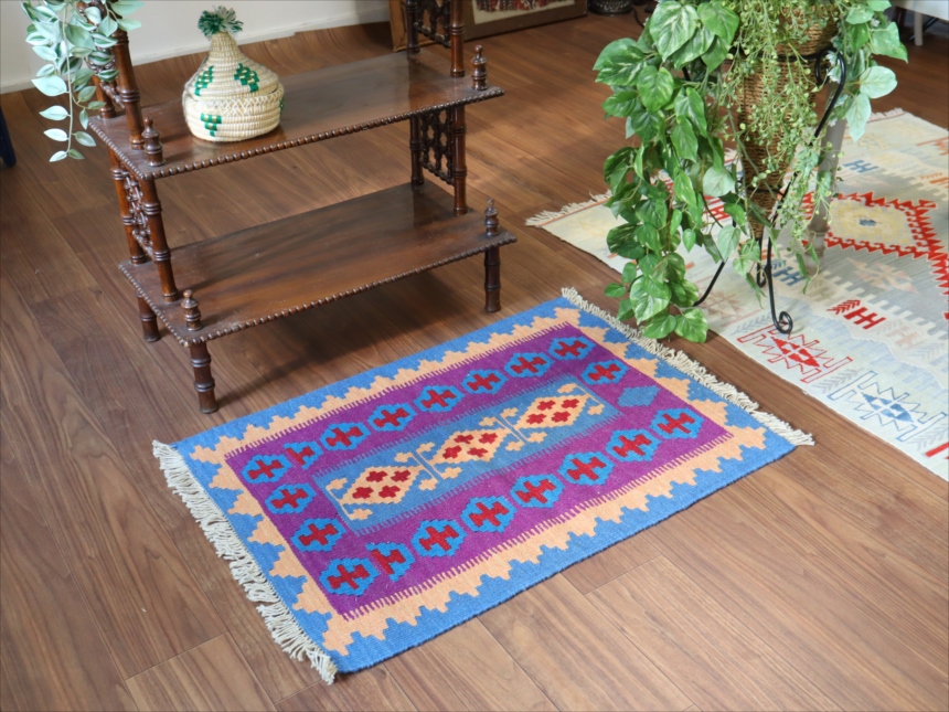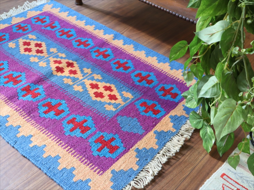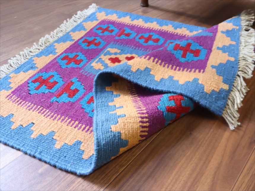 6-7mm程度の厚みがあり、パイル(毛足)がない平織りの敷物で表面は少しザラっとした肌ざわりです。織り手の自由なアイデアでデザインされていますので、左右対象でなかったり、モチーフが少しずれていたりということもありますが、世界で一枚だけの作品ですからその点はご了承ください。