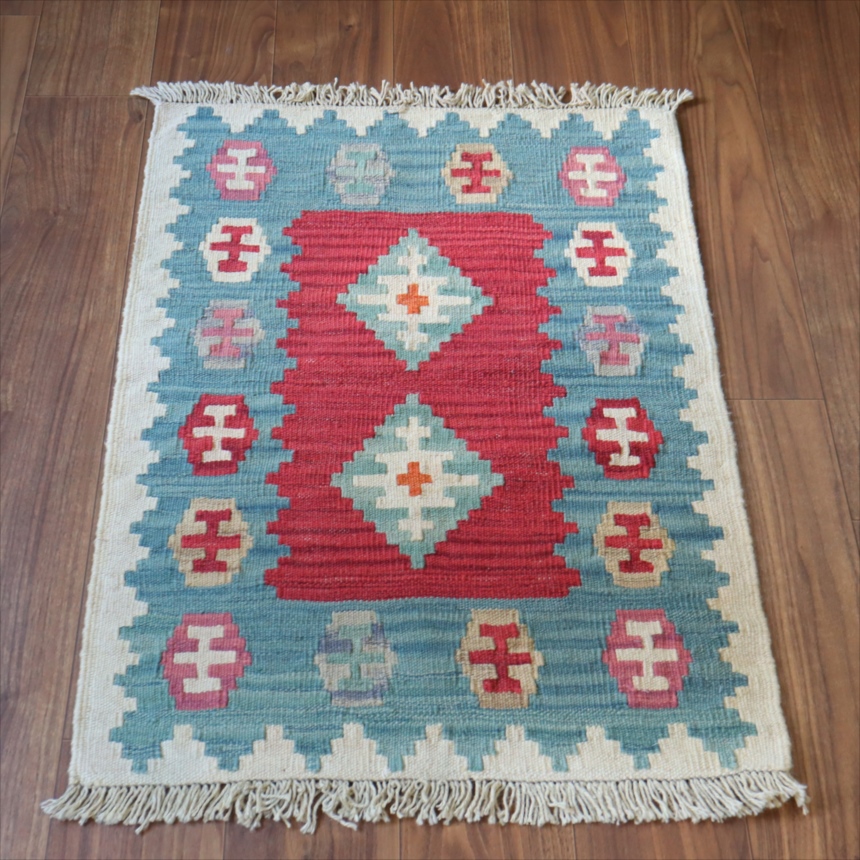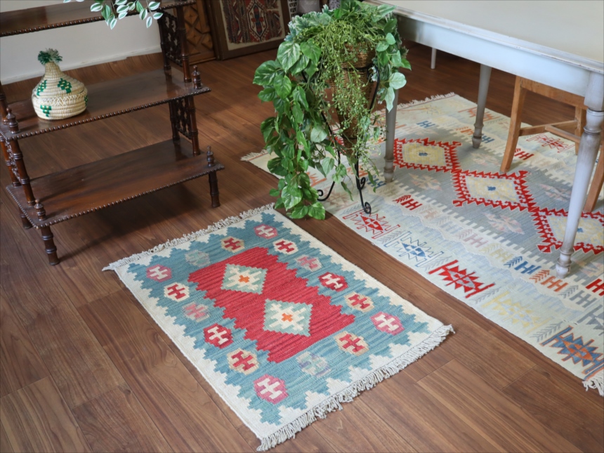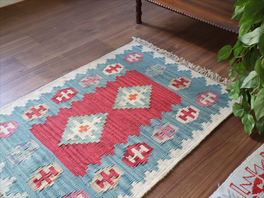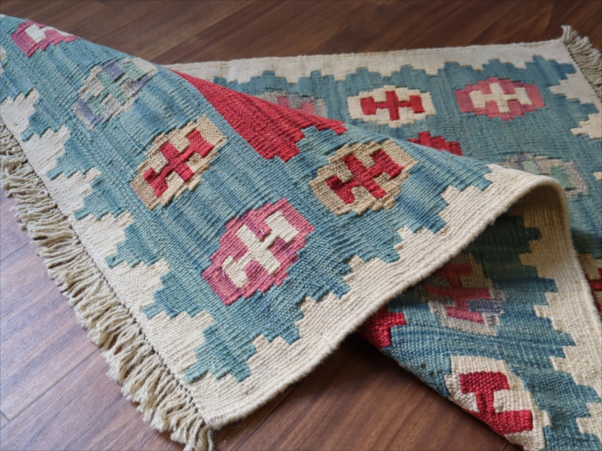 6-7mm程度の厚みがあり、パイル(毛足)がない平織りの敷物で表面は少しザラっとした肌ざわりです。織り手の自由なアイデアでデザインされていますので、左右対象でなかったり、モチーフが少しずれていたりということもありますが、世界で一枚だけの作品ですからその点はご了承ください。