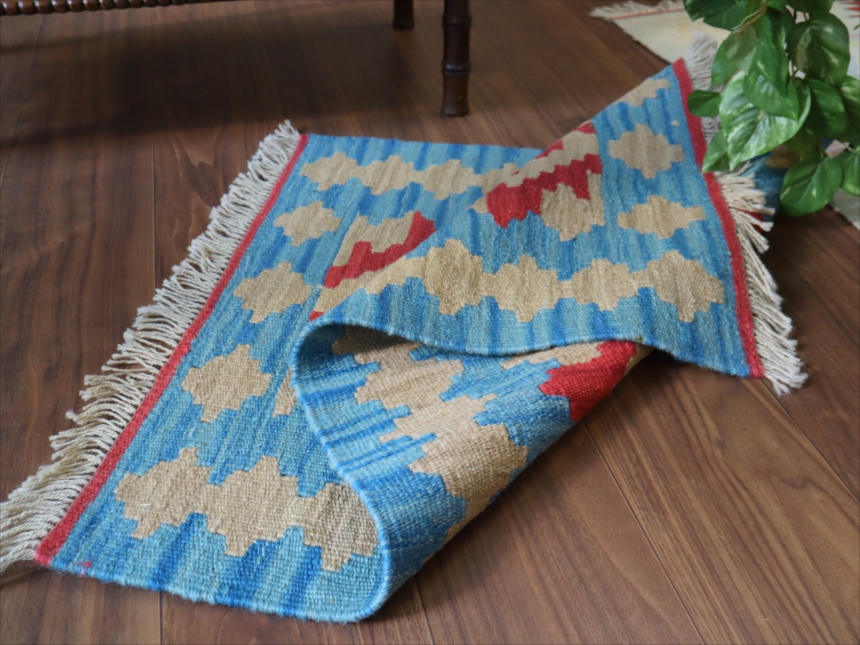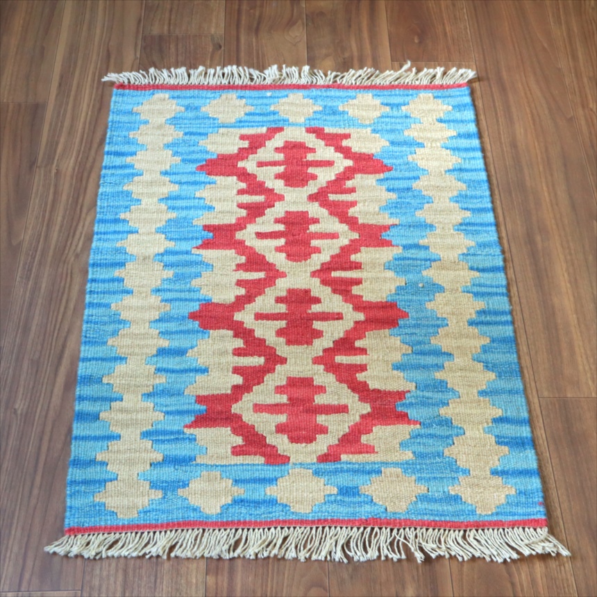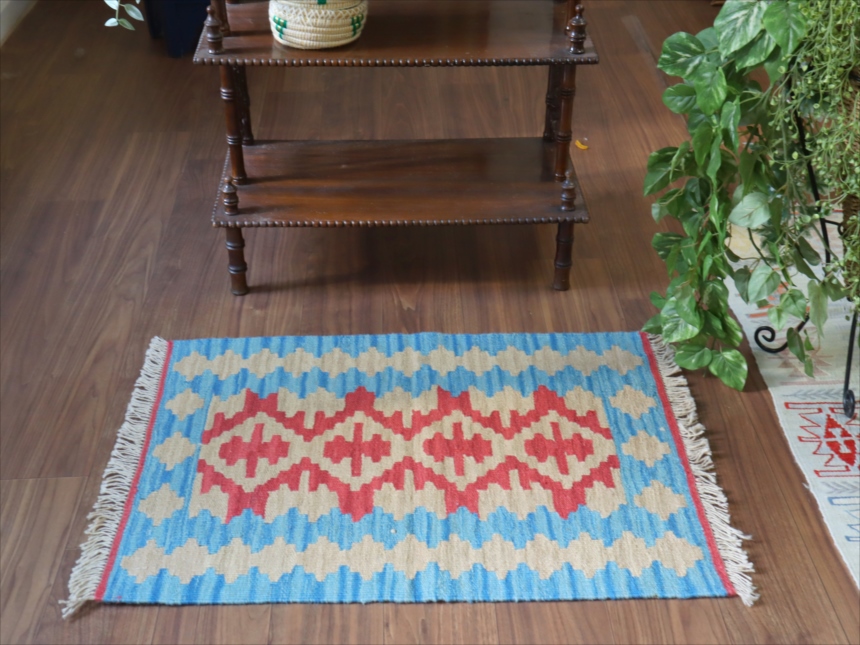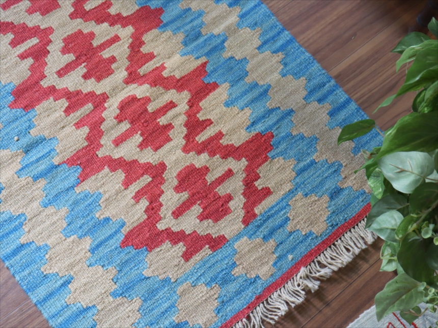 6-7mm程度の厚みがあり、パイル(毛足)がない平織りの敷物で表面は少しザラっとした肌ざわりです。織り手の自由なアイデアでデザインされていますので、左右対象でなかったり、モチーフが少しずれていたりということもありますが、世界で一枚だけの作品ですからその点はご了承ください。